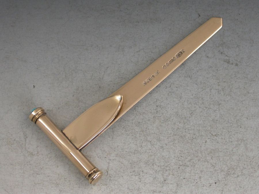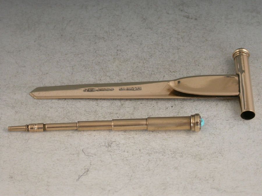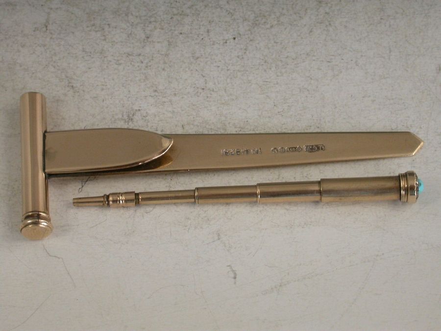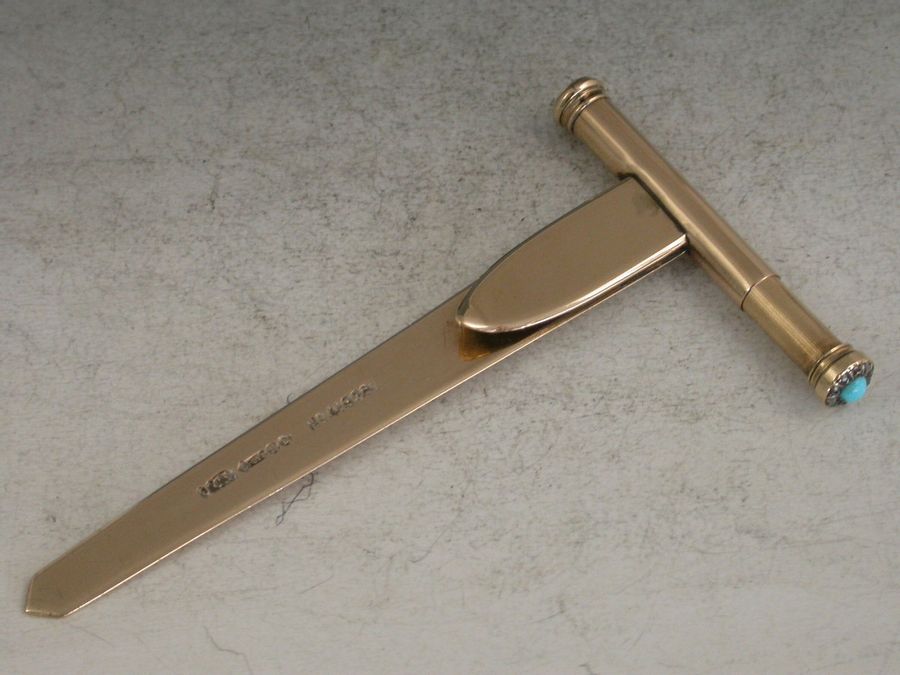 A very fine quality and rare Edwardian 9 carat gold Bookmark combined with a gold Propelling Pencil concealed in the t-bar handle and extending automatically when pulled out, the terminal set with a turquoise stone and diamante chips. The blade of the bookmark hallmarked and also stamped with a registration number 419281.