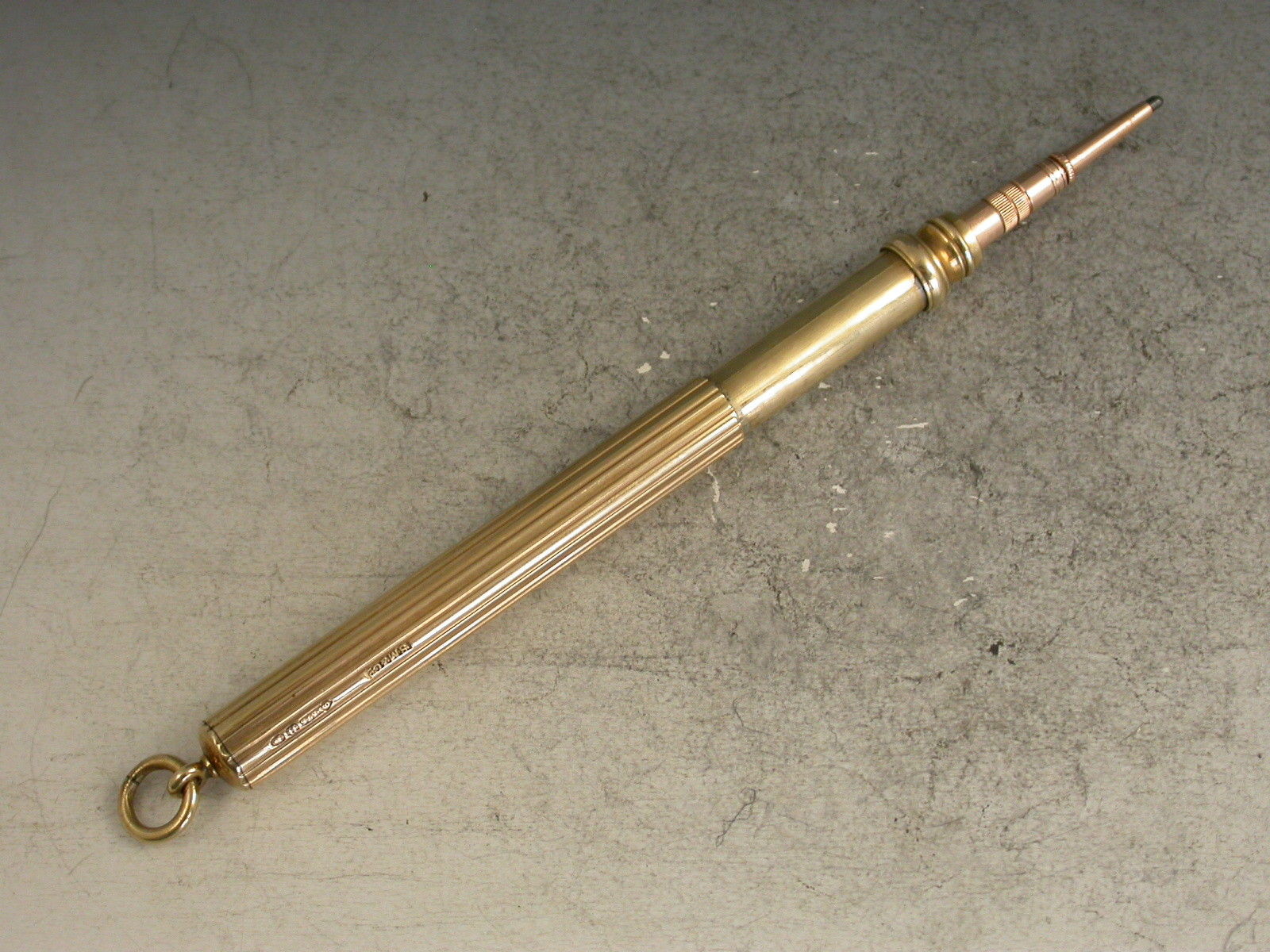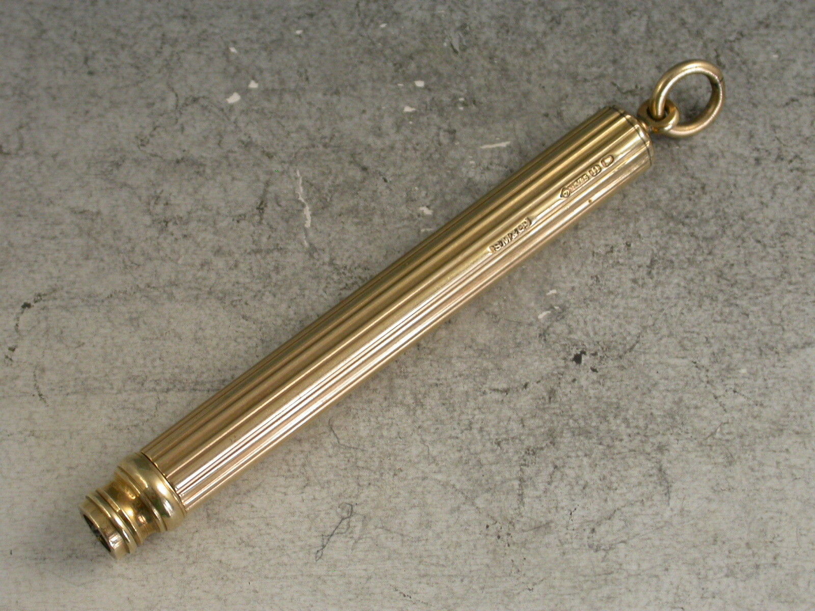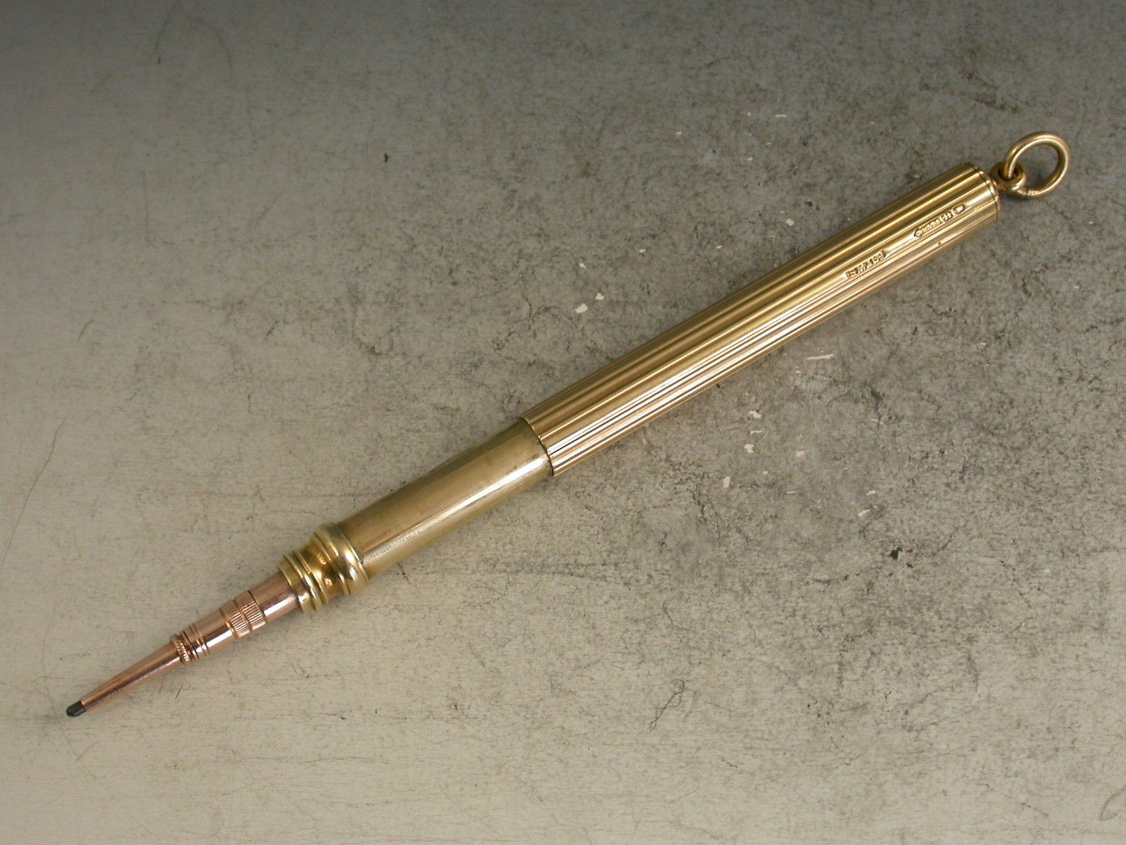 A good quality Edwardian fully hallmarked 9 carat gold Telescopic Propelling Pencil with plain ribbed cylindrical barrel and attached suspension ring.