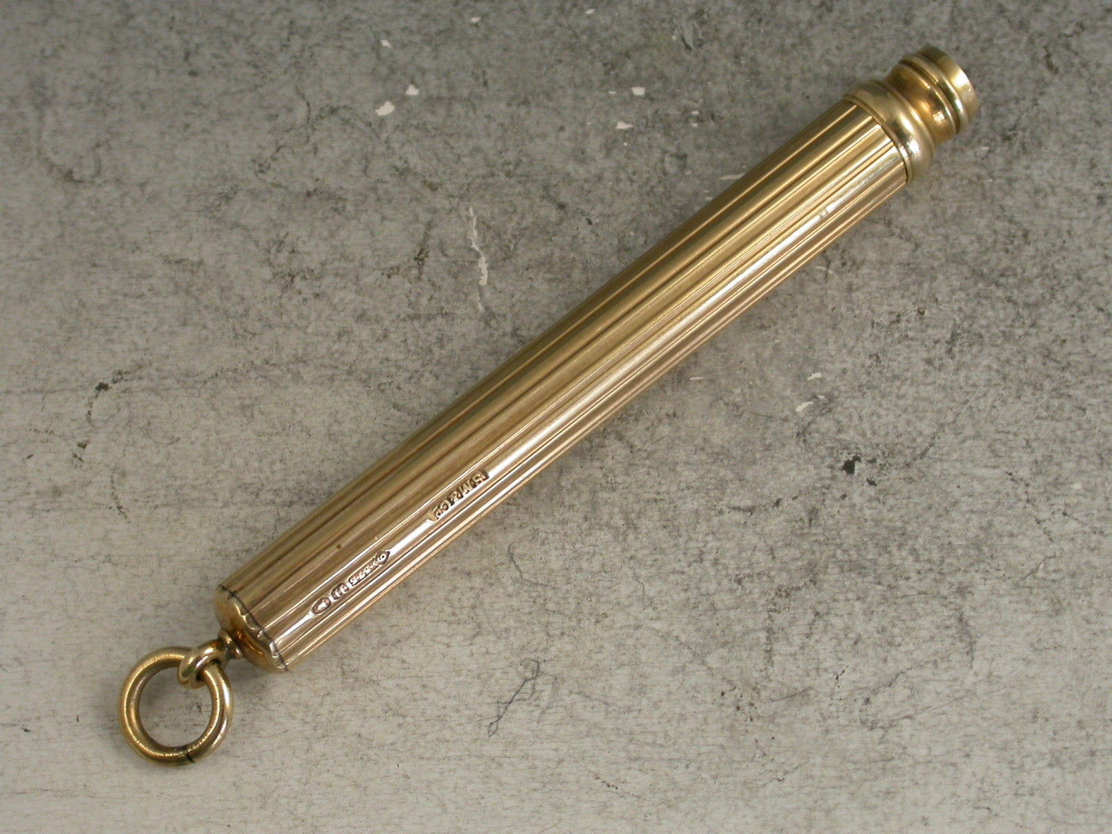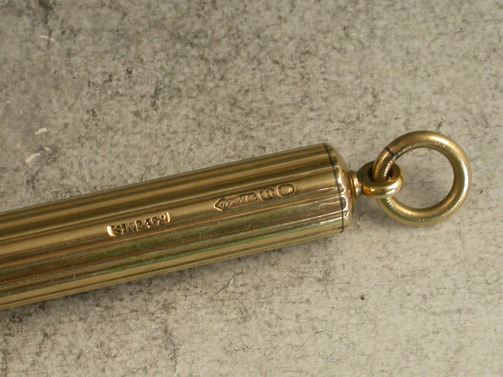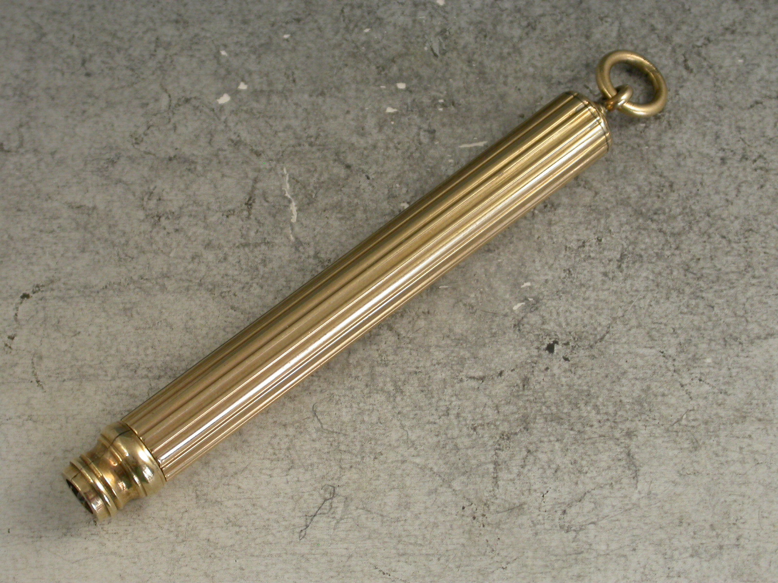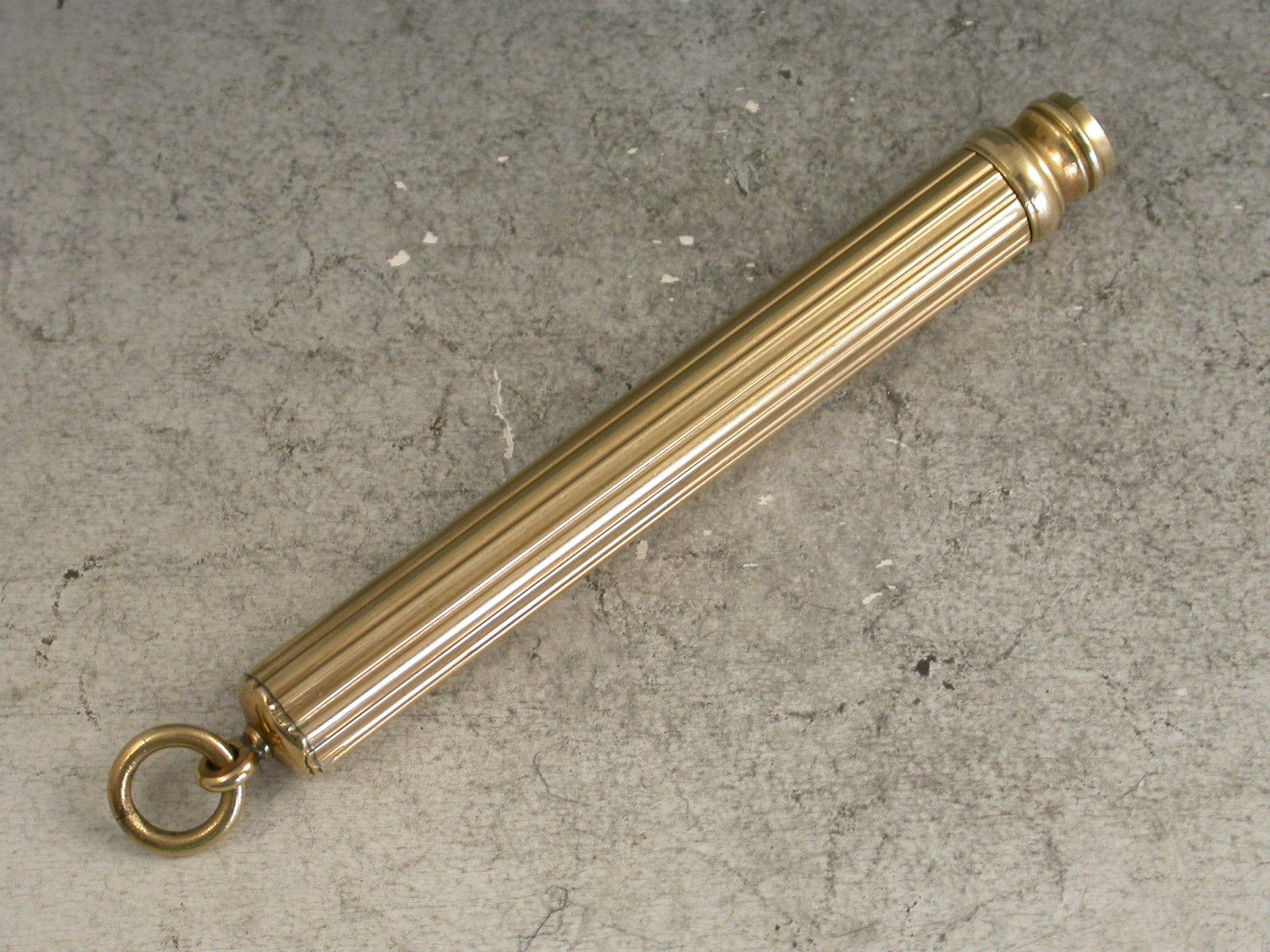 A good quality Edwardian fully hallmarked 9 carat gold Telescopic Propelling Pencil with plain ribbed cylindrical barrel and attached suspension ring.