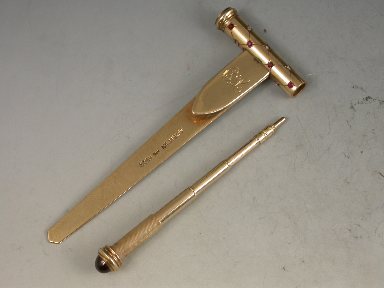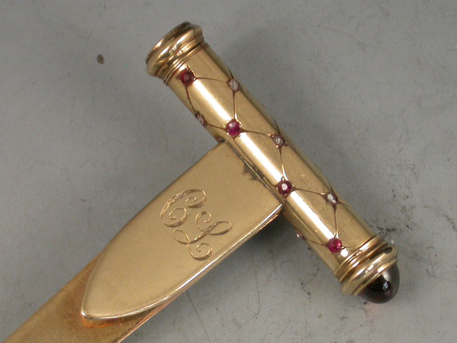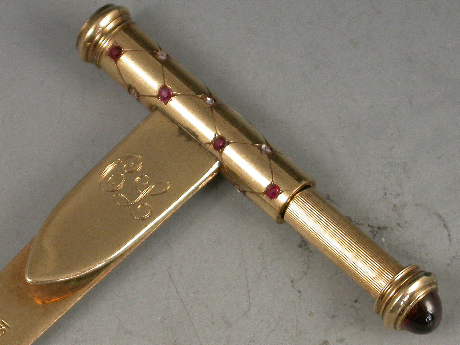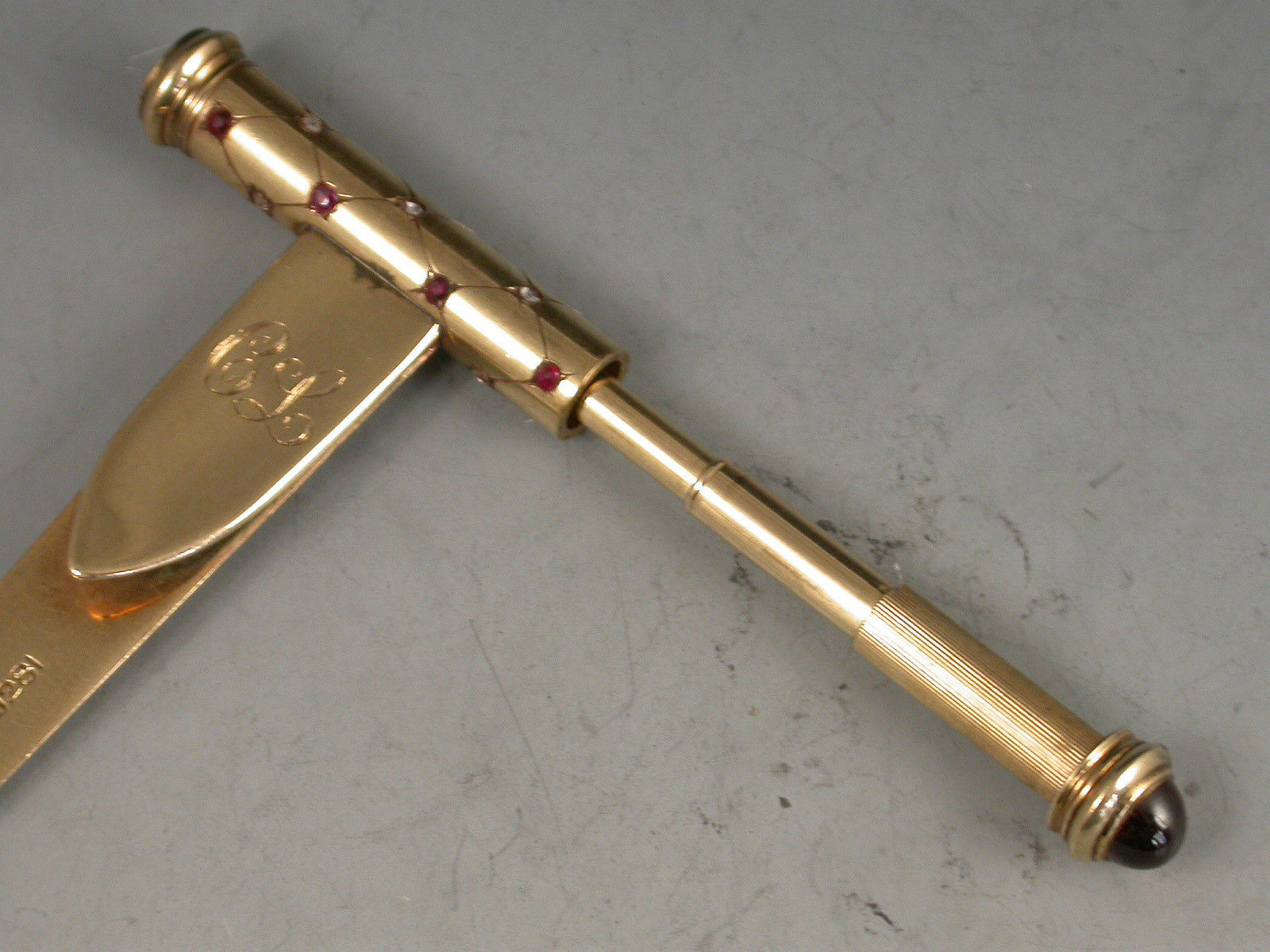 A fine quality Edwardian 9 carat gold combination Bookmark and Propelling Pencil with plain dagger shaped blade, the 'T-bar' handle set with rubies and diamonds and housing a gold telescopic propelling pencil mounted with a cabochon garnet. The clip engraved with contemporary initials 'CL'.
