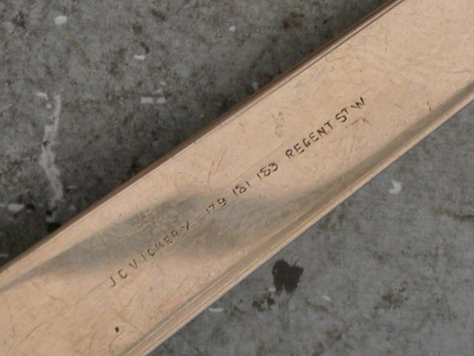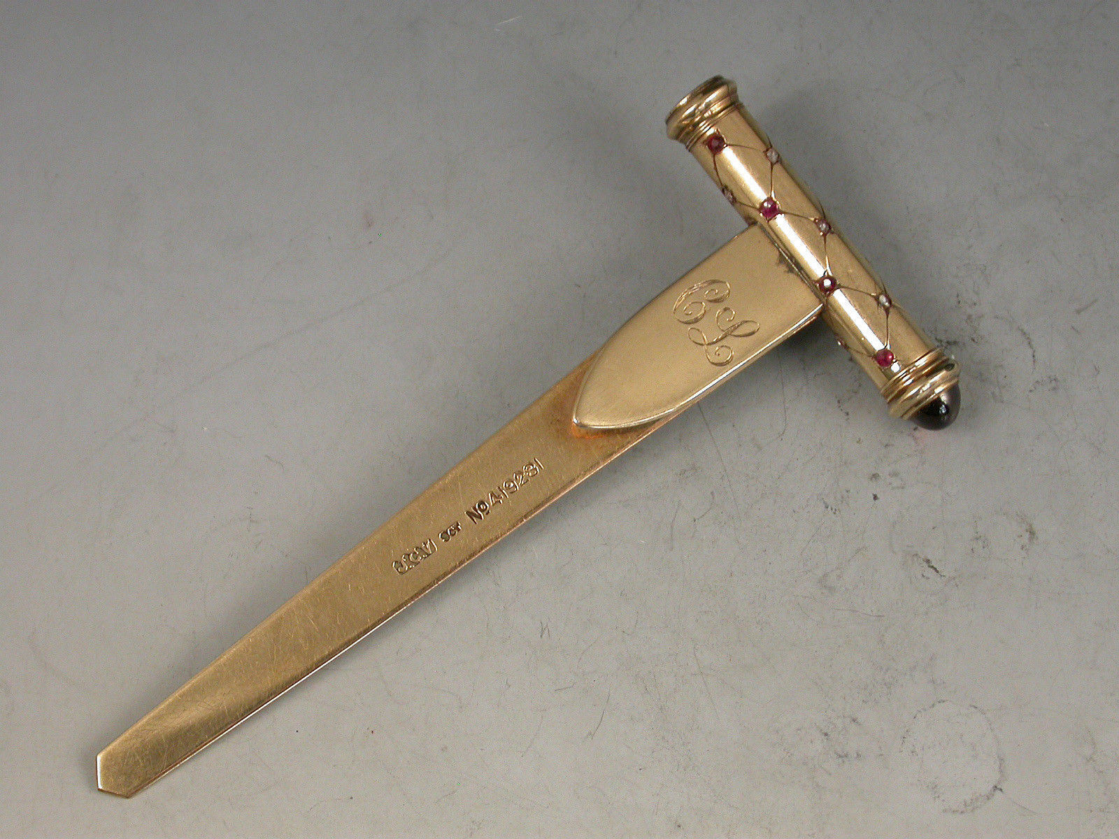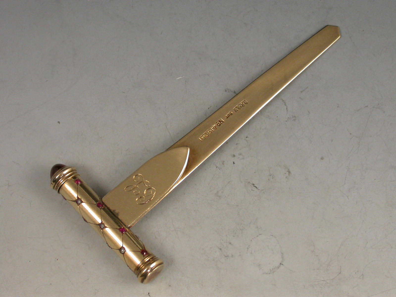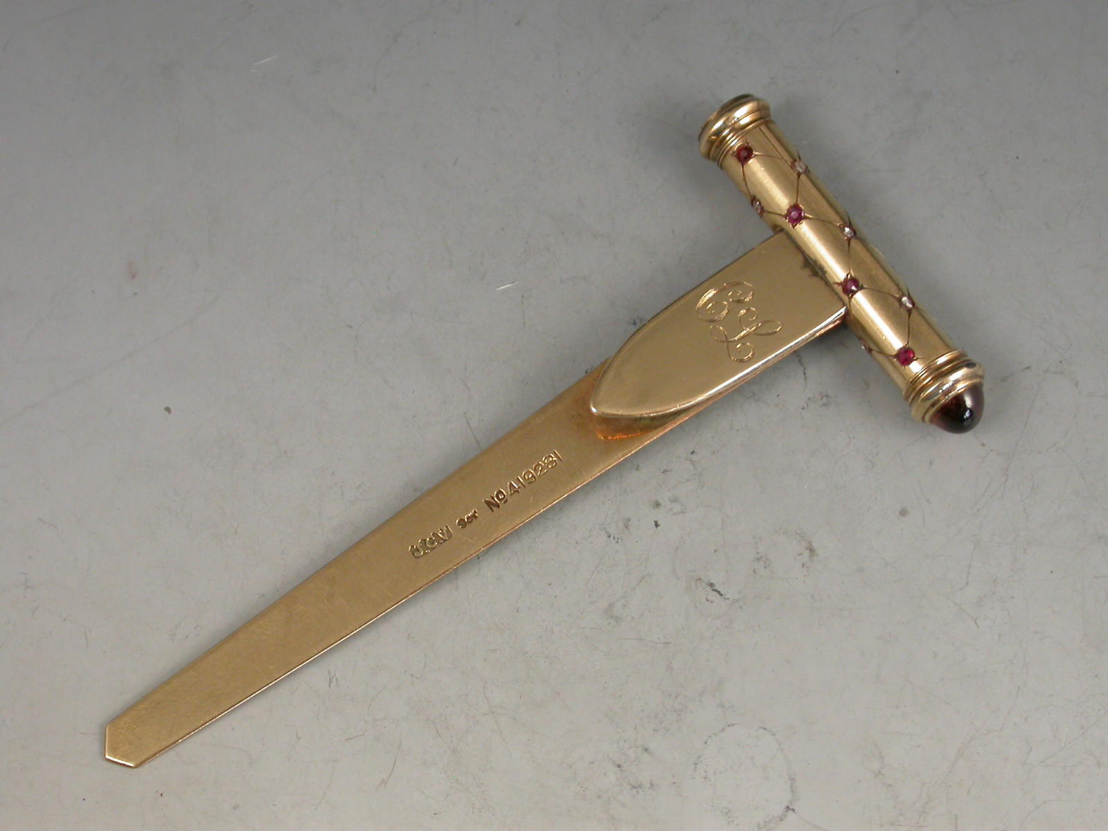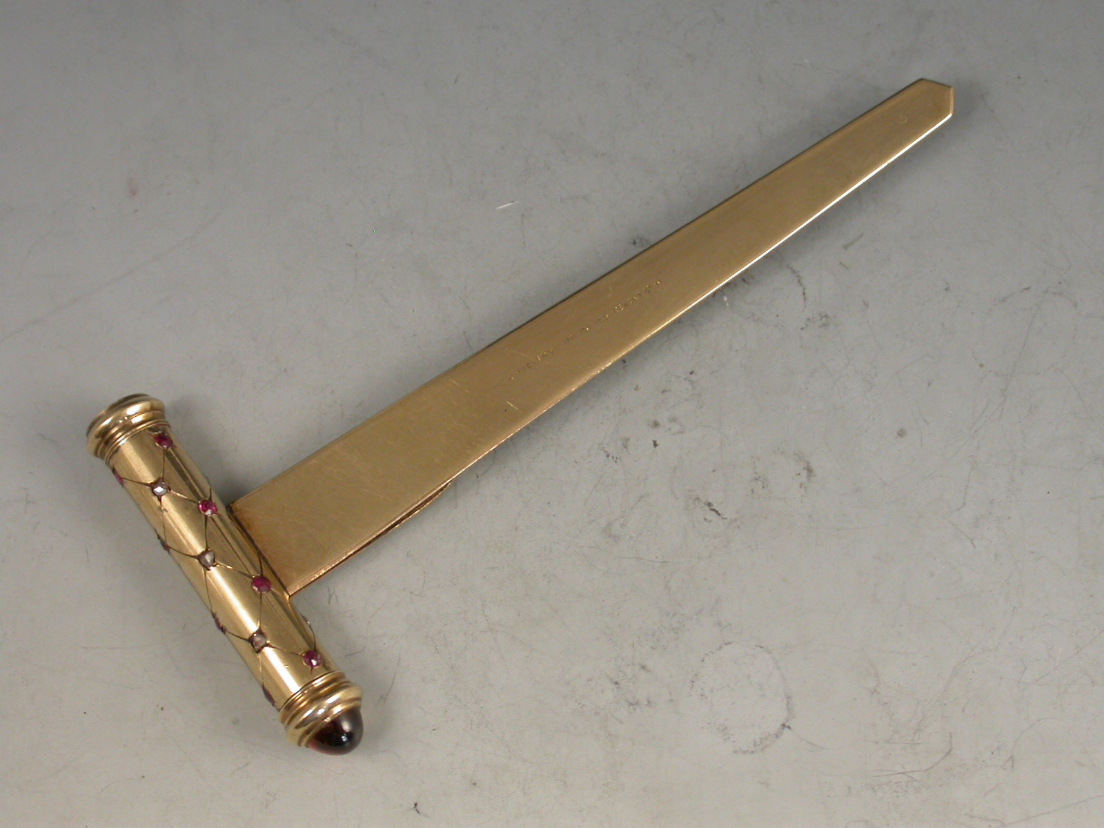 A fine quality Edwardian 9 carat gold combination Bookmark and Propelling Pencil with plain dagger shaped blade, the 'T-bar' handle set with rubies and diamonds and housing a gold telescopic propelling pencil mounted with a cabochon garnet. The clip engraved with contemporary initials 'CL'.