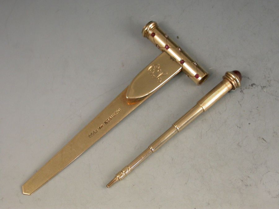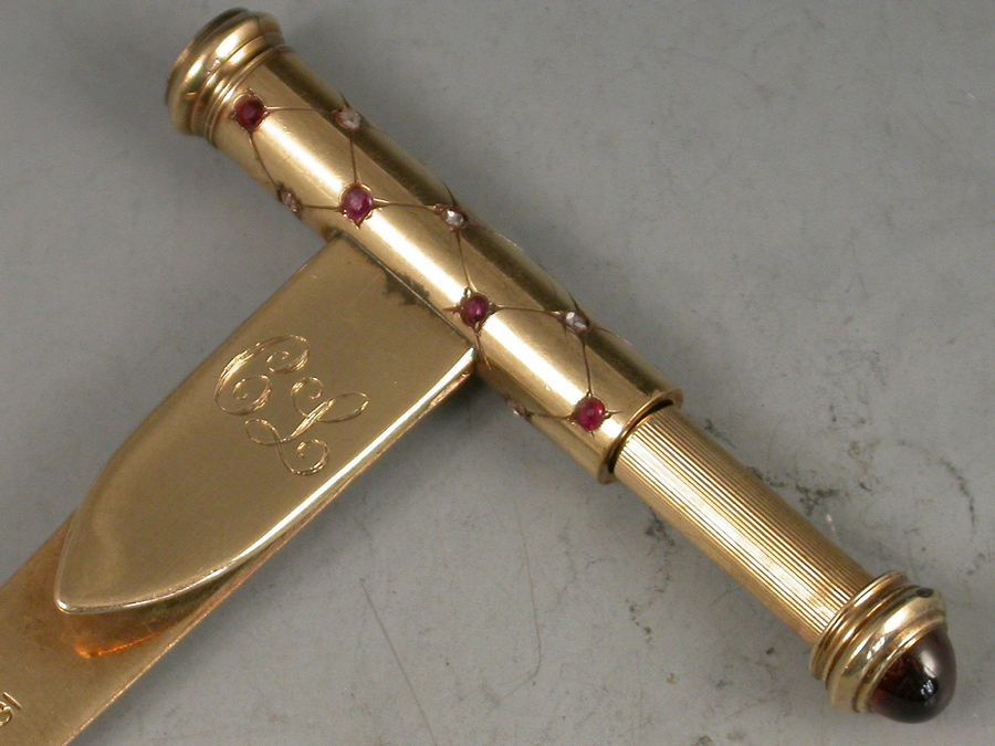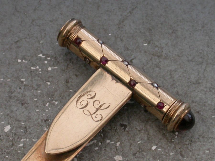 A fine quality Edwardian 9 carat gold combination Bookmark and Propelling Pencil with plain dagger shaped blade, the 'T-bar' handle set with rubies and diamonds and housing a gold telescopic propelling pencil mounted with a cabochon garnet. The clip engraved with contemporary initials 'CL'.