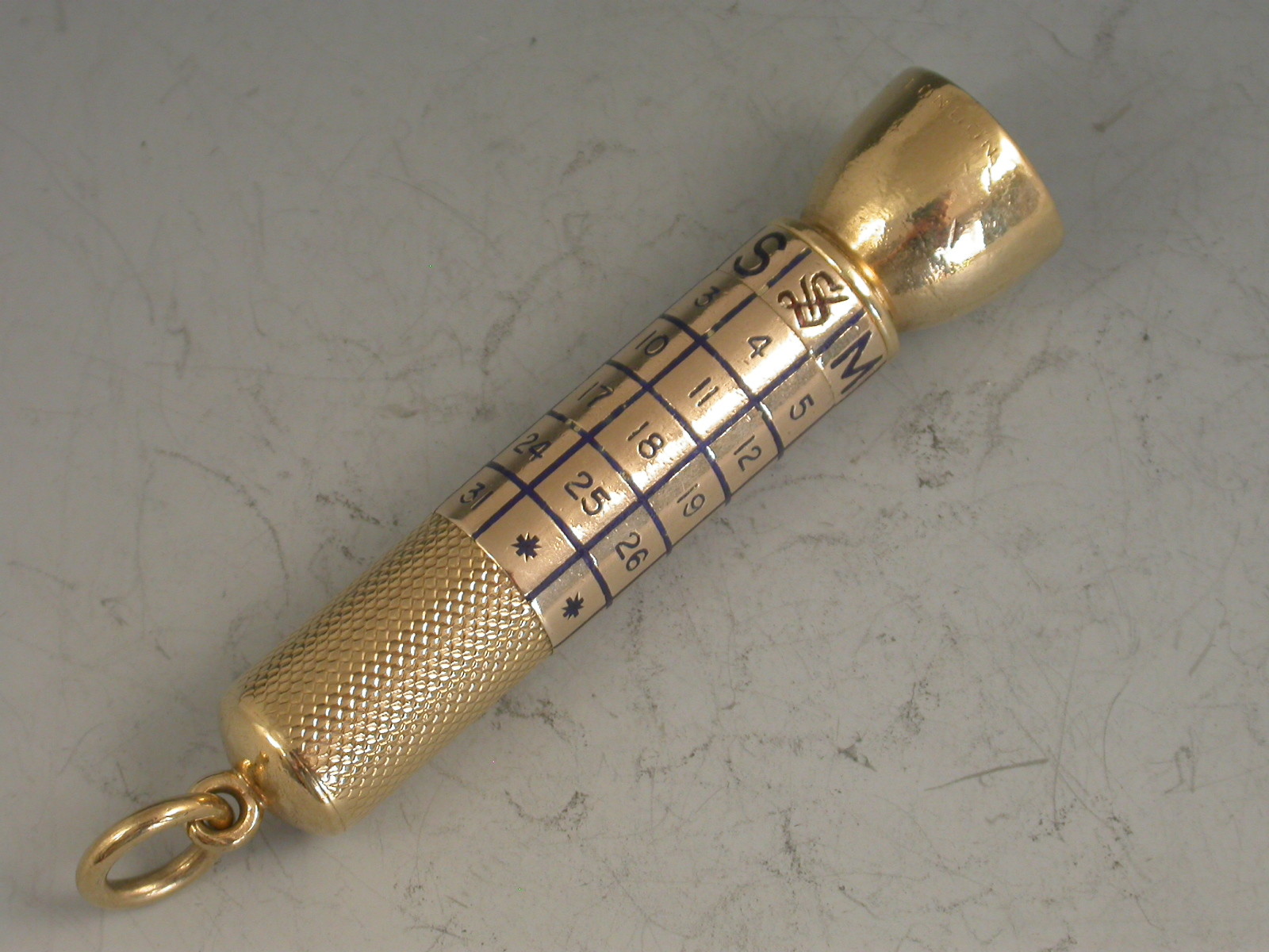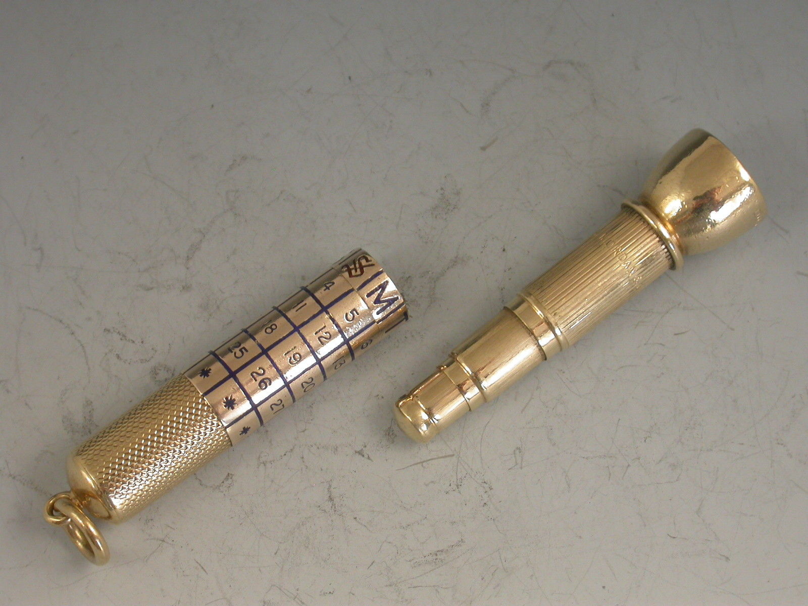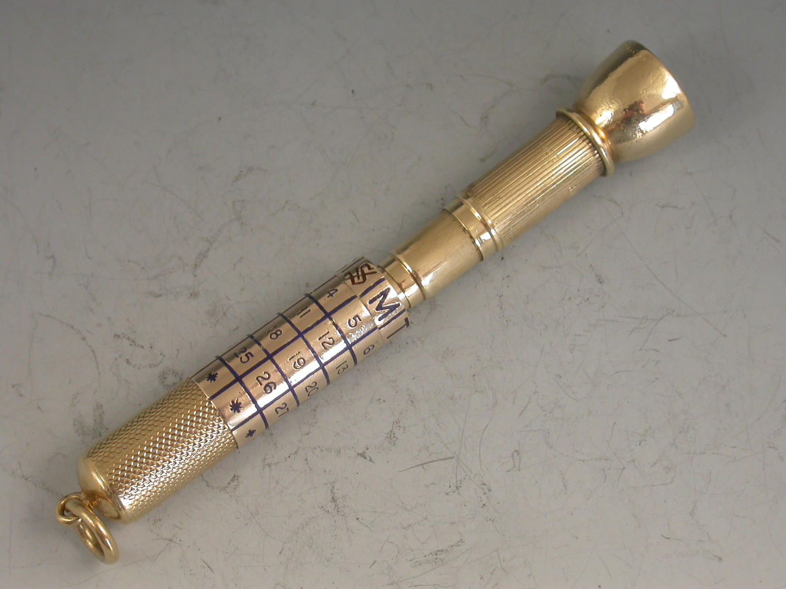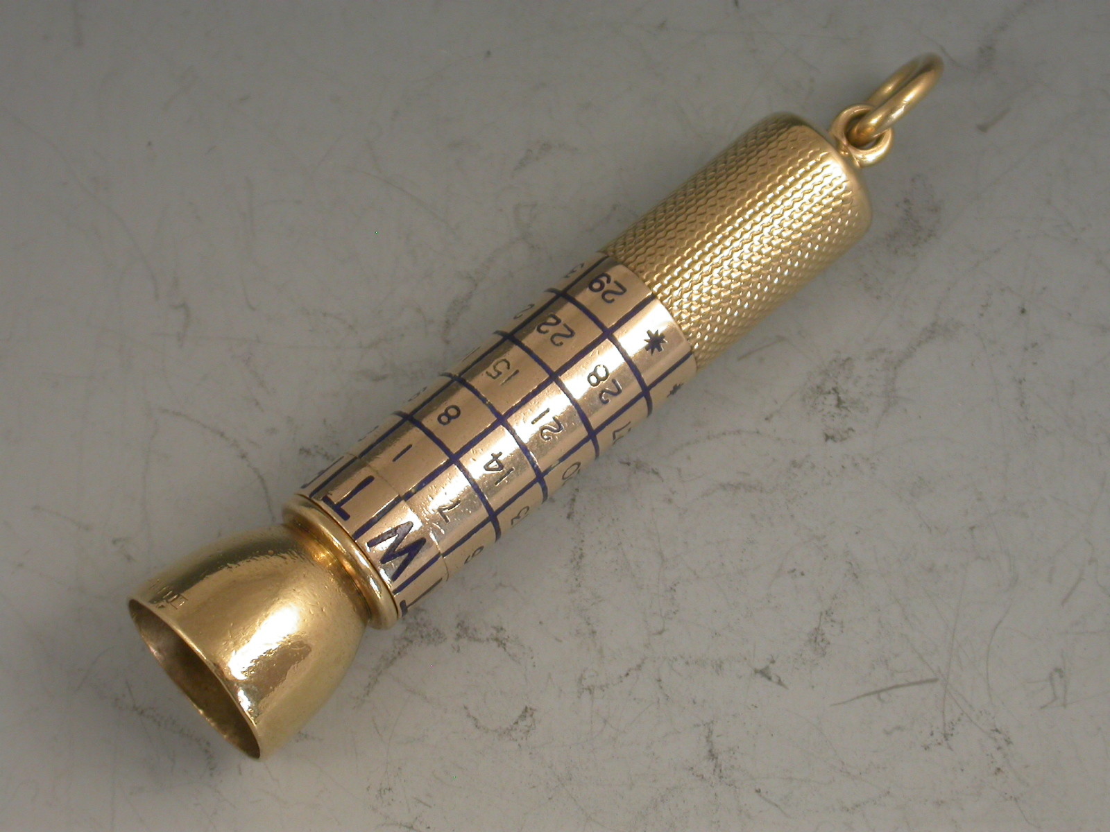 A fine quality Edwardian 9 carat gold combined Perpetual Calender and sprung Cigar Piercer of tubular form with attached suspension ring, the body with enamelled letters and numbers, the cigar piercer with sprung push button mechanism.