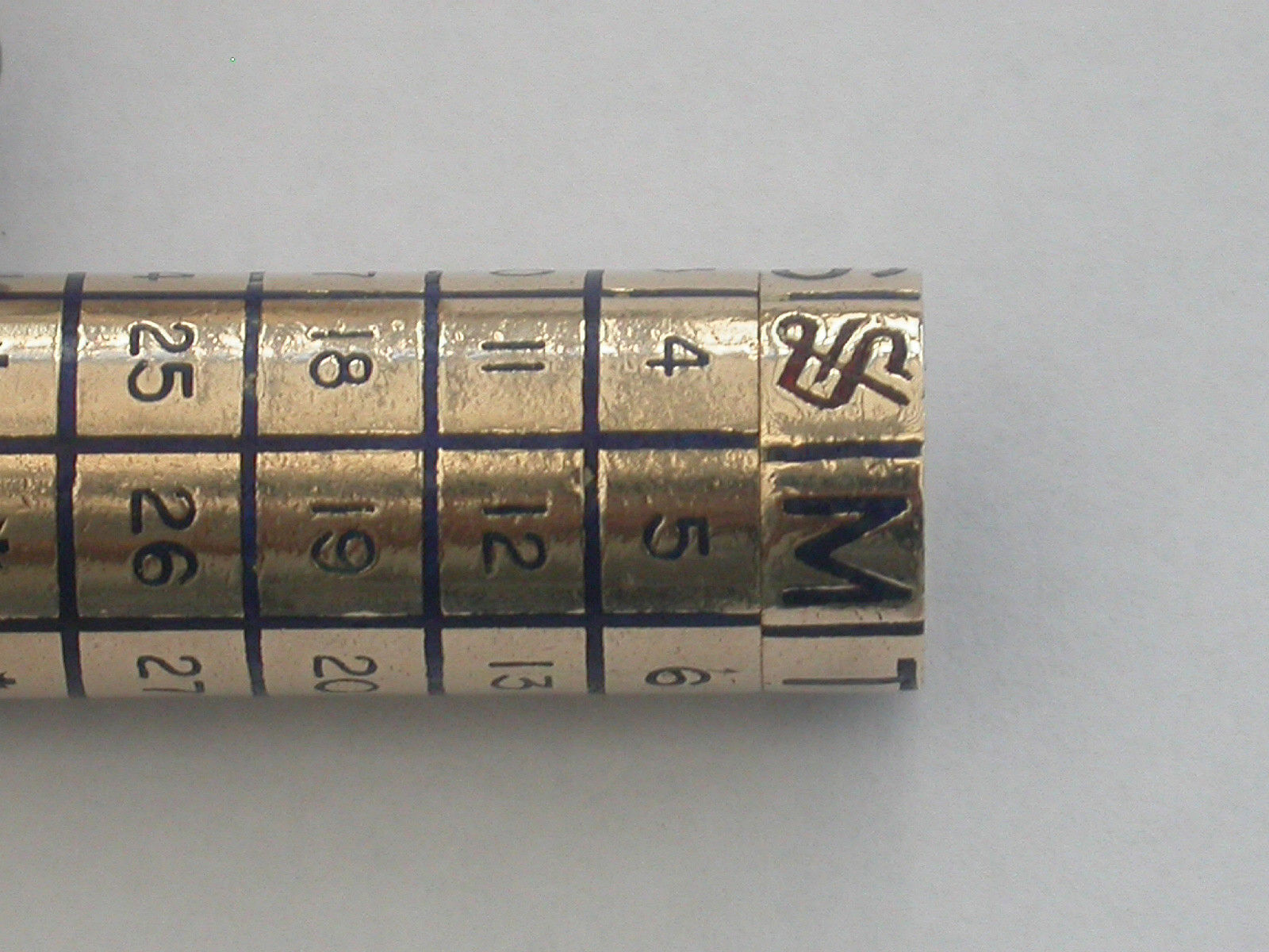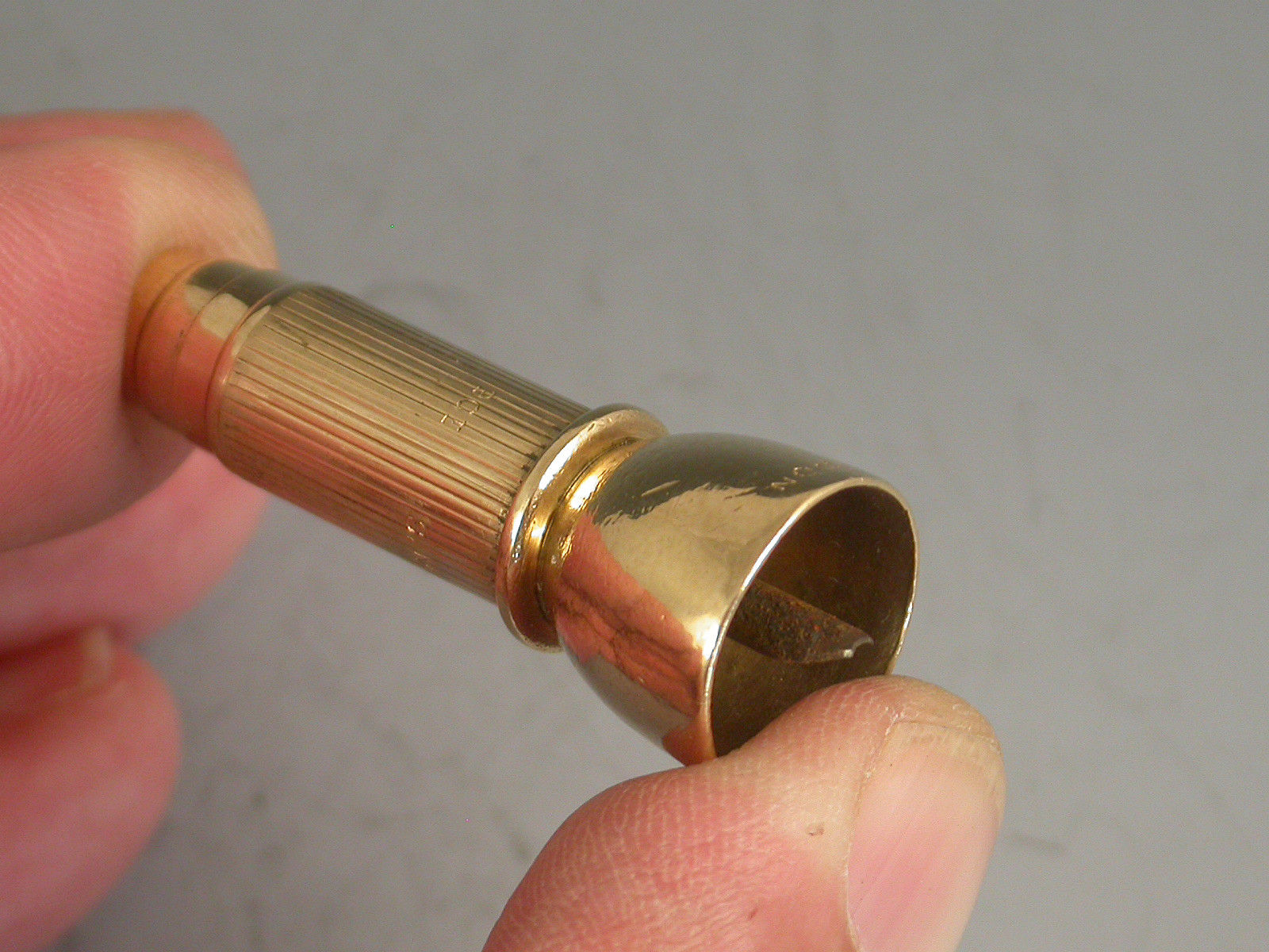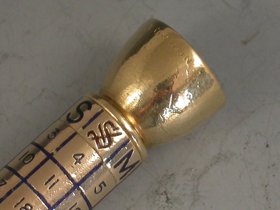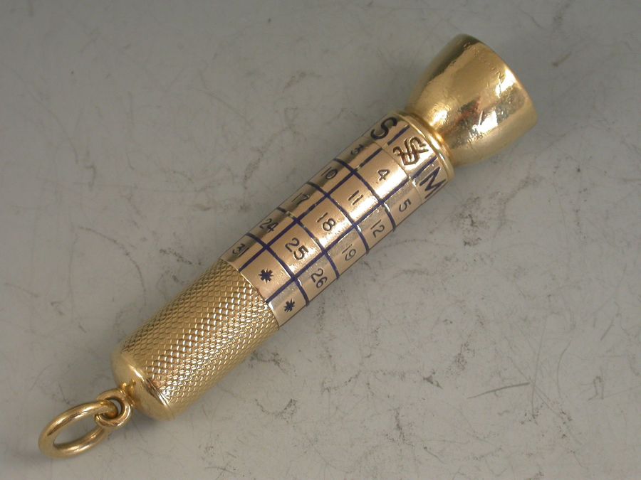 A fine quality Edwardian 9 carat gold combined Perpetual Calender and sprung Cigar Piercer of tubular form with attached suspension ring, the body with enamelled letters and numbers, the cigar piercer with sprung push button mechanism.