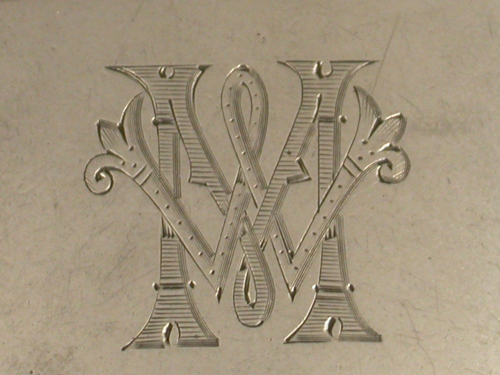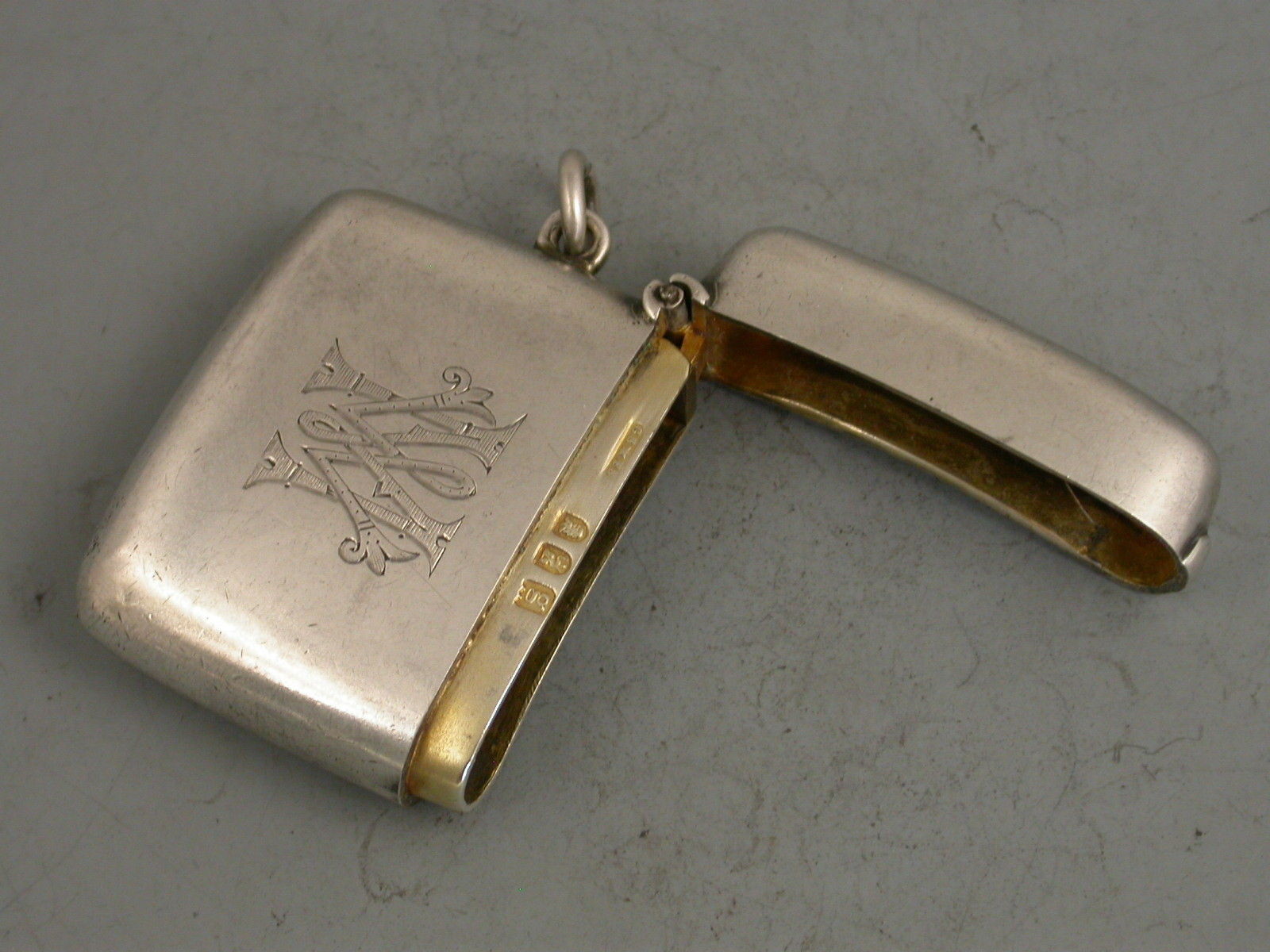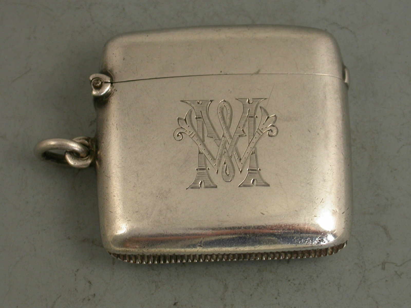 A rare Edwardian silver Vesta Case of standard rounded rectangular form with hinged flip top lid and attached suspension ring. Unusually made from the higher Britannia Standard of silver (95.84%). The face engraved with contemporary initials 'MW'.