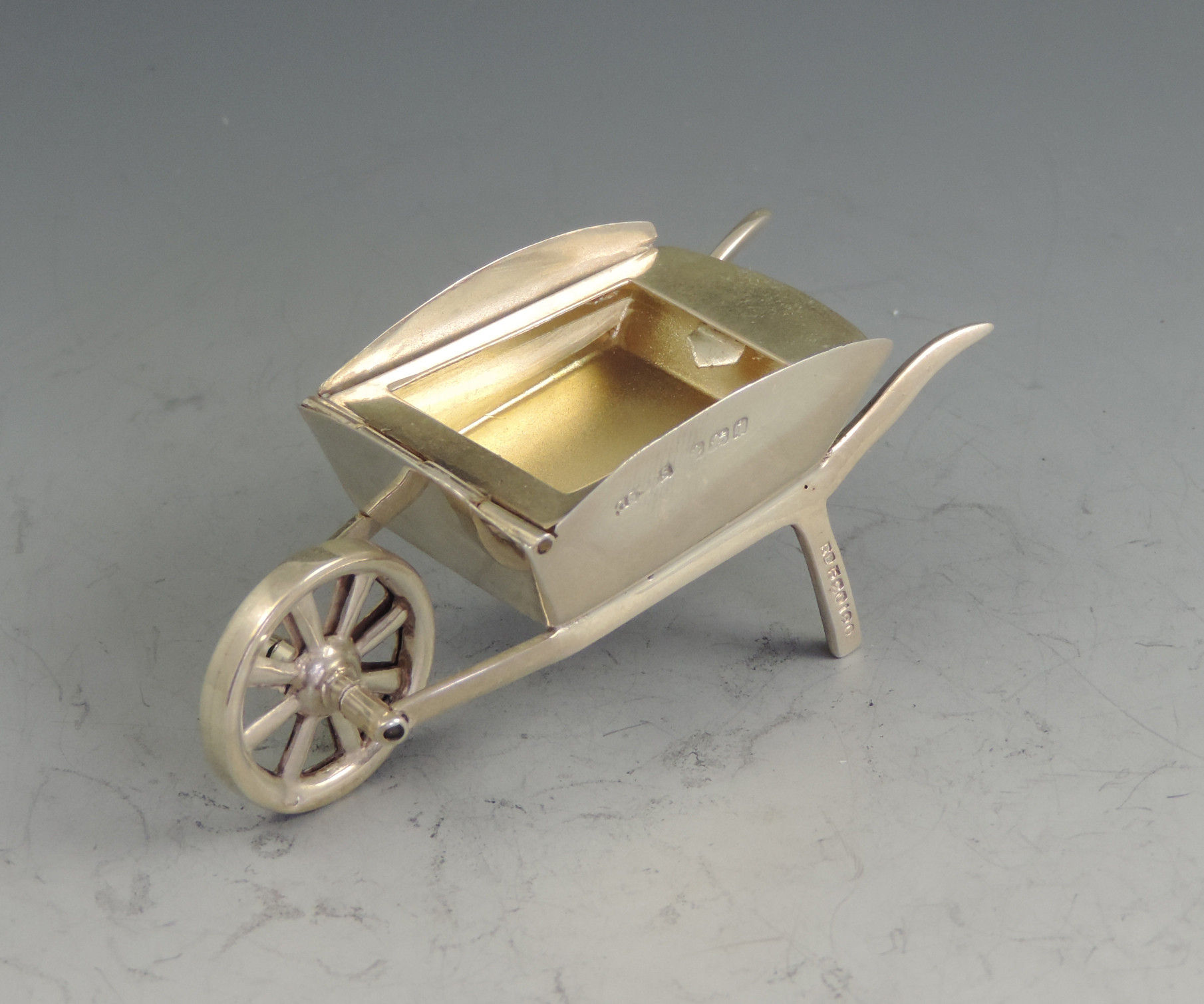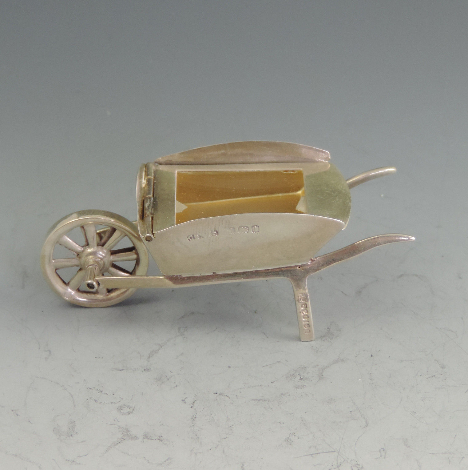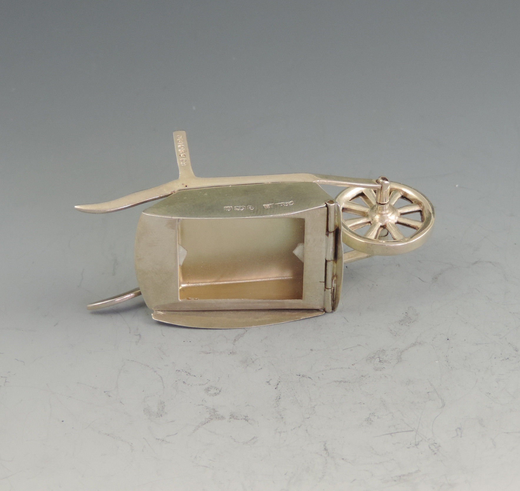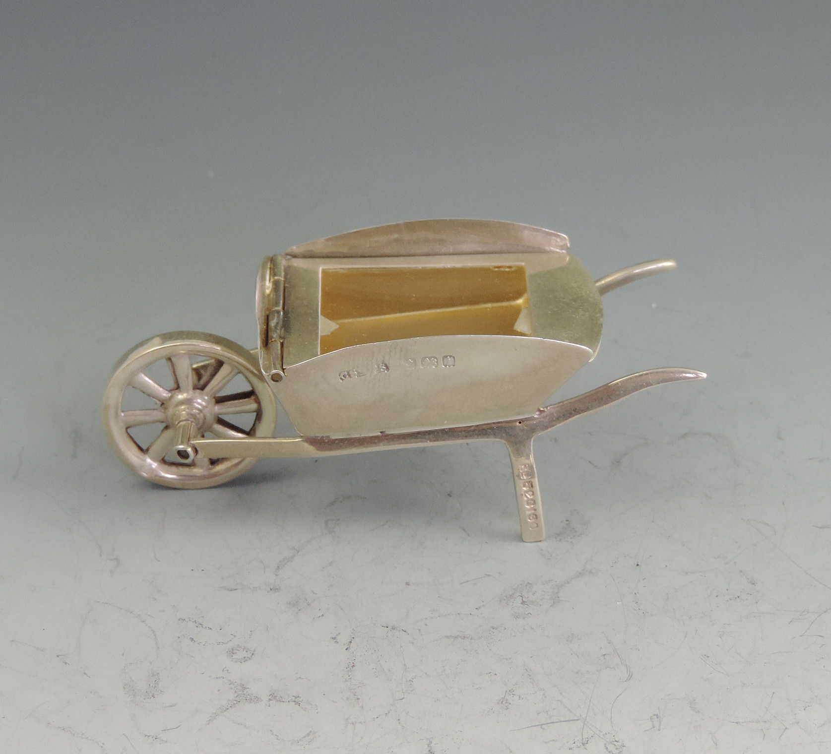 An extremely rare Edwardian novelty silver Stamp Box formed as a Wheel Barrow, the sprung hinged lid with glazed panel, silver gilt interior.