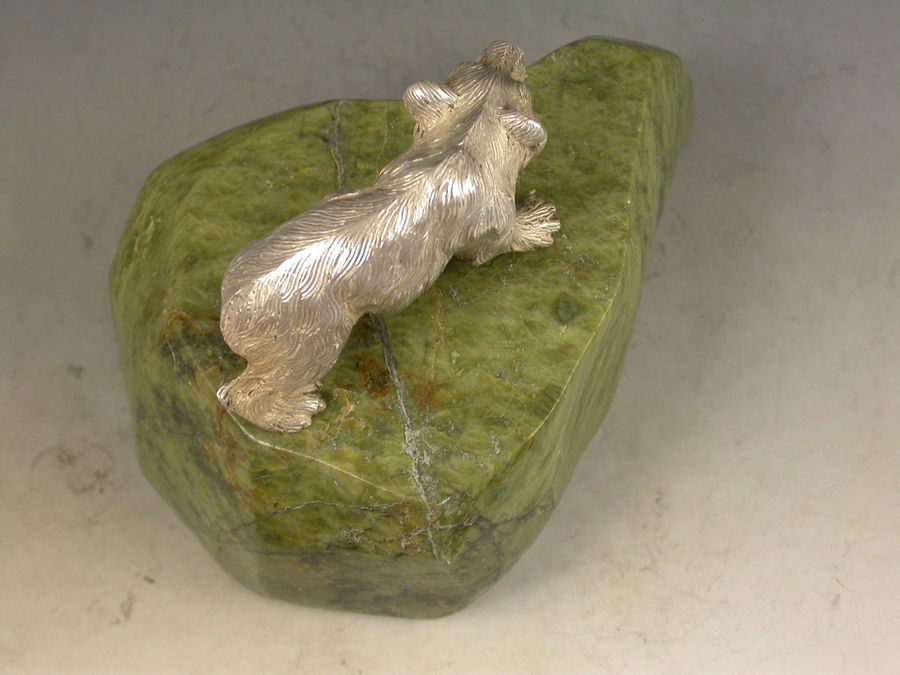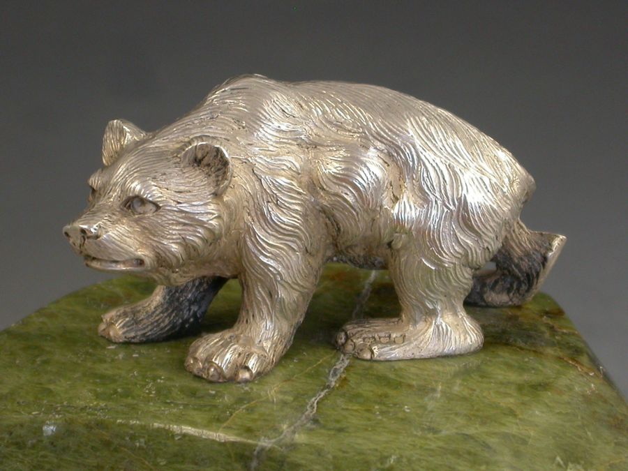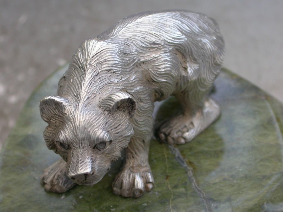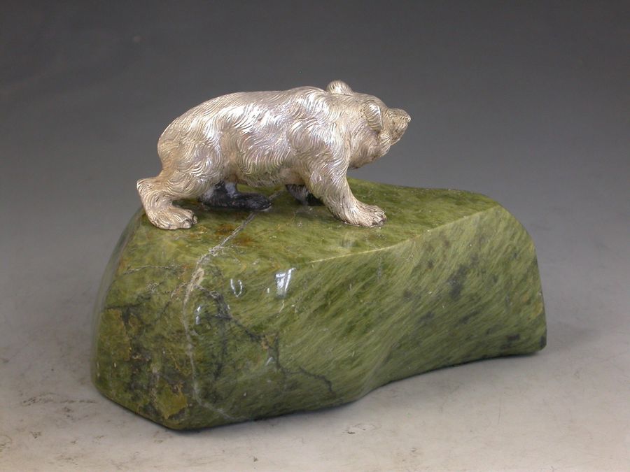 A very fine quality Edwardian cast silver model of a prowling Bear standing on a shaped green Connemara marble base.