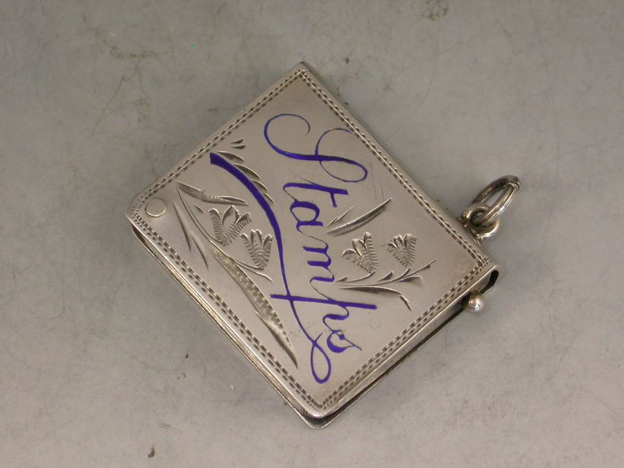 A good George V silver Stamp Case made in the form of a book, the silver gilt interior compartment swiveling open on a retaining pin to one corner, the cover with foliate engraved decoration and the word 'Stamps' highlighted in blue enamel, attached suspension ring.