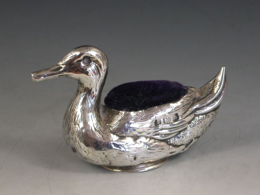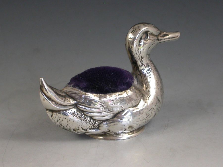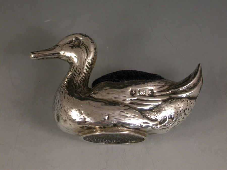 A good Edwardian novelty silver Pin Cushion made in the form of a swimming duck with up-turned tail.