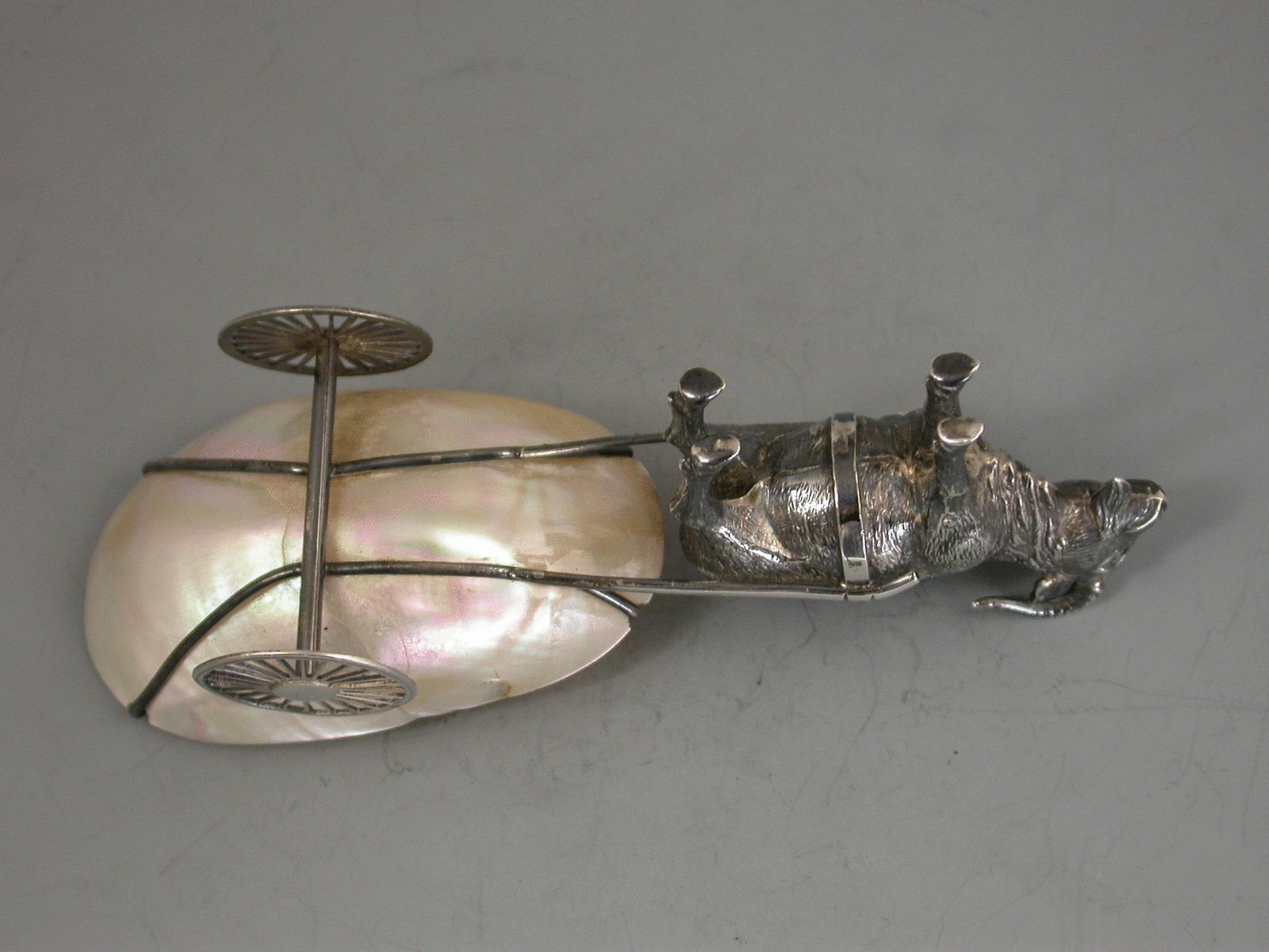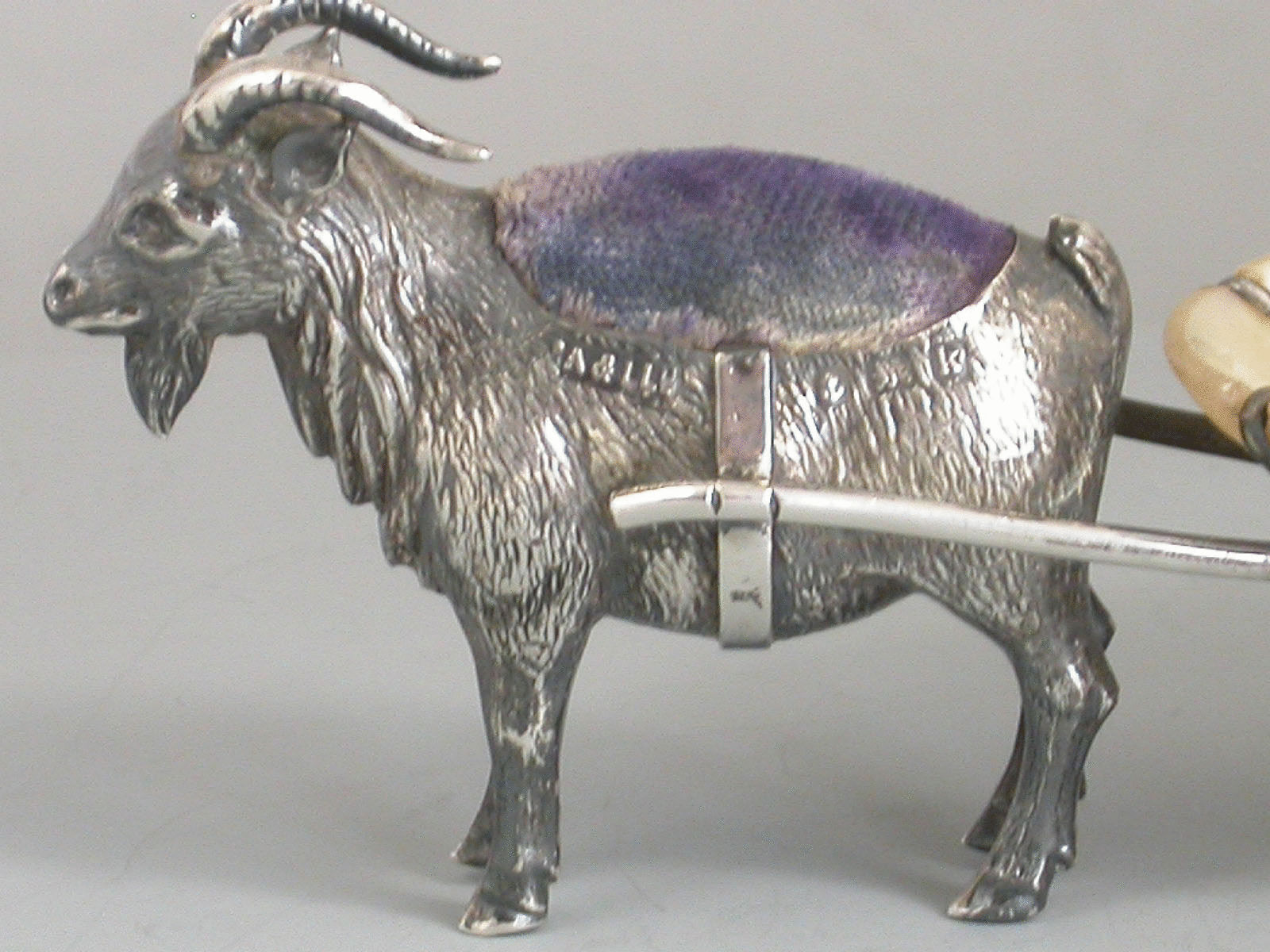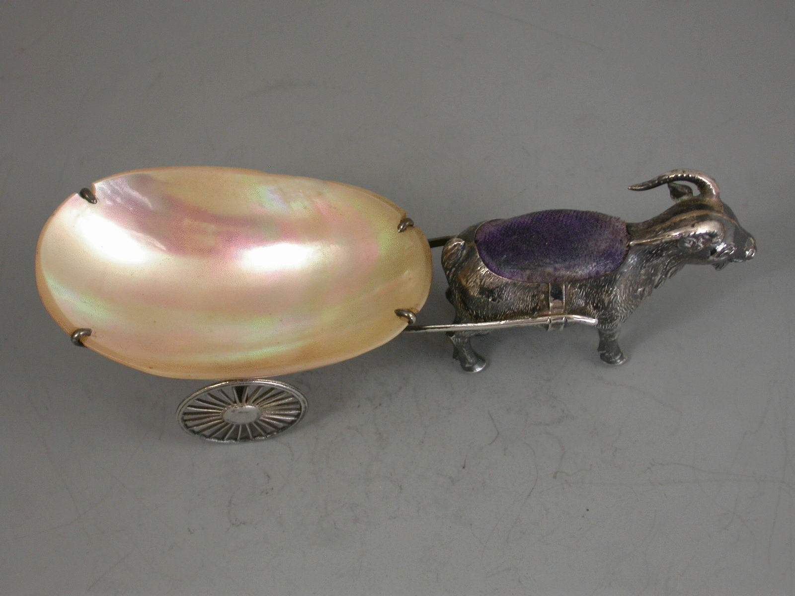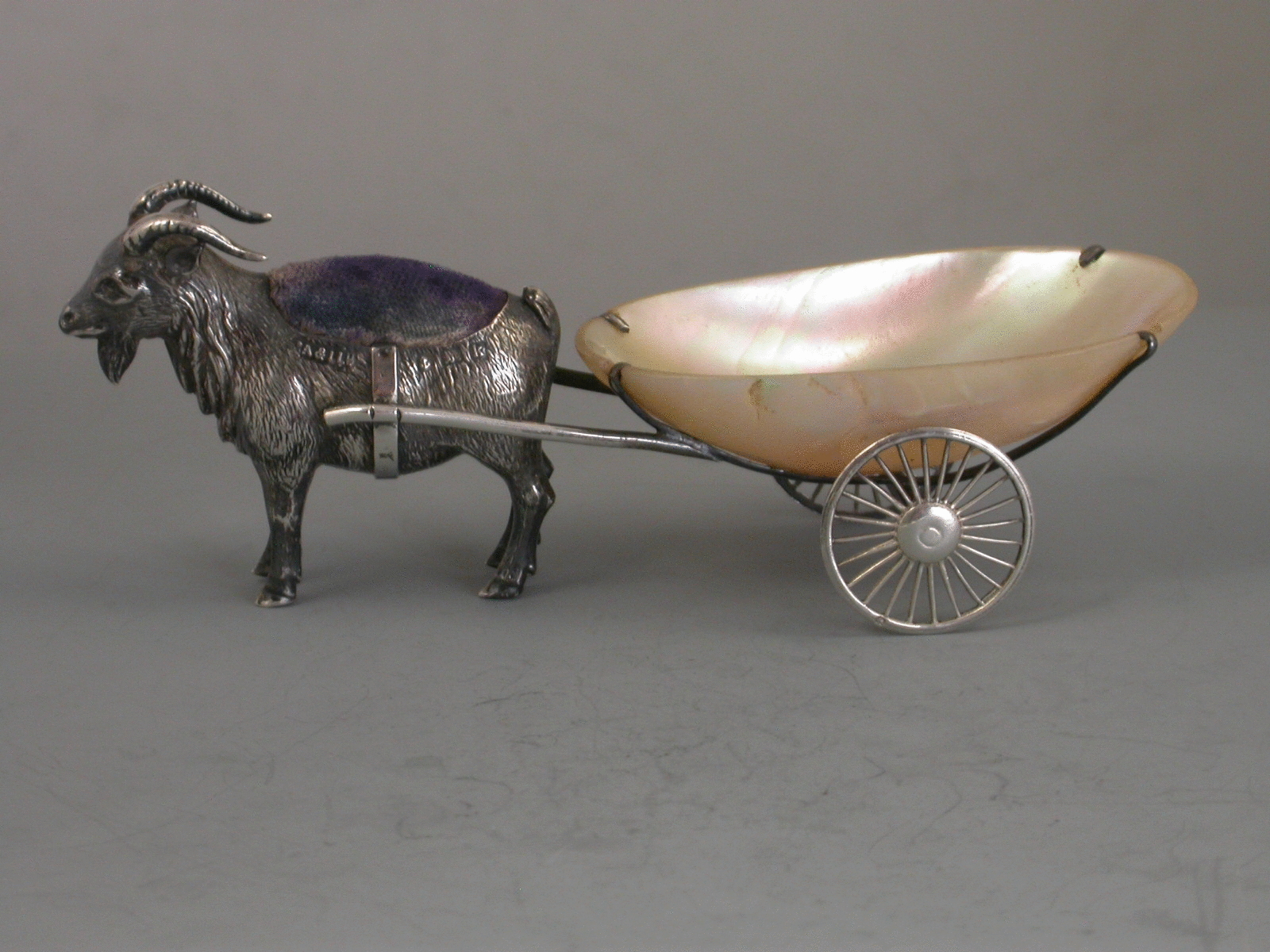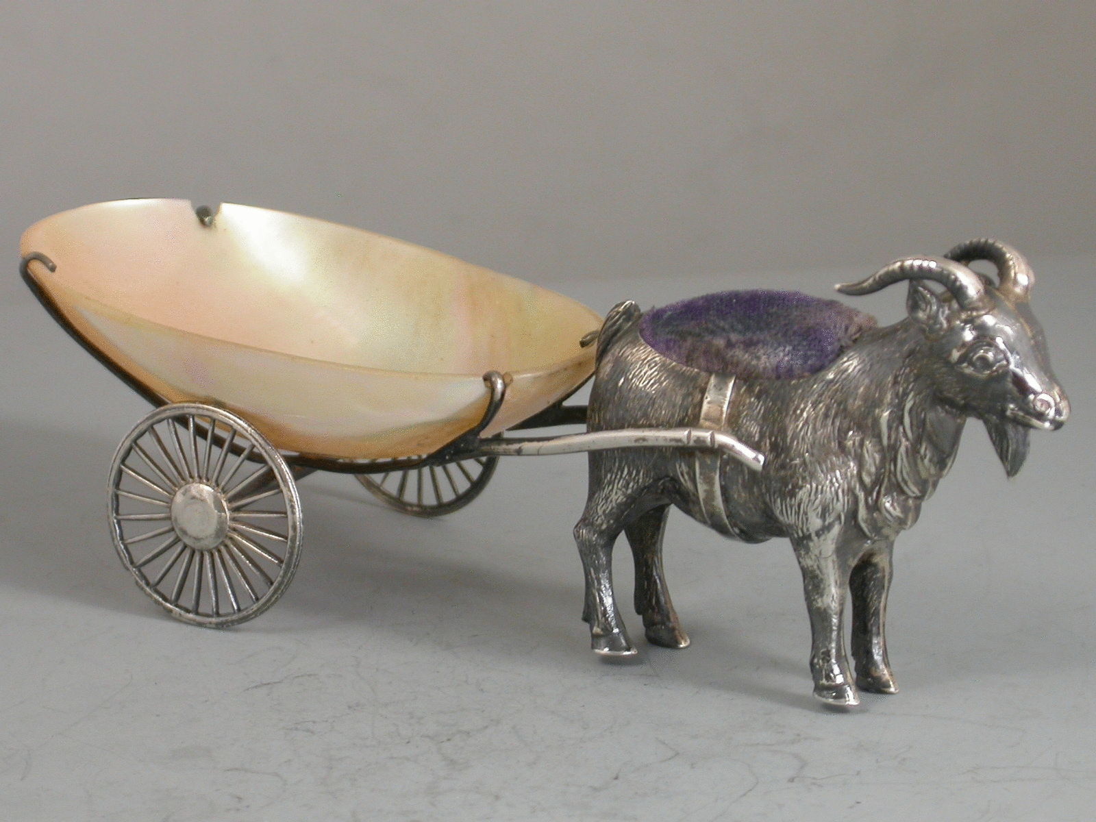 A rare Edwardian Novelty silver Pin Cushion made in the form of a Goat pulling a Mother of Pearl Cart with two wheels.