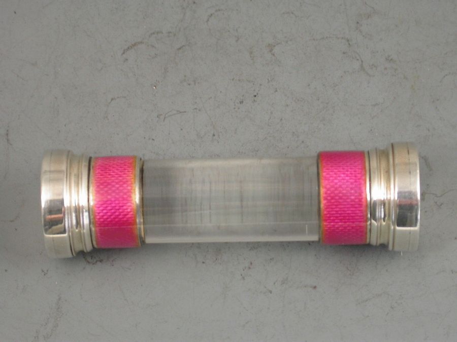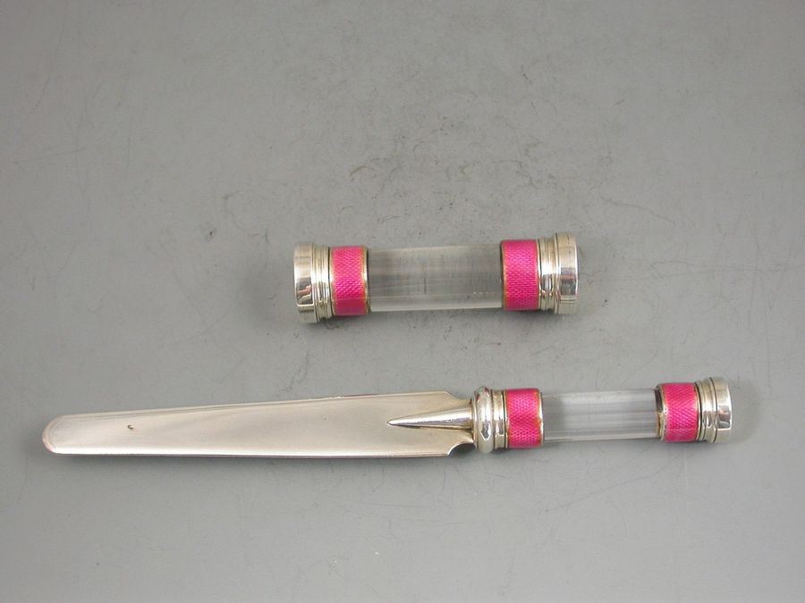 A fine quality Edwardian silver, pink Guilloche enamel and glass Desk Seal and Letter Opener, both pieces with bands of pink enamel at either end of the cylindrical glass bodies.