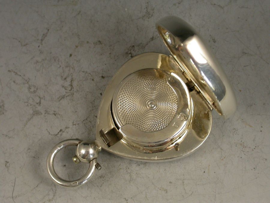 A good Edwardian silver Sovereign Case of heart shaped form with attached suspension ring and push button opening mechanism. The interior with single sprung sovereign compartment, the exterior engraved with contemporary initials.