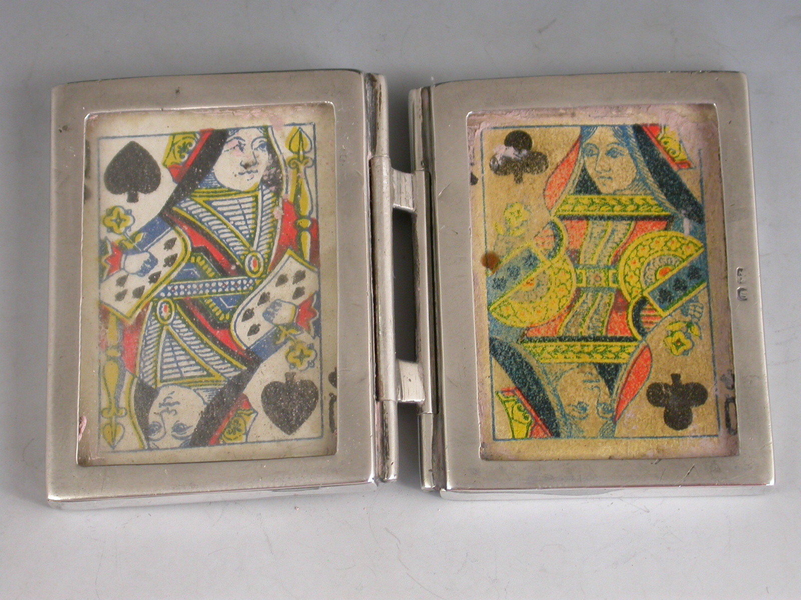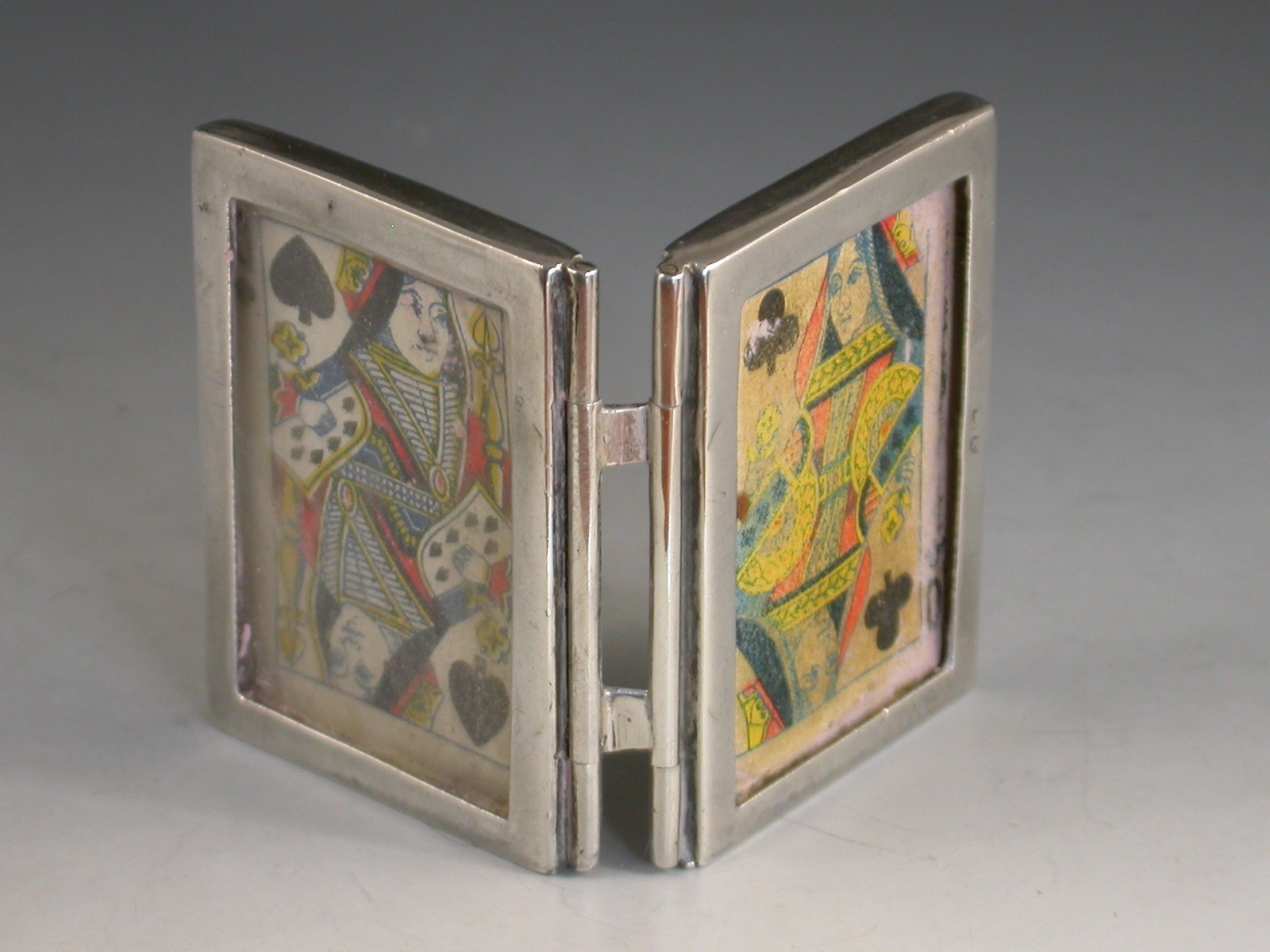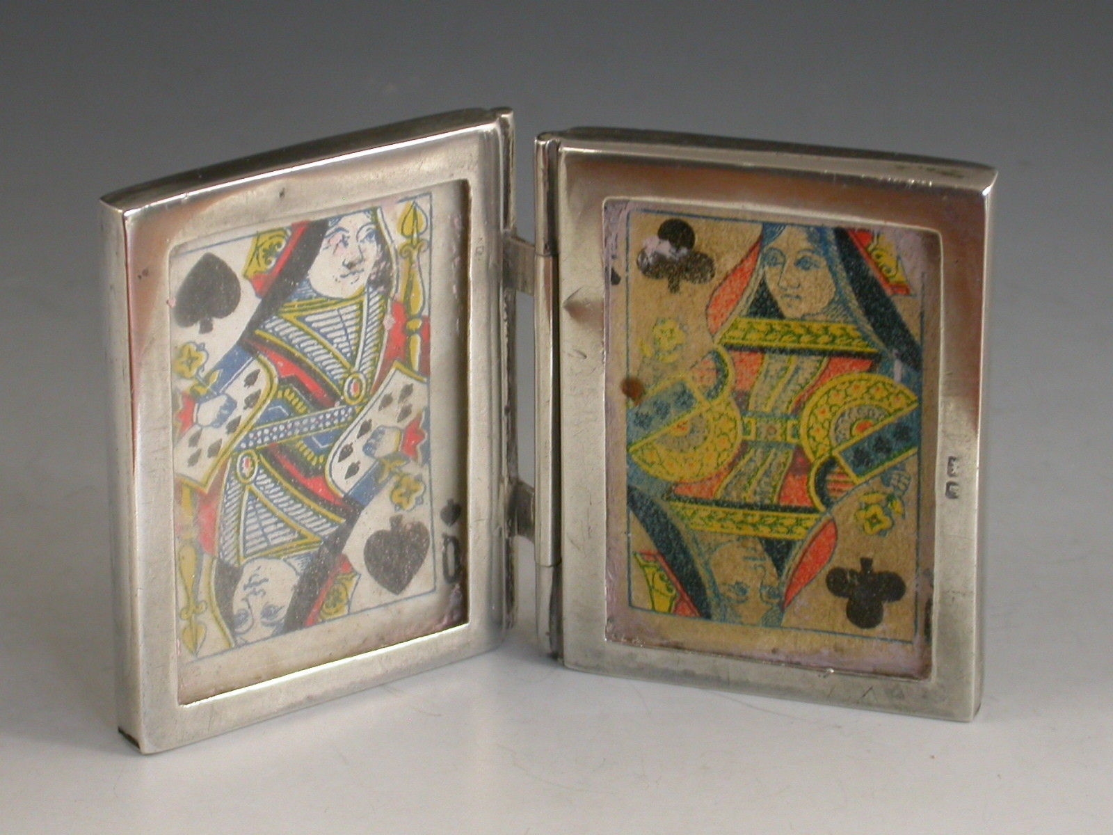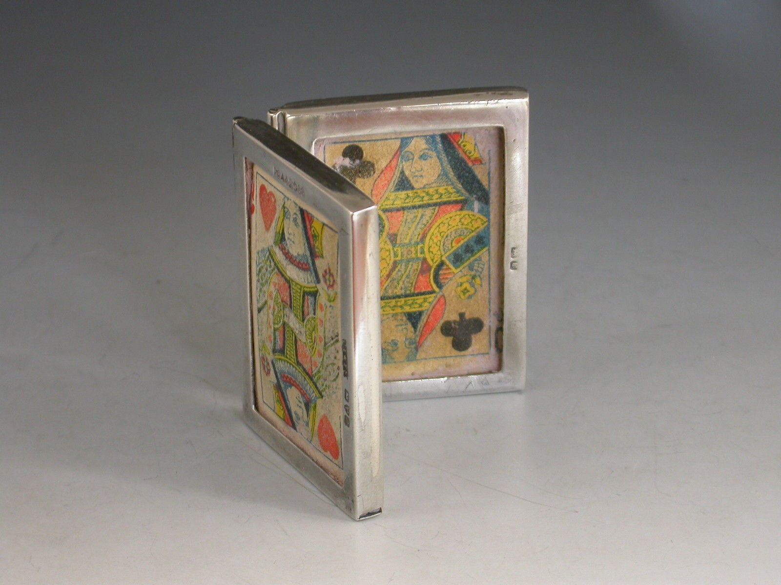 An Edwardian novelty silver Trumps Marker of double hinged book or photo frame form, the two panels holding four vintage playing cards depicting Queens of the four suits.