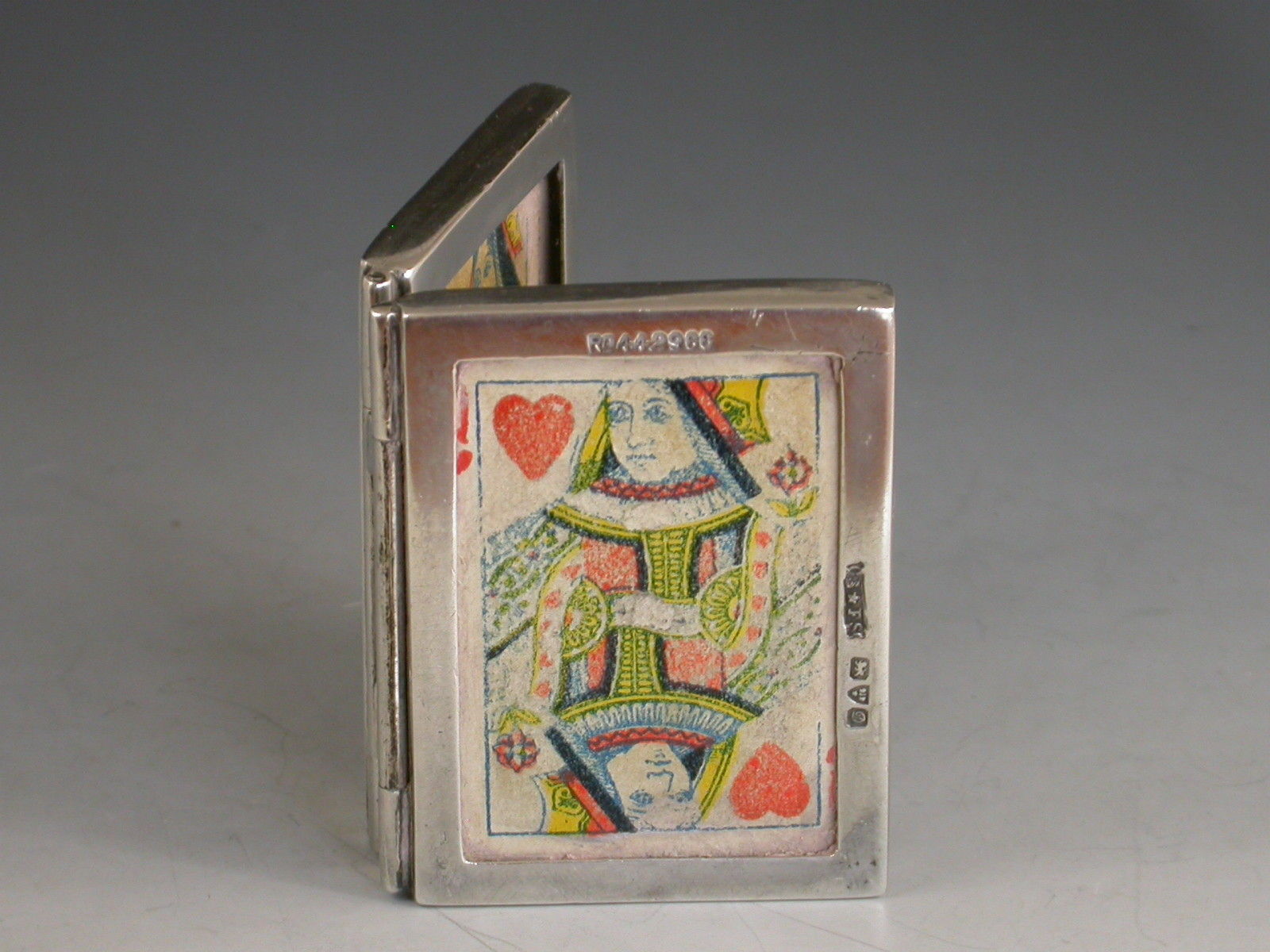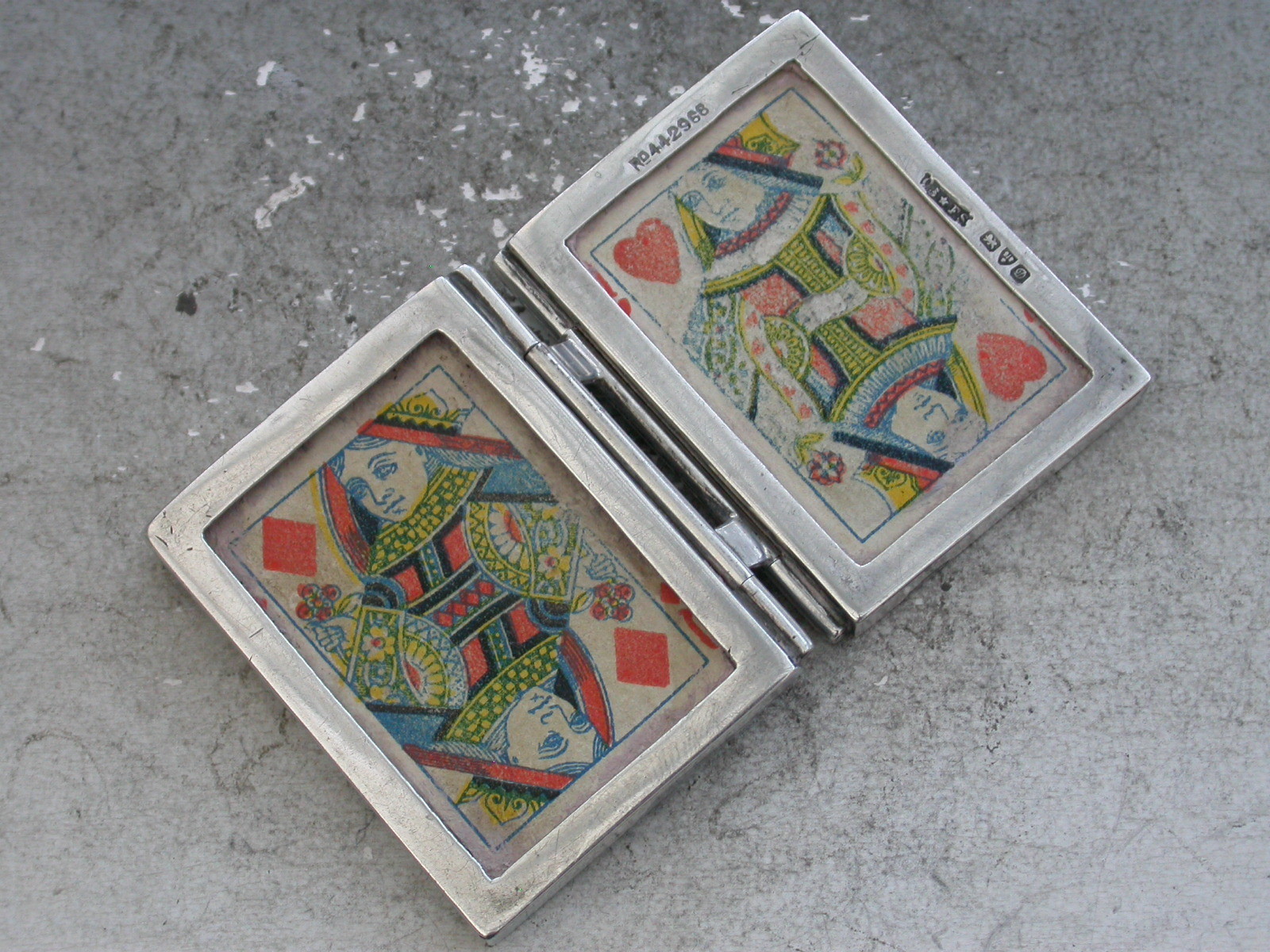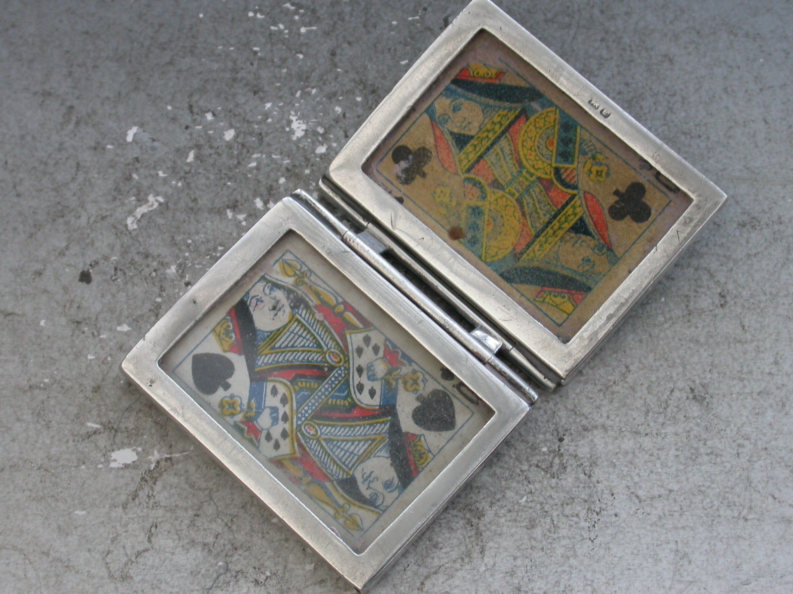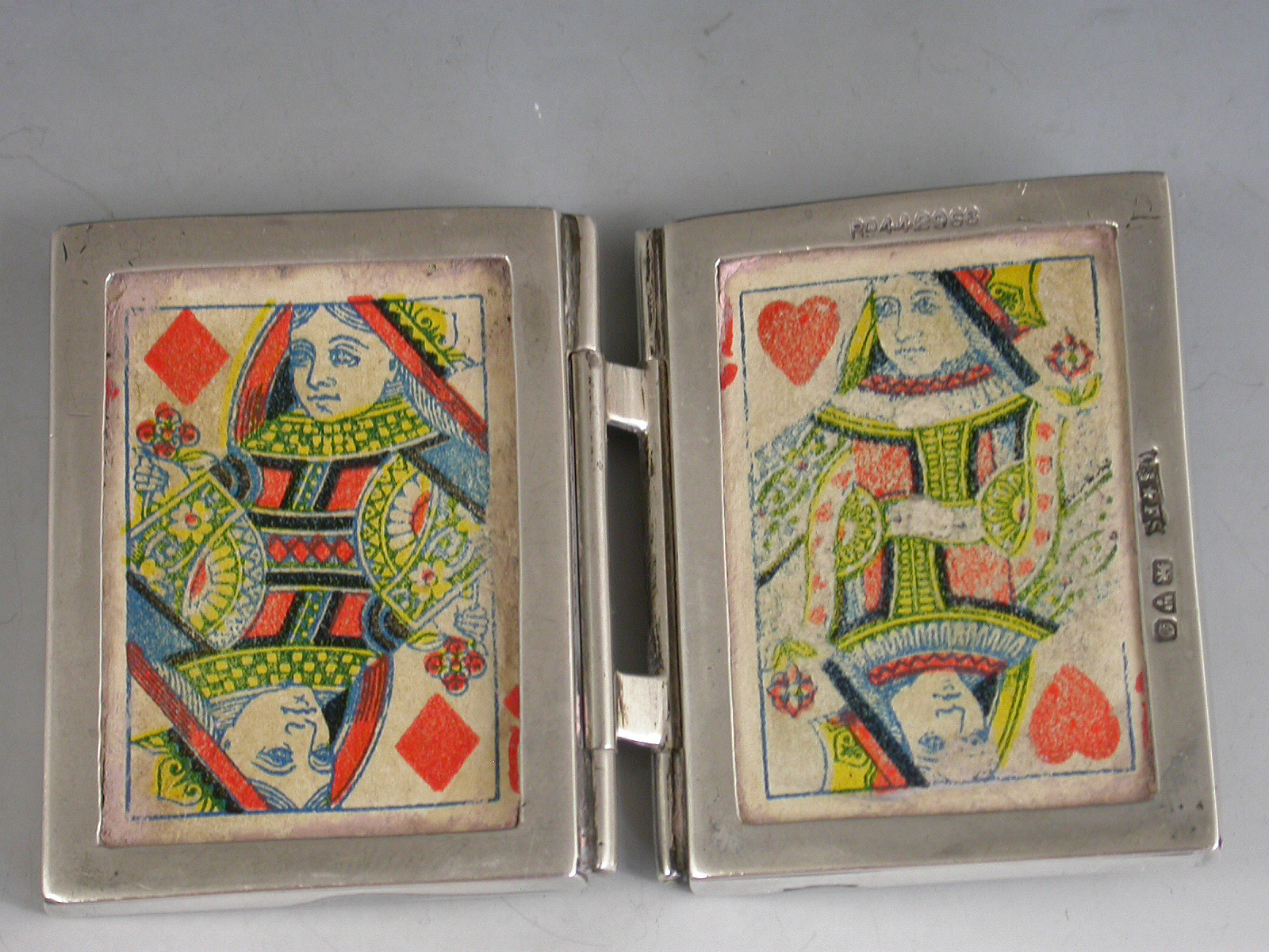 An Edwardian novelty silver Trumps Marker of double hinged book or photo frame form, the two panels holding four vintage playing cards depicting Queens of the four suits.