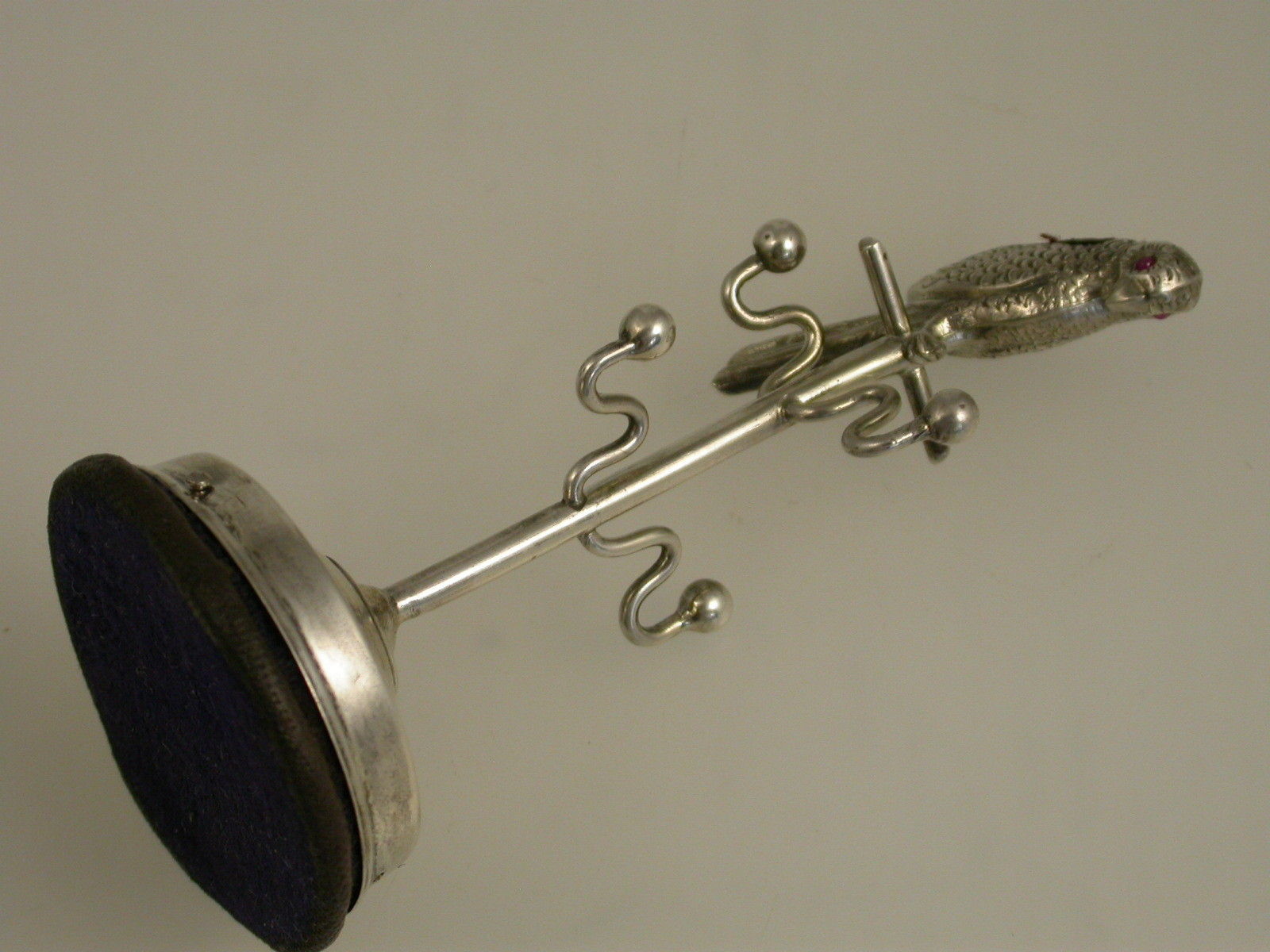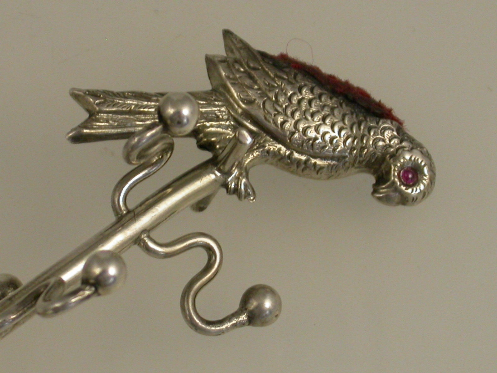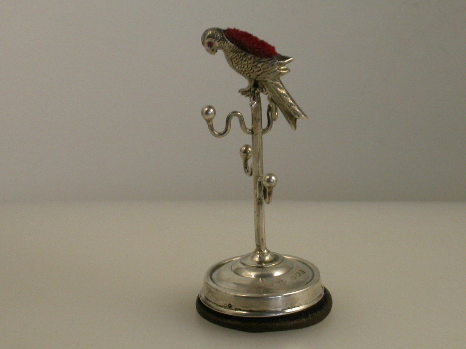 An Edwardian silver novelty Pin Cushion / Ring Stand formed as a Parrot on its perch, the Parrot with red glass eyes and a original red cushion. Four branches to hold rings. The circular silver base with leather stand.