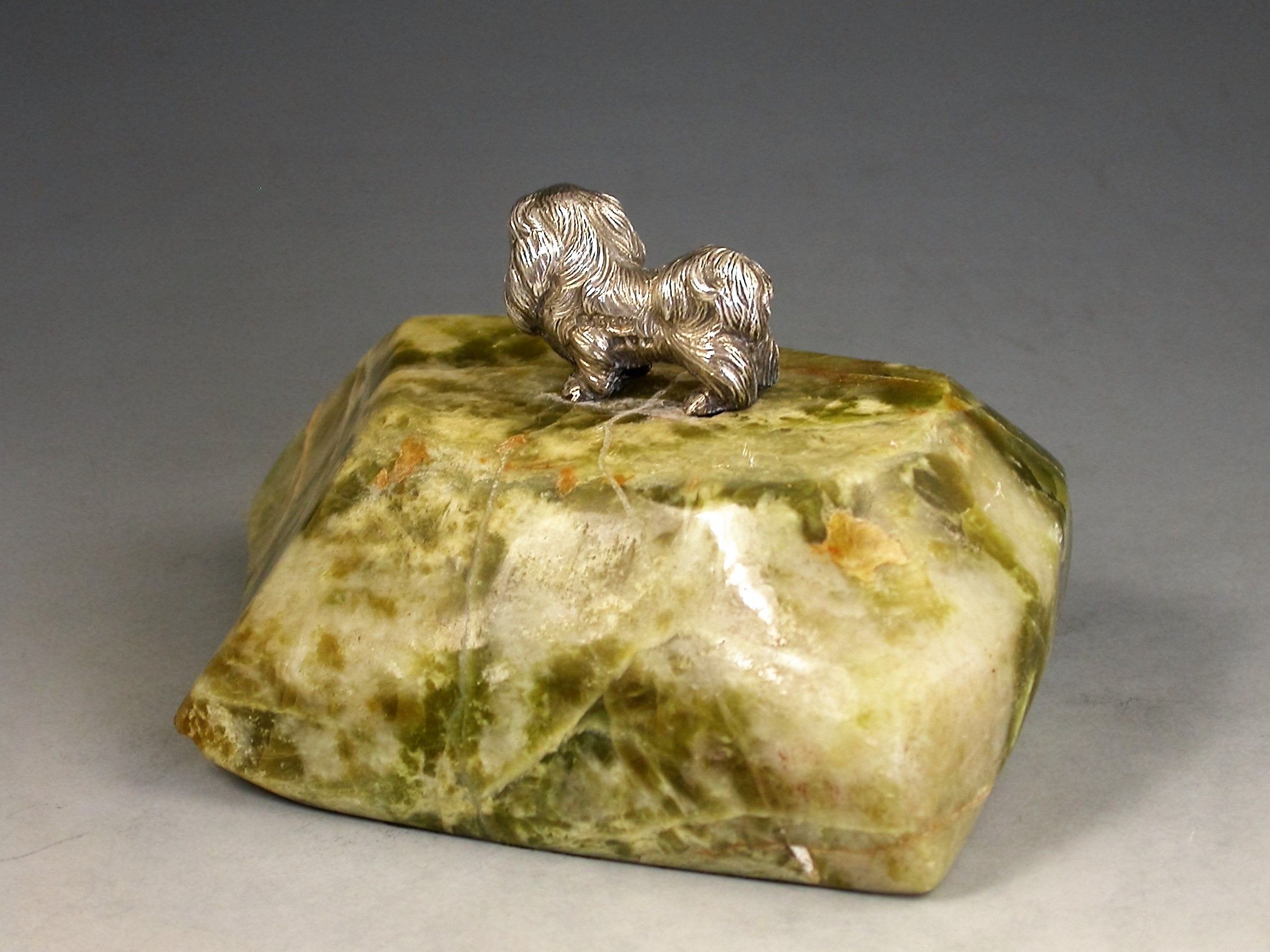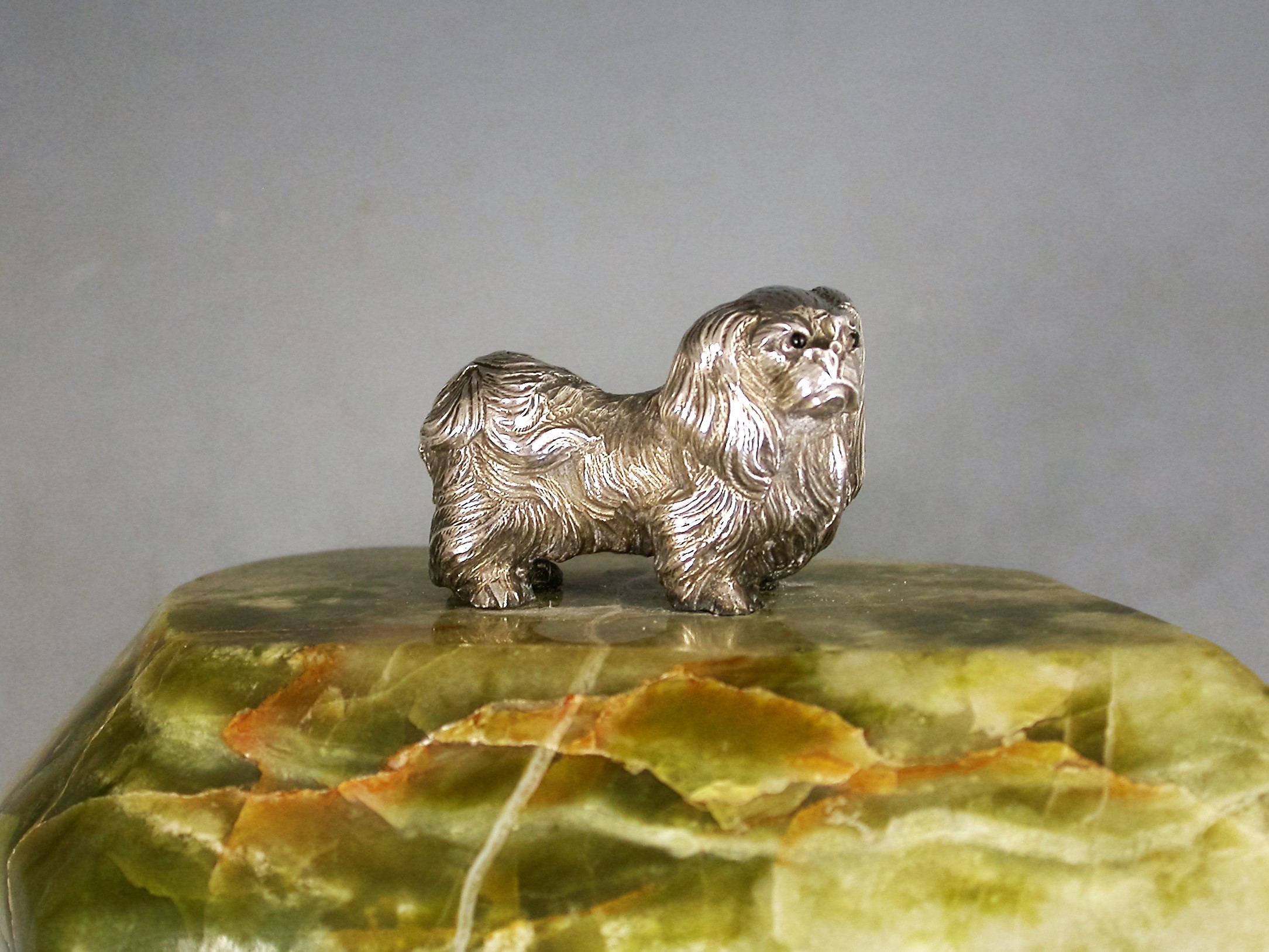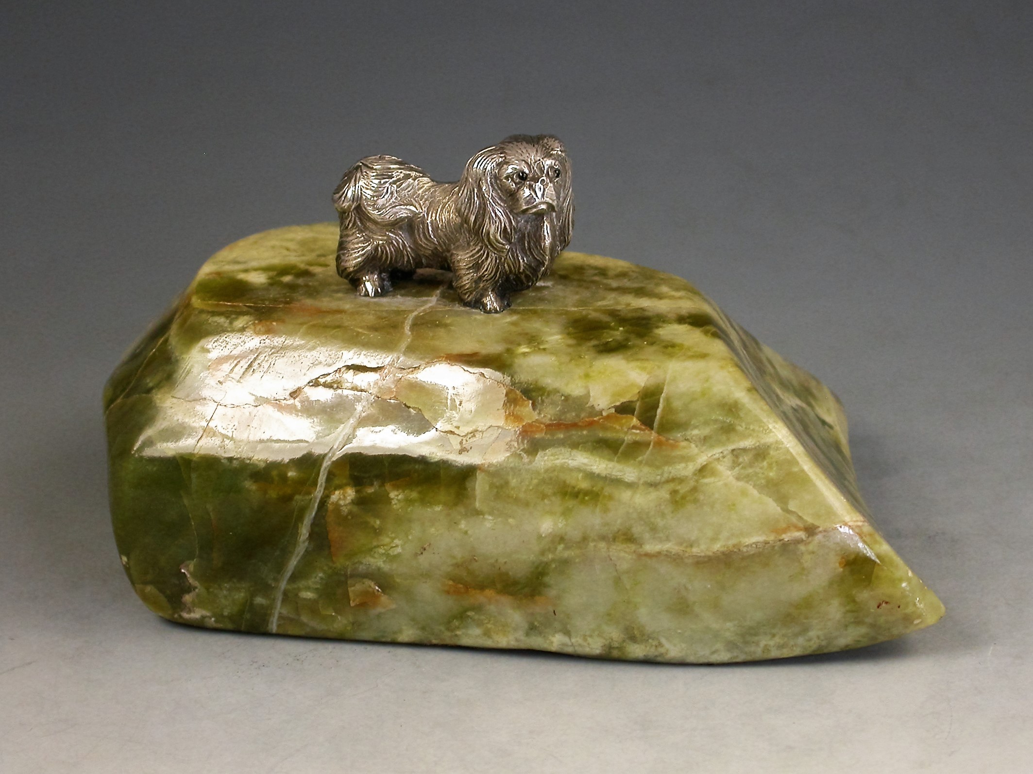 An Edwardian silver model of a Pekingese Dog standing on a shaped green Connemara marble base.