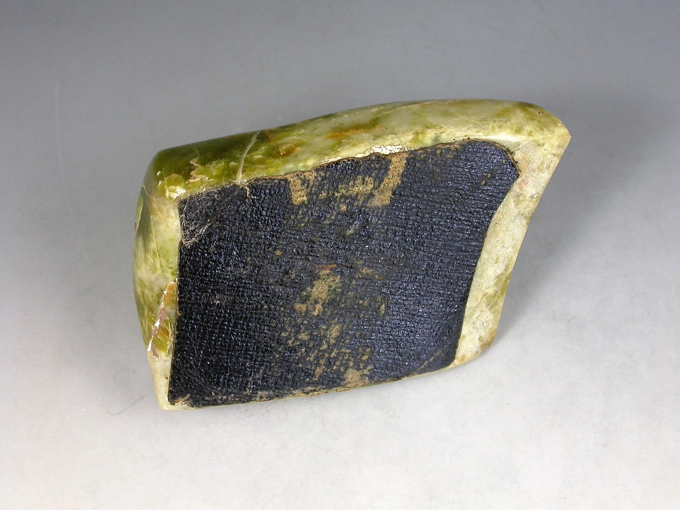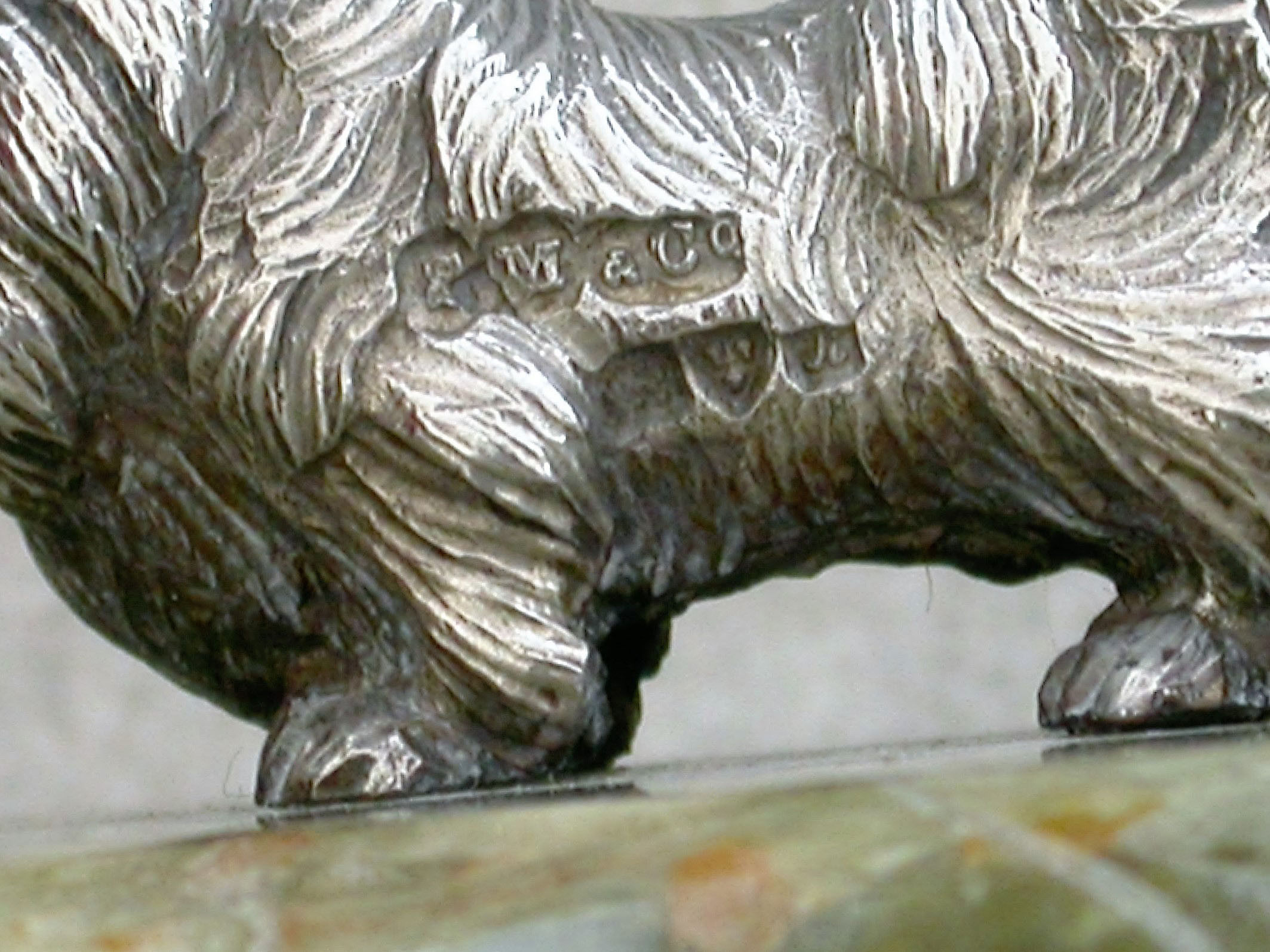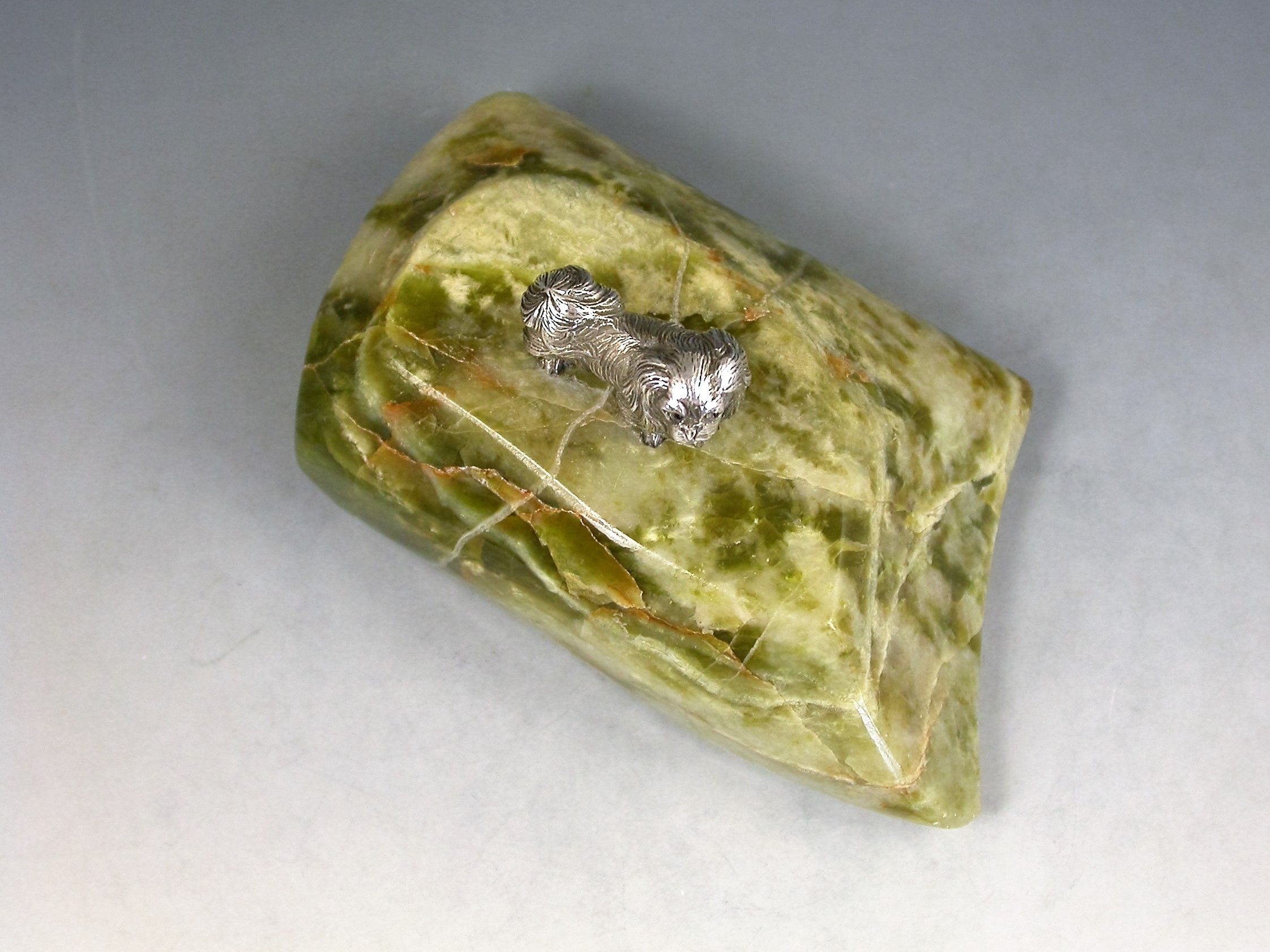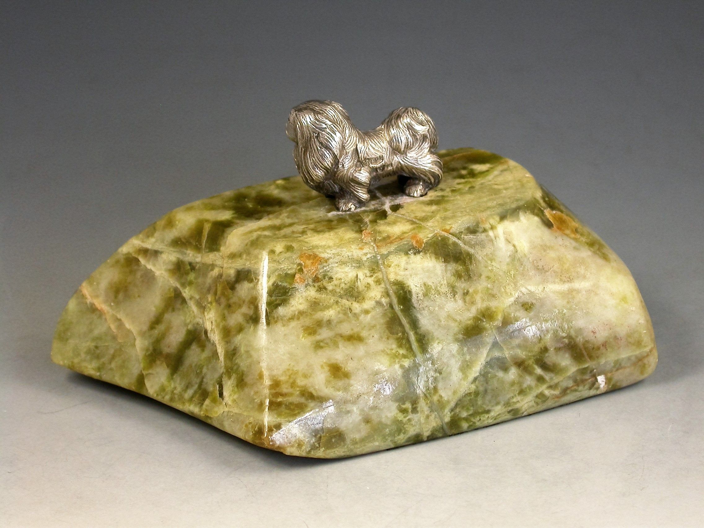 An Edwardian silver model of a Pekingese Dog standing on a shaped green Connemara marble base.