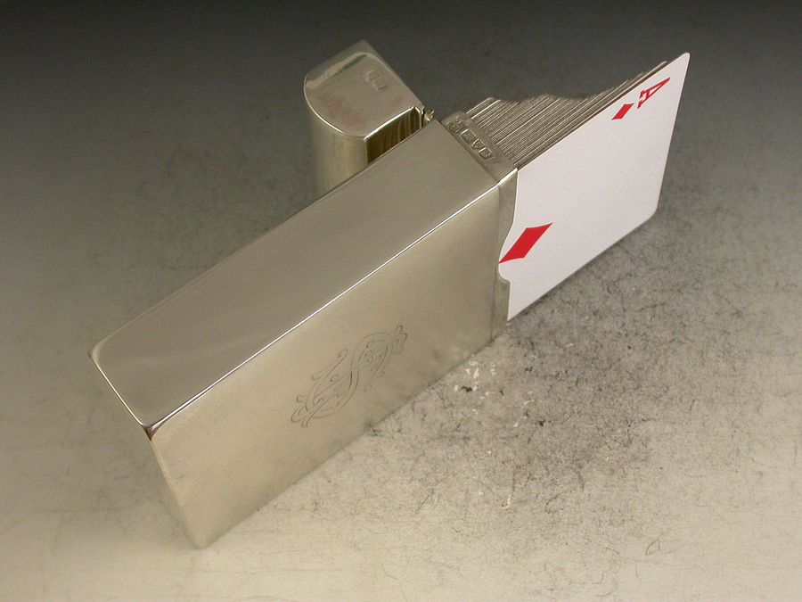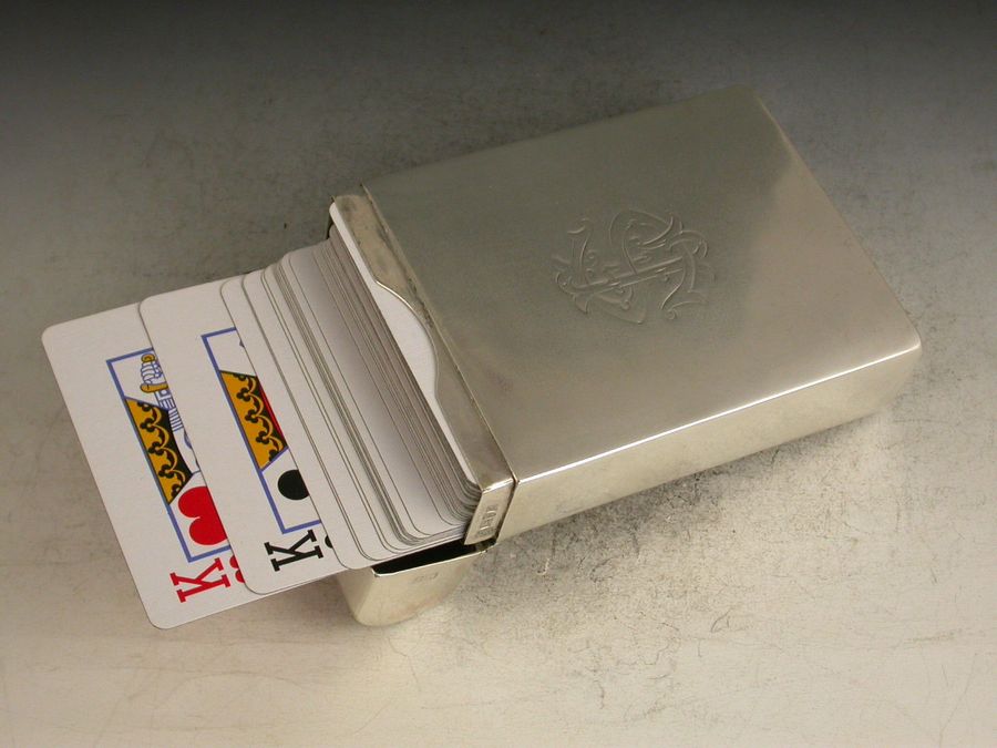 A good Edwardian silver Playing Cards Box of rounded rectangular form with hinged domed lid and raised thumb-piece, the face engraved with contemporary initials.