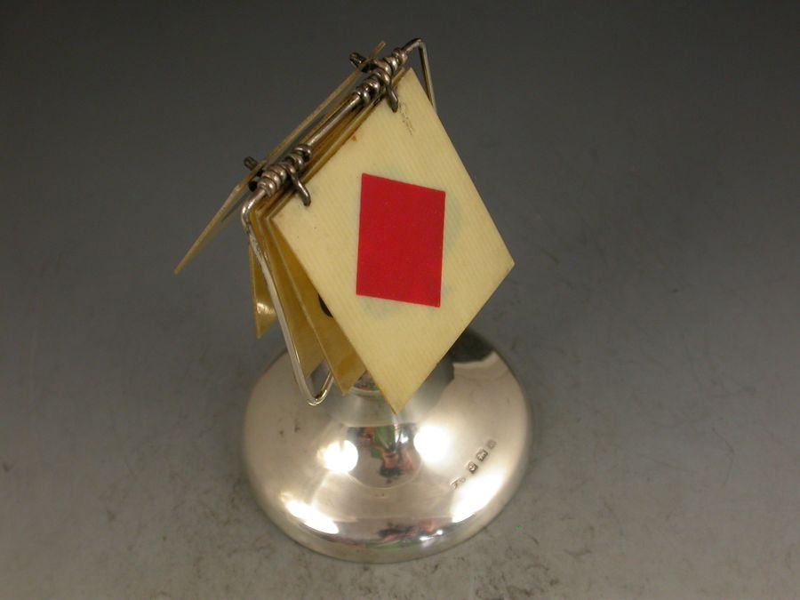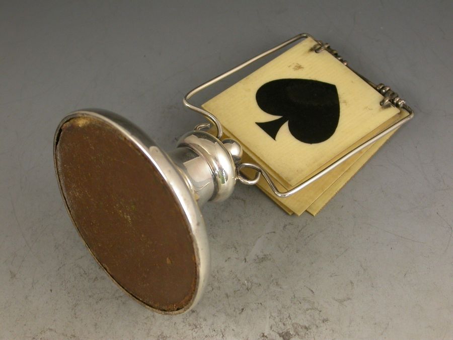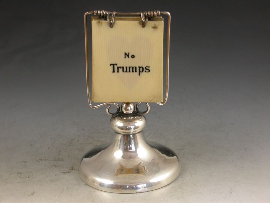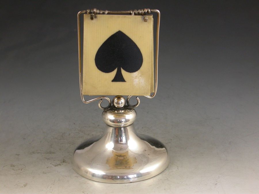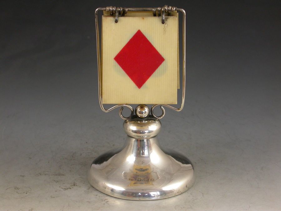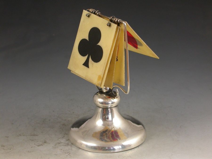 A good early 20th century Edwardian silver Trumps Marker set on a circular leather covered silver pedestal base, the hanging ivory like pages painted with the four suits and no trumps.