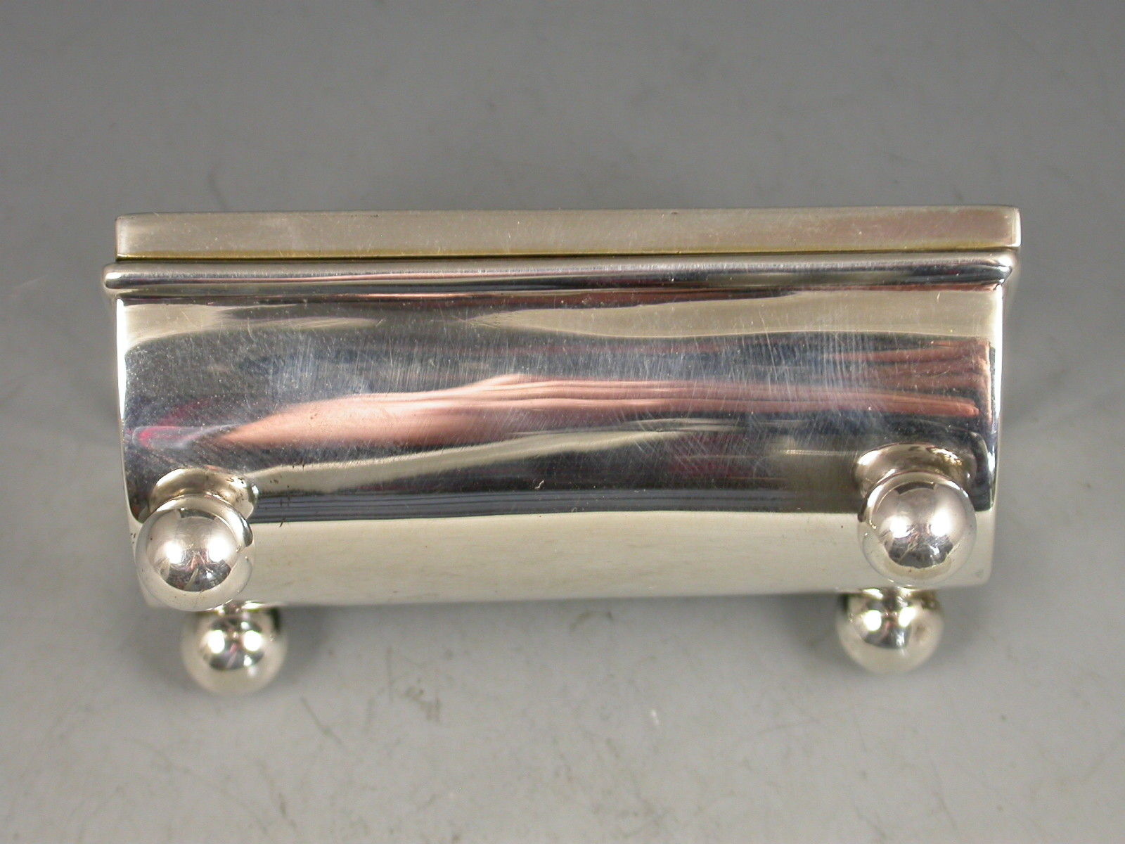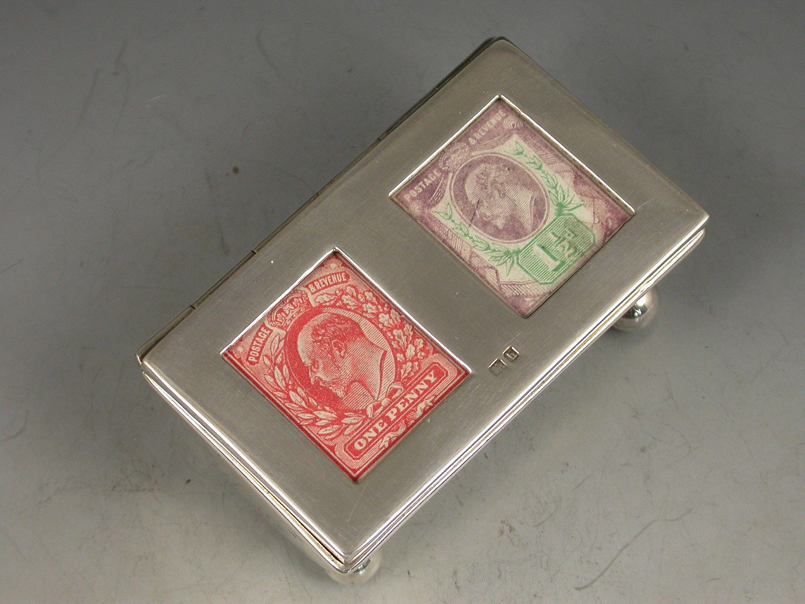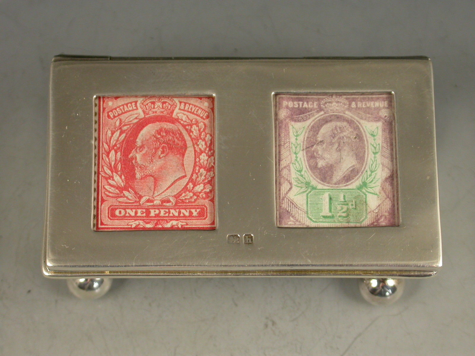An Edwardian silver twin compartment Stamp Box of trough form, standing on four ball feet, the sprung hinged lid opening to reveal a silver gilt interior and containing two glazed compartments holding Edwardian half penny and one and a half penny stamps.