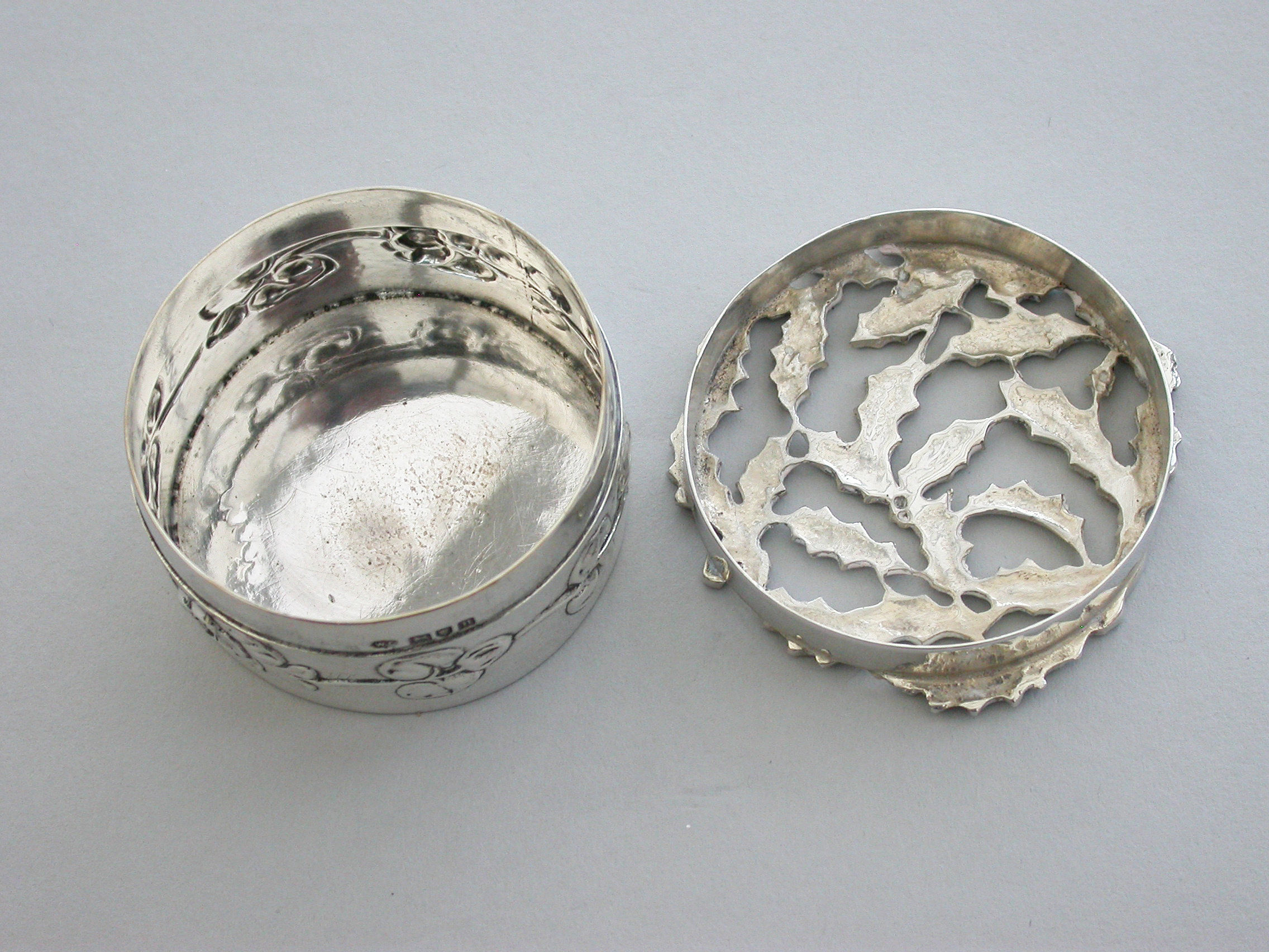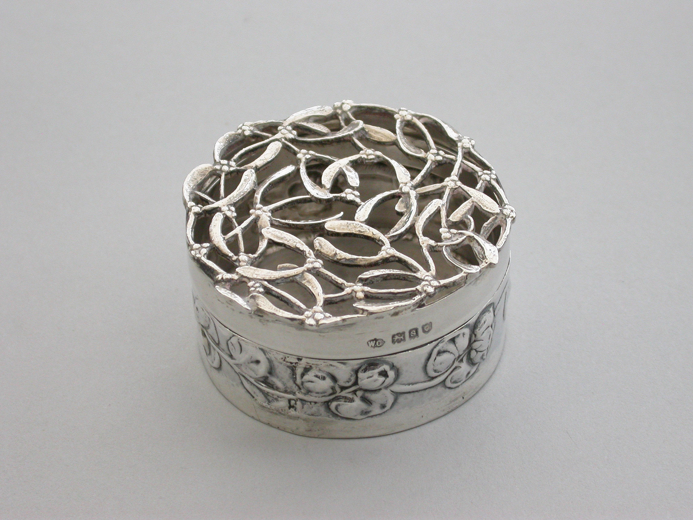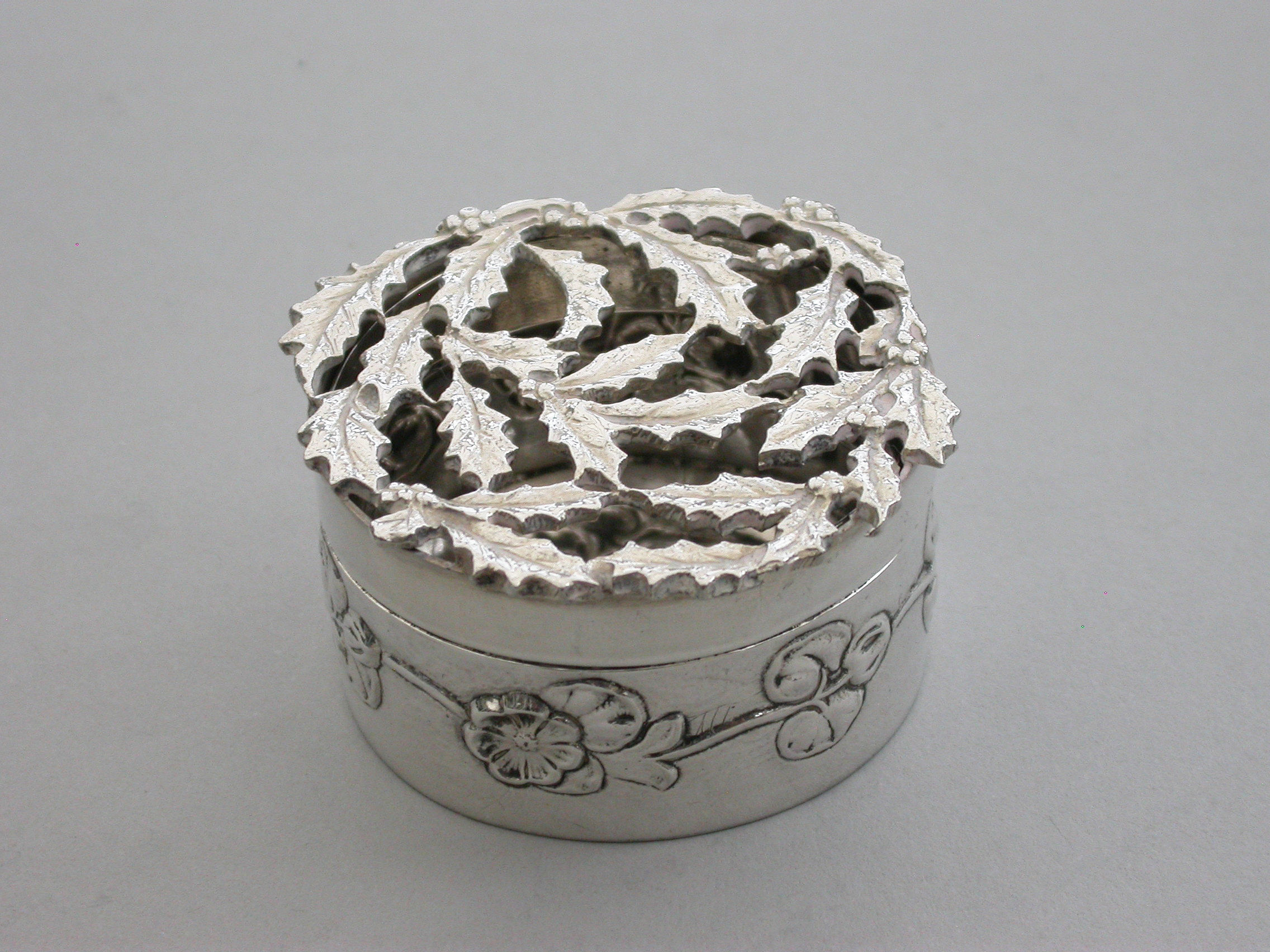 An Edwardian Art Nouveau silver Christmas themed Pot Pourri Box of circular form with pull-off cover, the base embossed with a band of trailing convolvulus flowers. The cover with pierced top depicting fronds of holly.