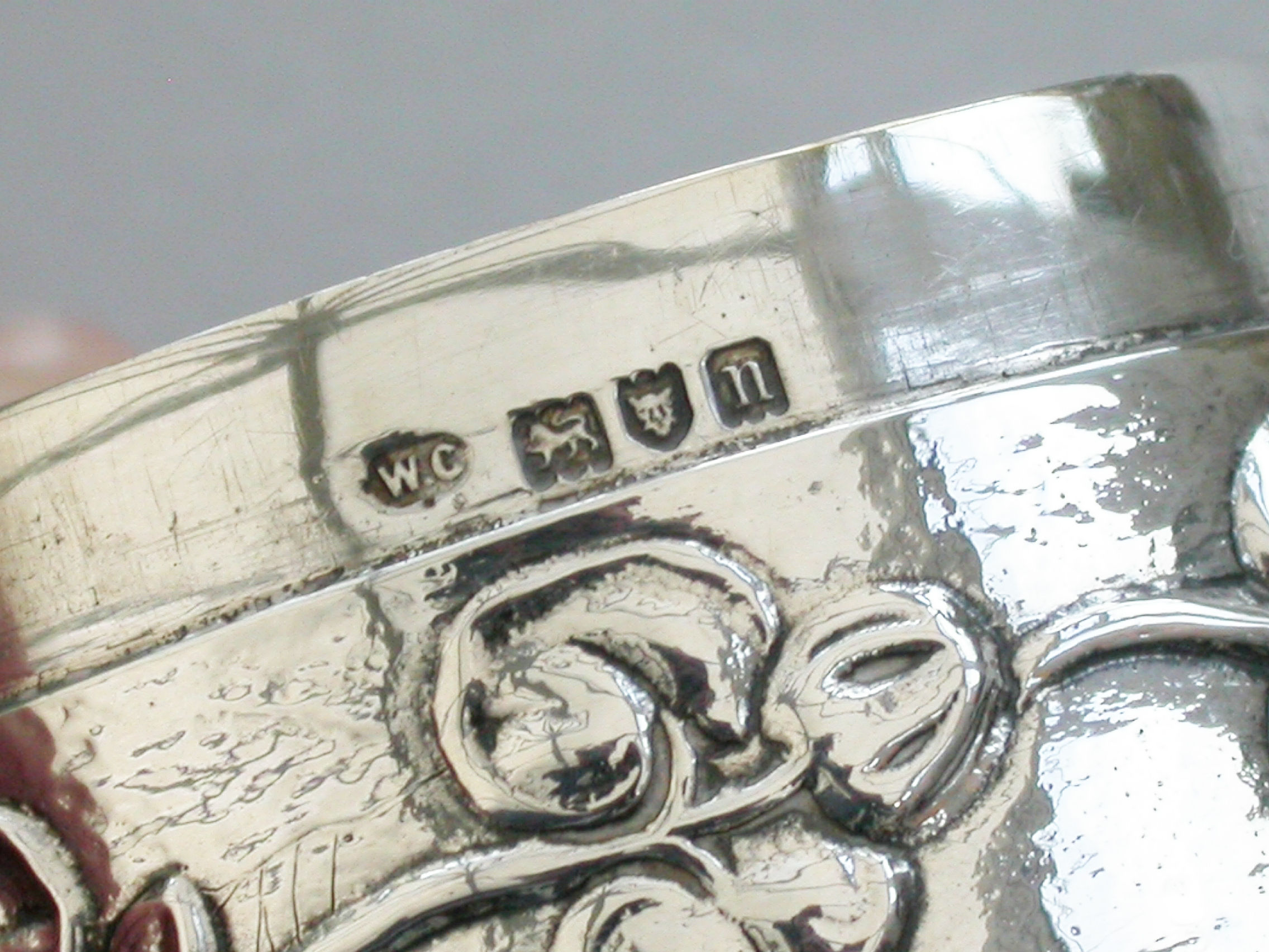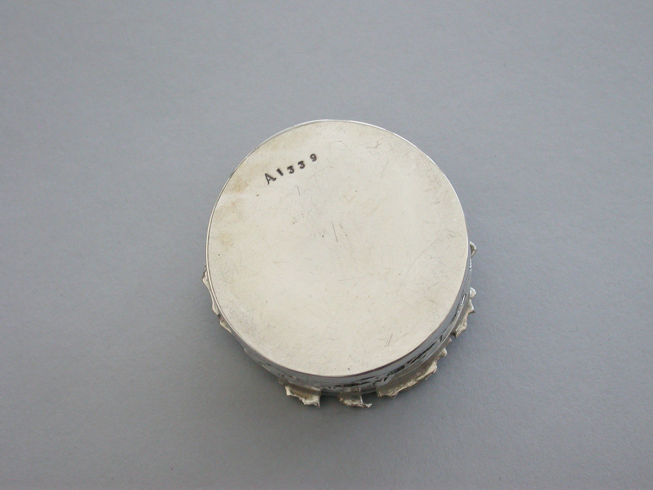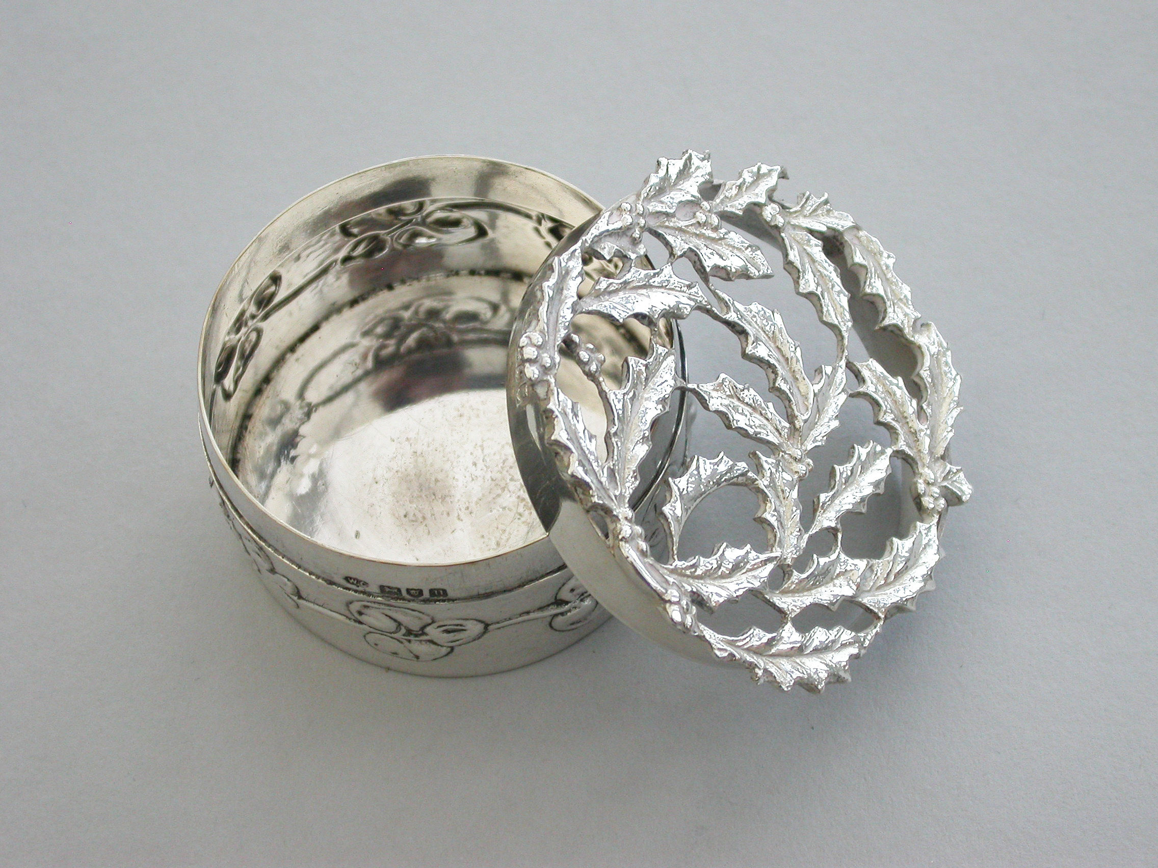 An Edwardian Art Nouveau silver Christmas themed Pot Pourri Box of circular form with pull-off cover, the base embossed with a band of trailing convolvulus flowers. The cover with pierced top depicting fronds of holly.