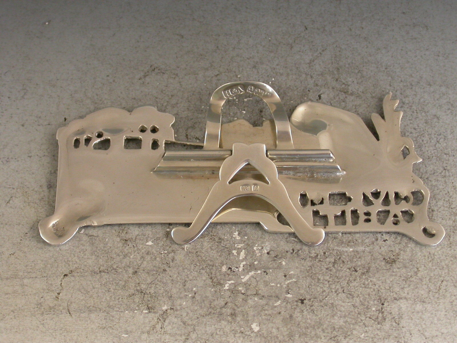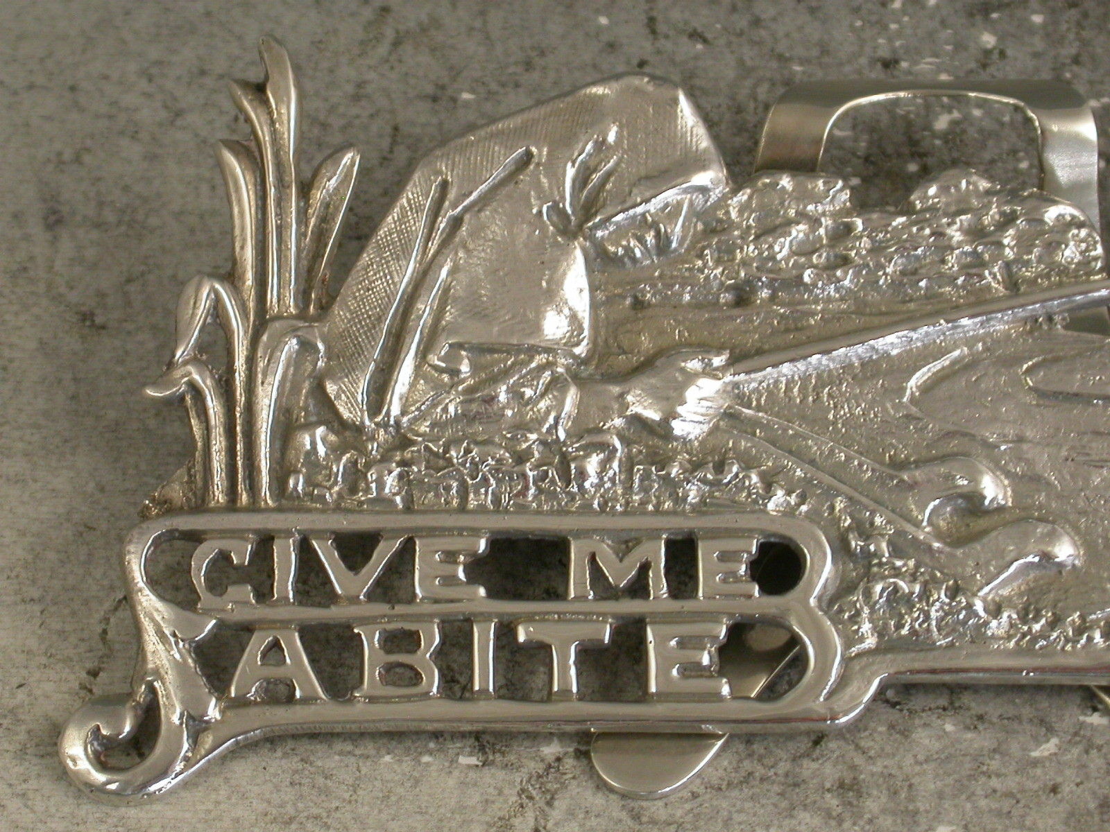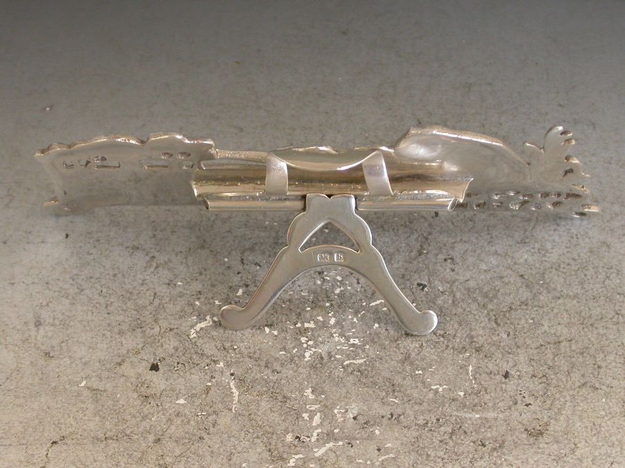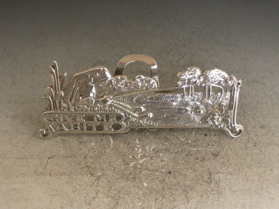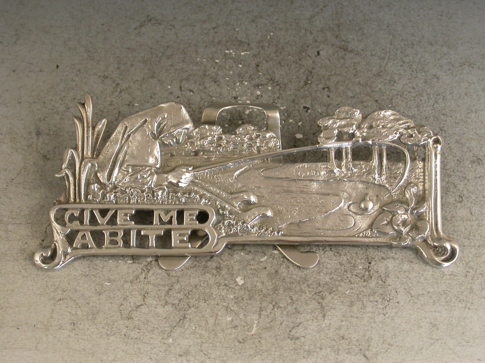 An interesting Edwardian pictorial cast silver Menu Holder in the Art Nouveau style depicting a Nun, Dame Juliana, fishing in a pond and pierced with the legend ""Give Me A Bite"". A hinged folding easel support to the reverse.