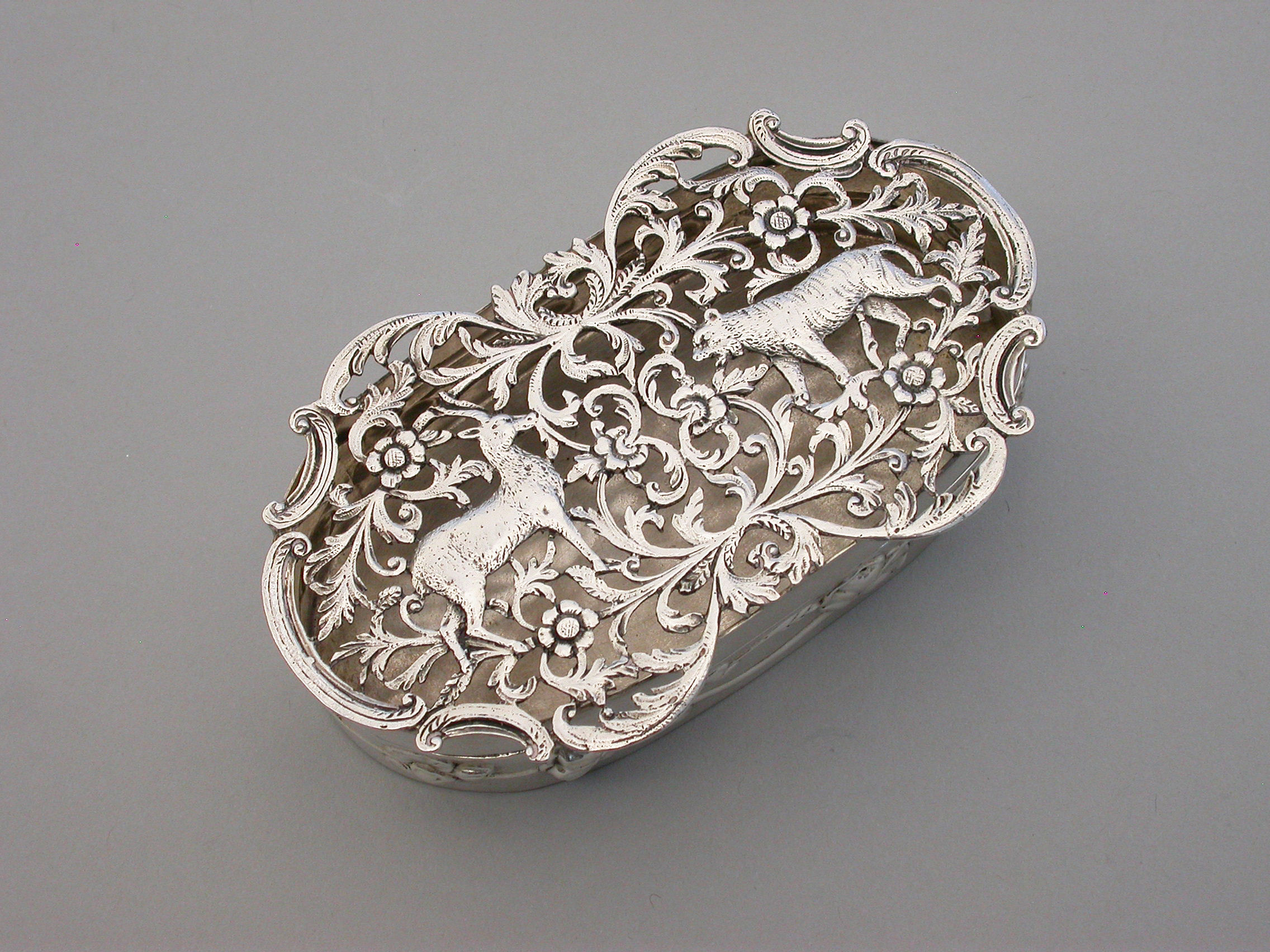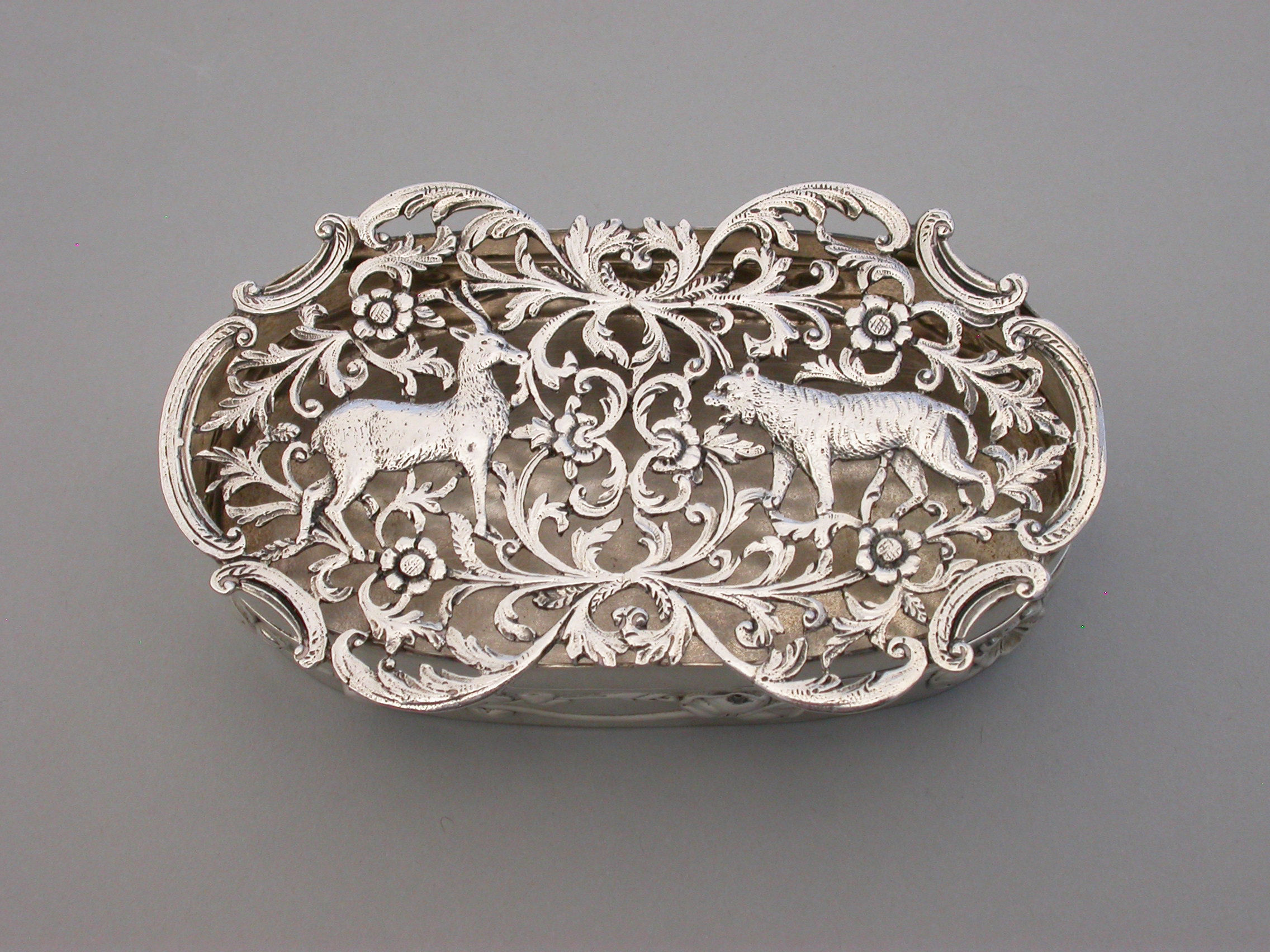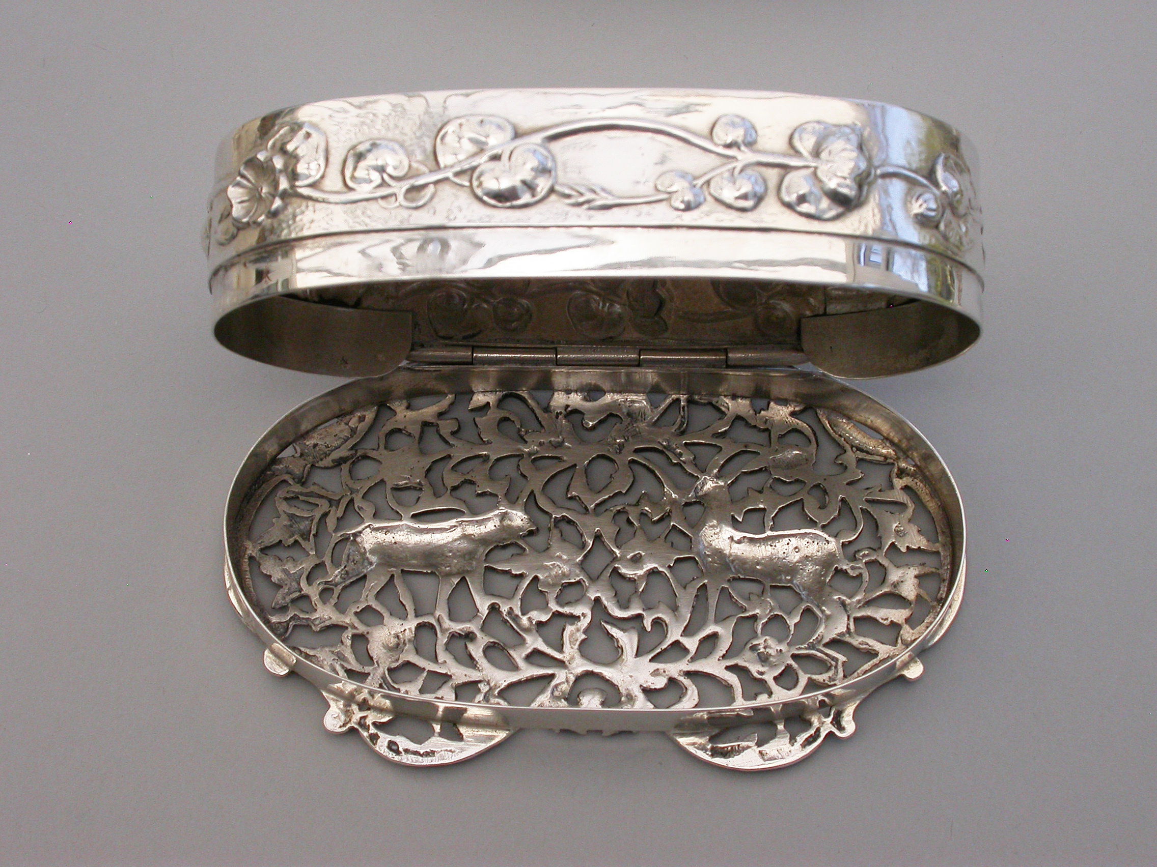 A good quality Edwardian Art Nouveau silver Pot Pourri Box of oval form with hinged cover, the sides embossed with a band of trailing convolvulus flowers. The applied cast and pierced shaped silver lid decorated with an Antelope and a Tiger amongst foliate scrolls.