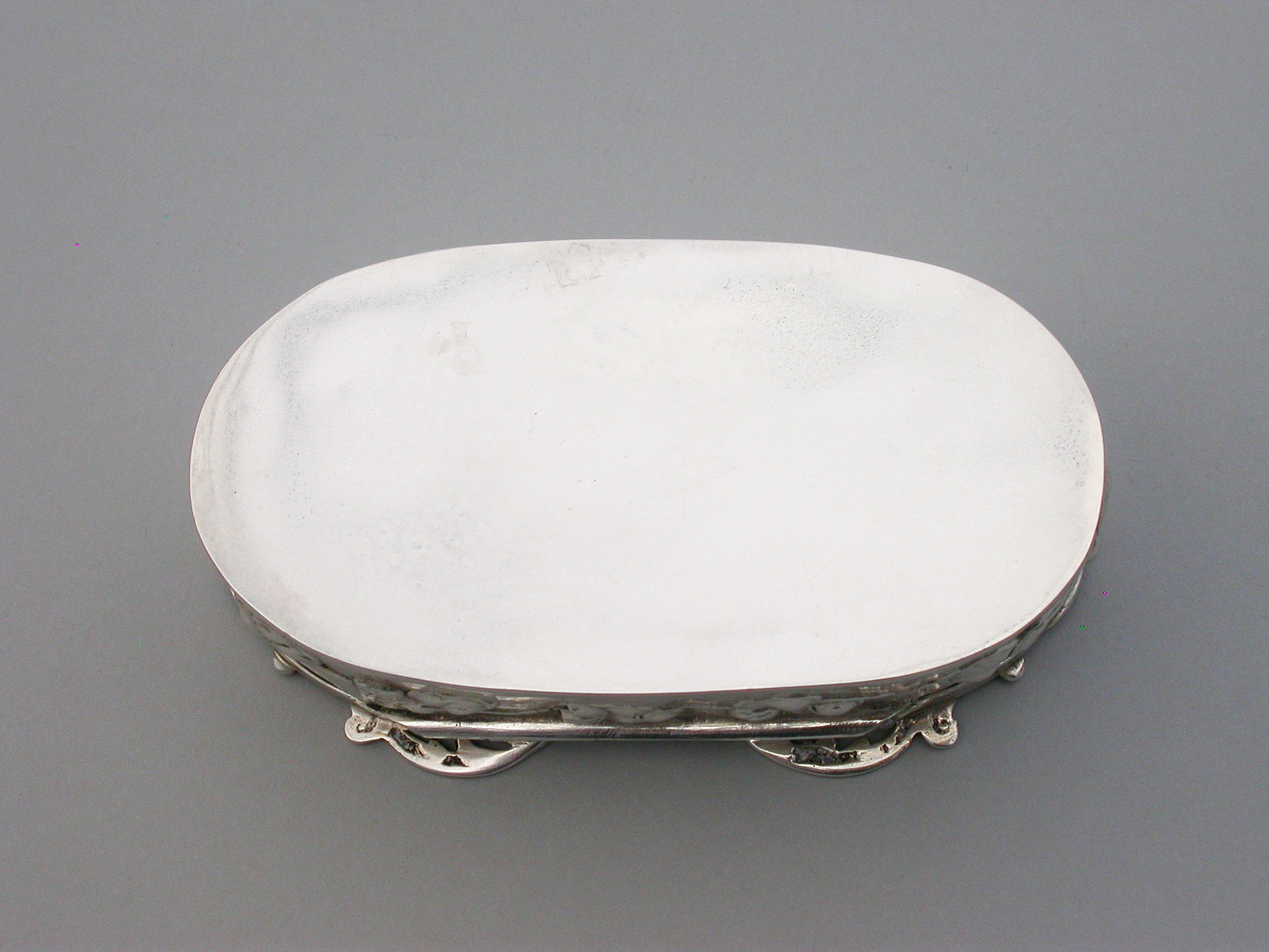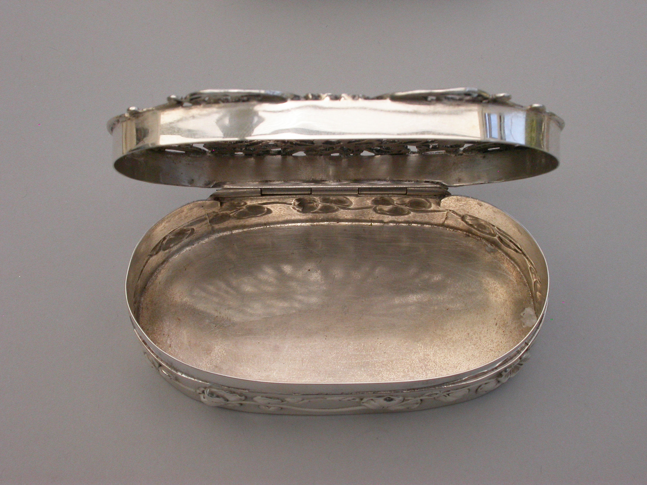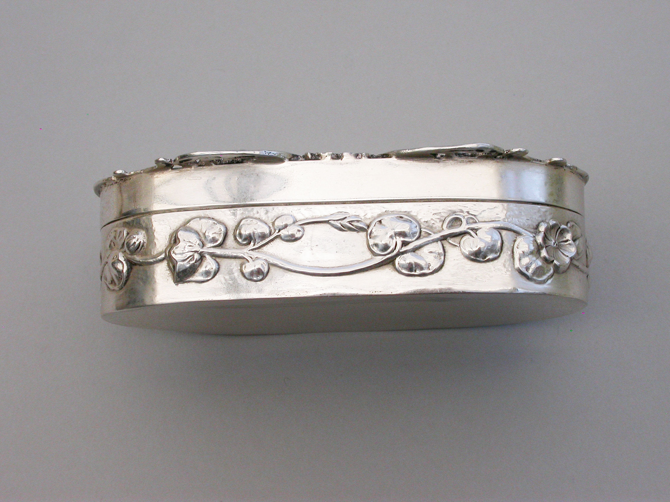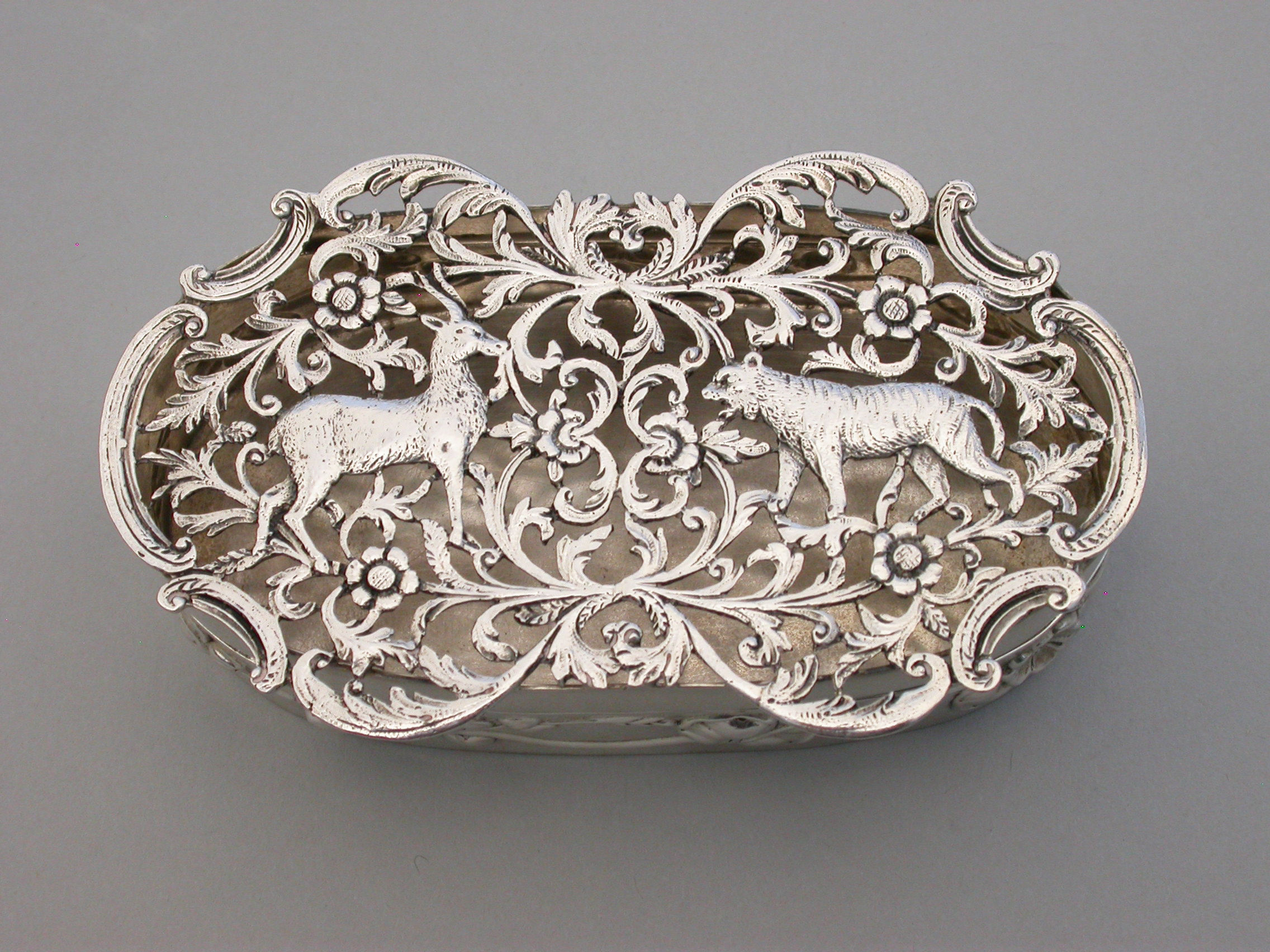 A good quality Edwardian Art Nouveau silver Pot Pourri Box of oval form with hinged cover, the sides embossed with a band of trailing convolvulus flowers. The applied cast and pierced shaped silver lid decorated with an Antelope and a Tiger amongst foliate scrolls.