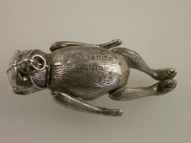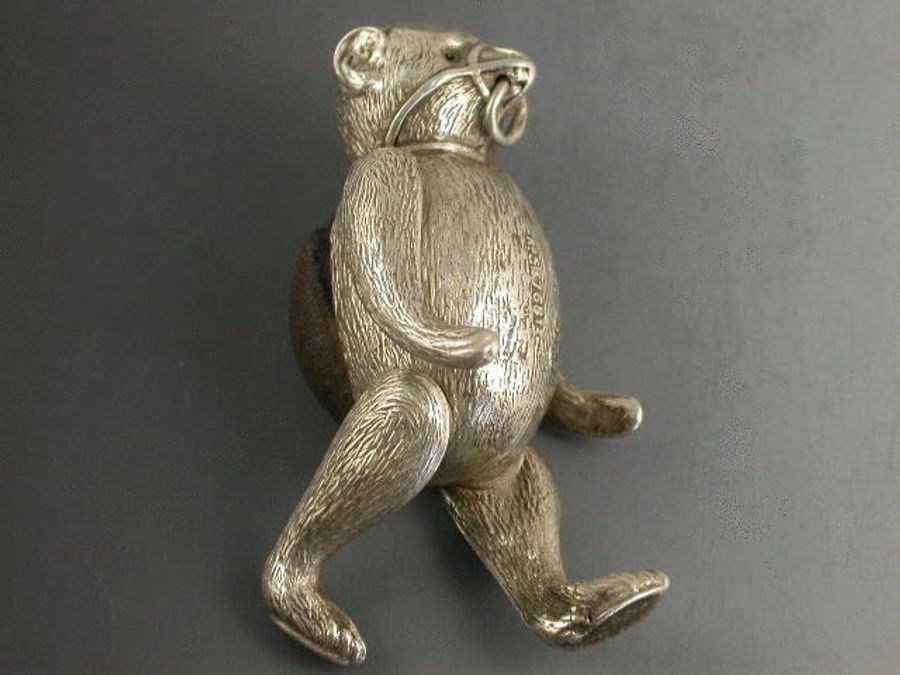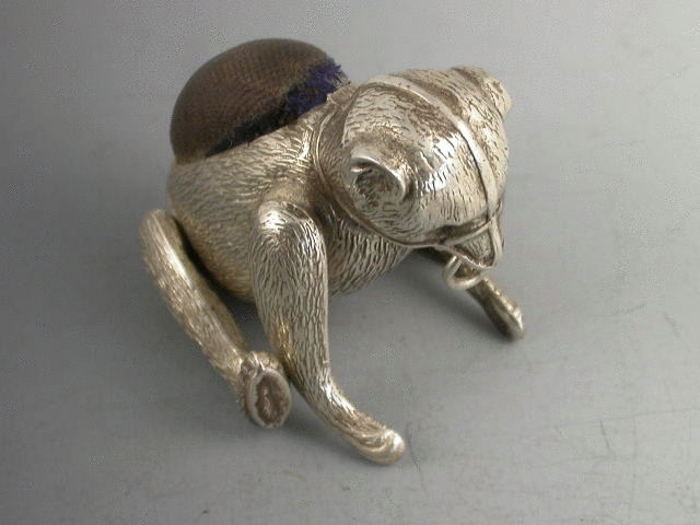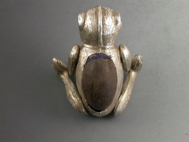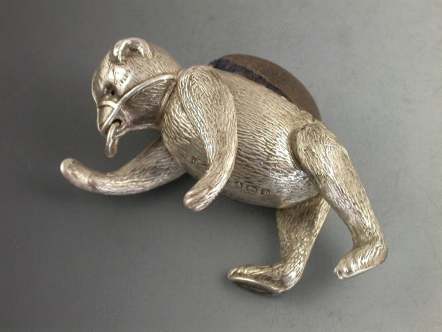 An extremely rare Edwardian silver Pin Cushion modelled as a muzzled and articulated Bear, with four moving limbs and realistically engraved fur. Complete with original, although worn, blue velvet cushion.