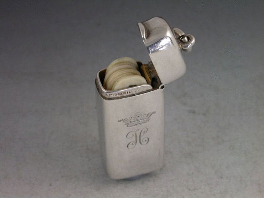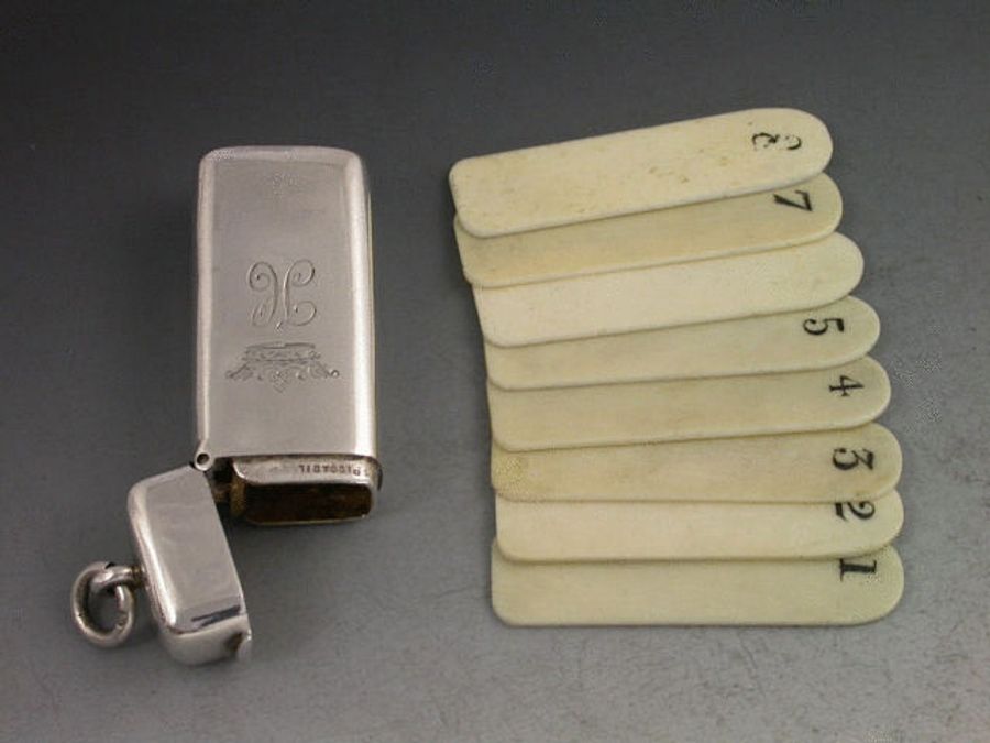 An early Edwardian silver Butt Marker of elongated rounded rectangular form with hinged flip-top lid with attached suspension ring, the silver gilt interior with 8 numbered ivory or bone pegs. The body engraved with a Marquesses Coronet and initial ‘H’.