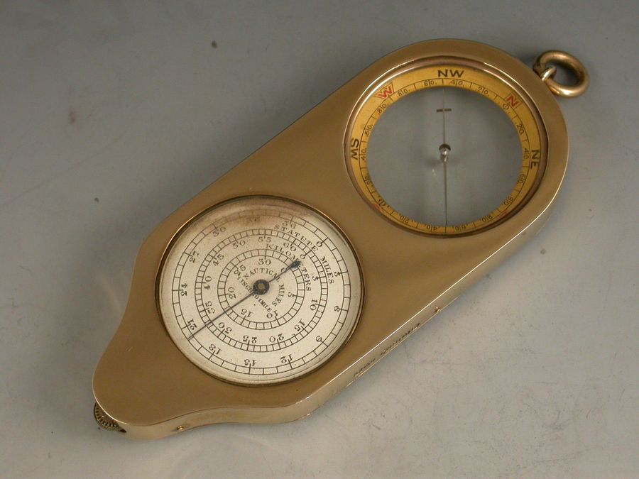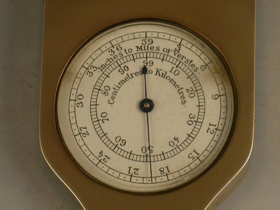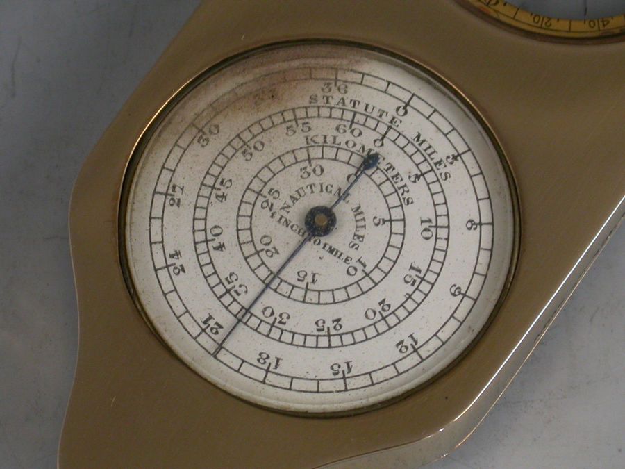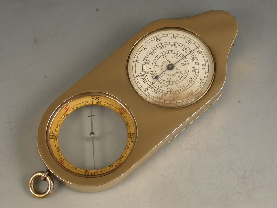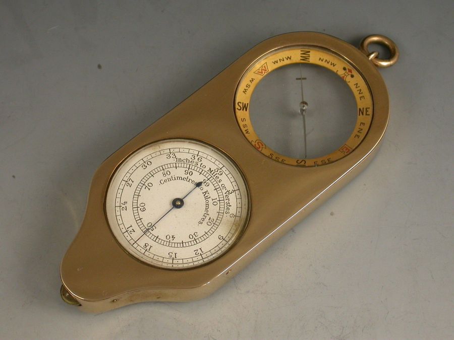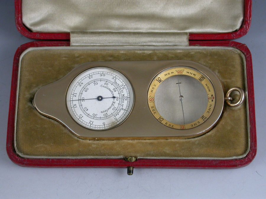 An extremely fine quality Edwardian cased 9 carat gold Opisometer or Map Measuring Tool combined with a Compass, the two glazed enamel dials calibrated for statute miles, kilometers and nautical miles to one side and inches to miles or versts and centimeters to kilometers on the other.