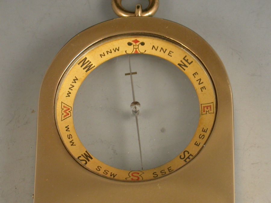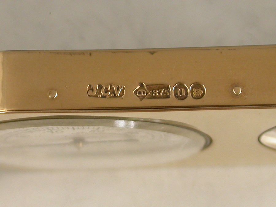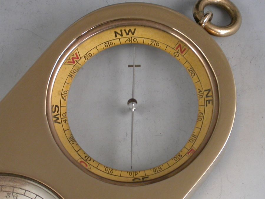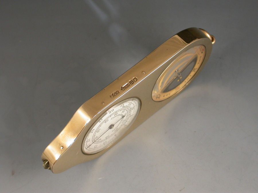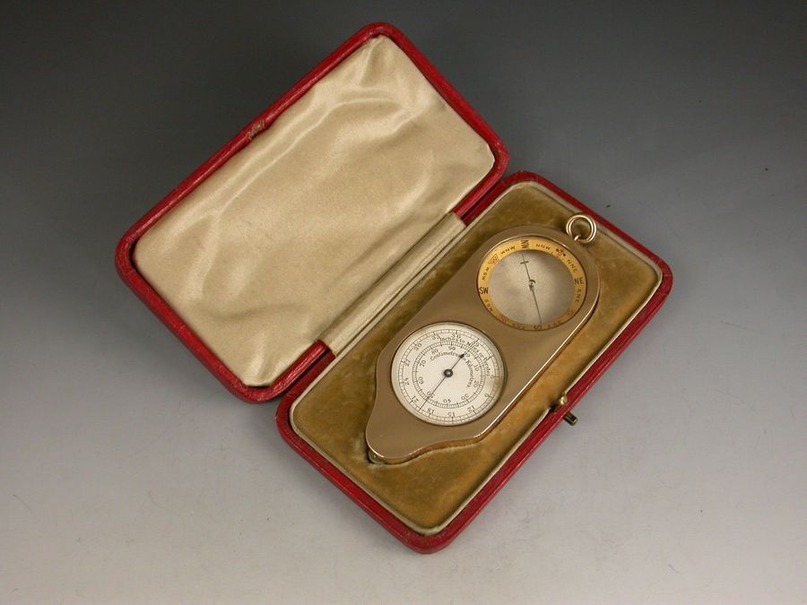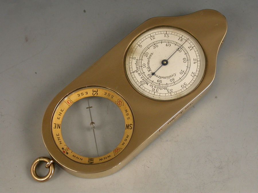 An extremely fine quality Edwardian cased 9 carat gold Opisometer or Map Measuring Tool combined with a Compass, the two glazed enamel dials calibrated for statute miles, kilometers and nautical miles to one side and inches to miles or versts and centimeters to kilometers on the other.