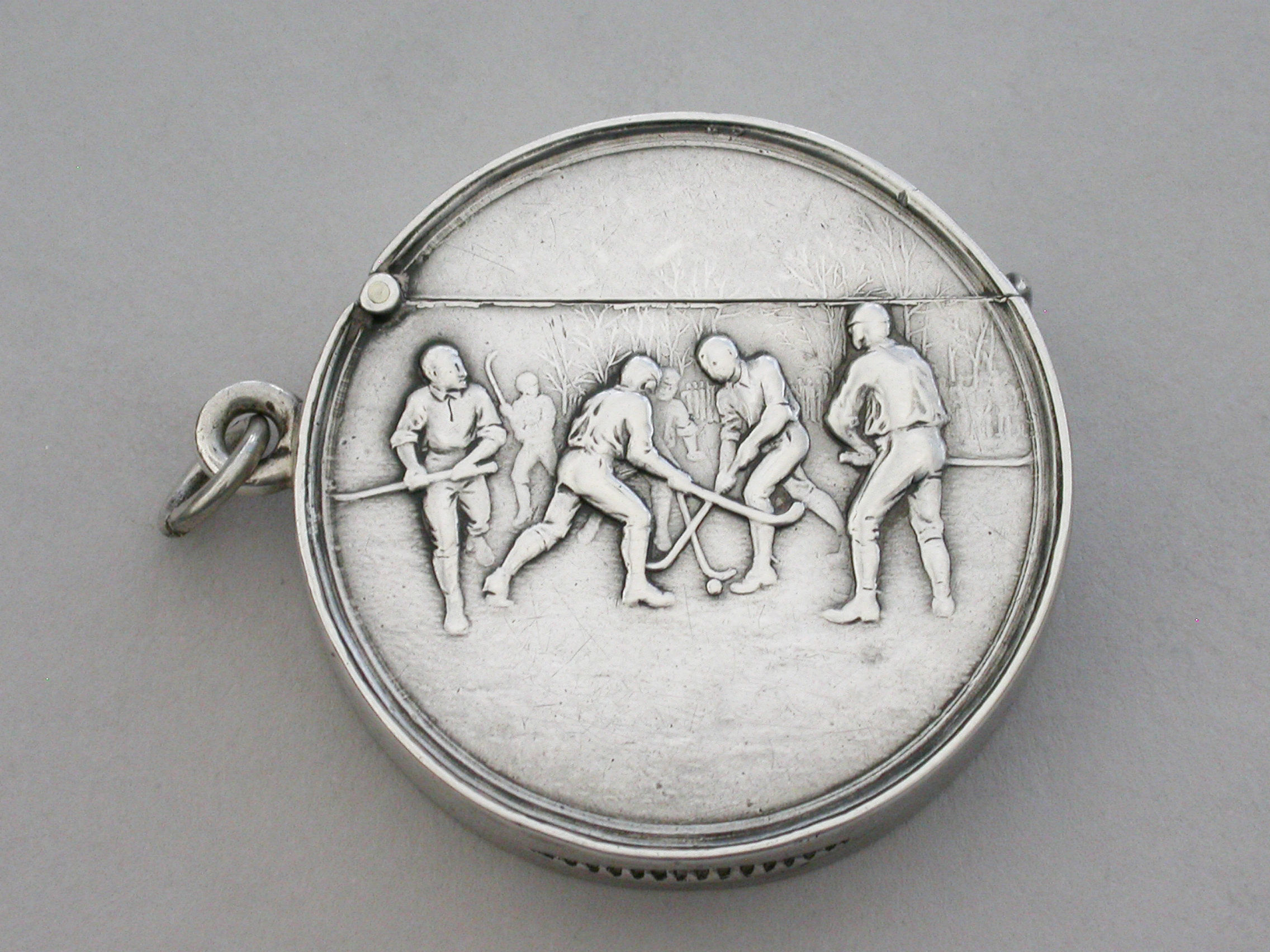 A rare Edwardian circular silver Vesta Case with hinged flip-top lid, the face die-struck with a scene depicting hockey players. A striker to the base and attached suspension ring.