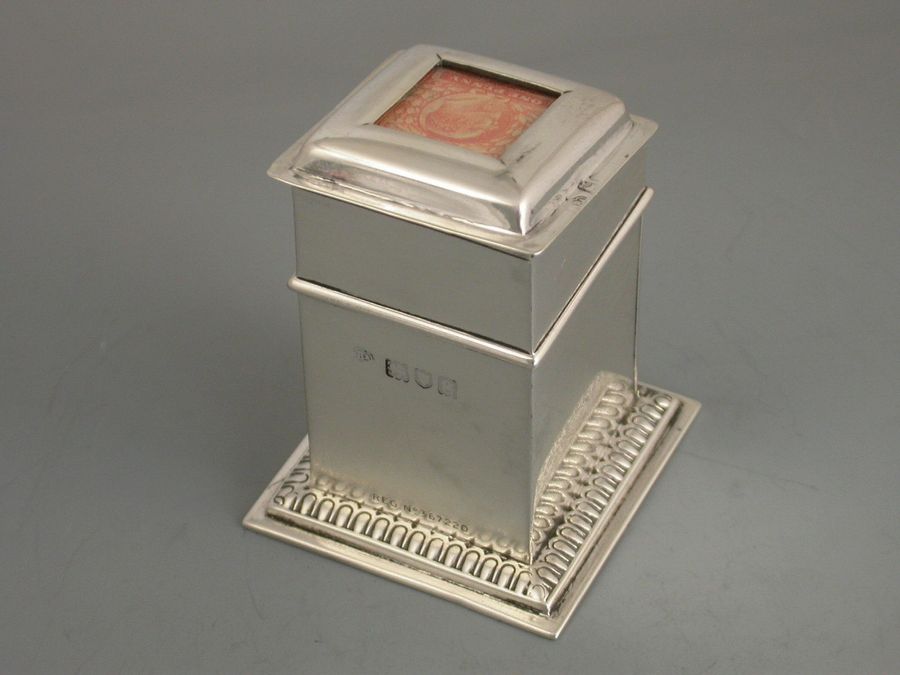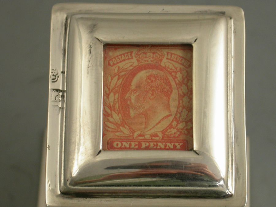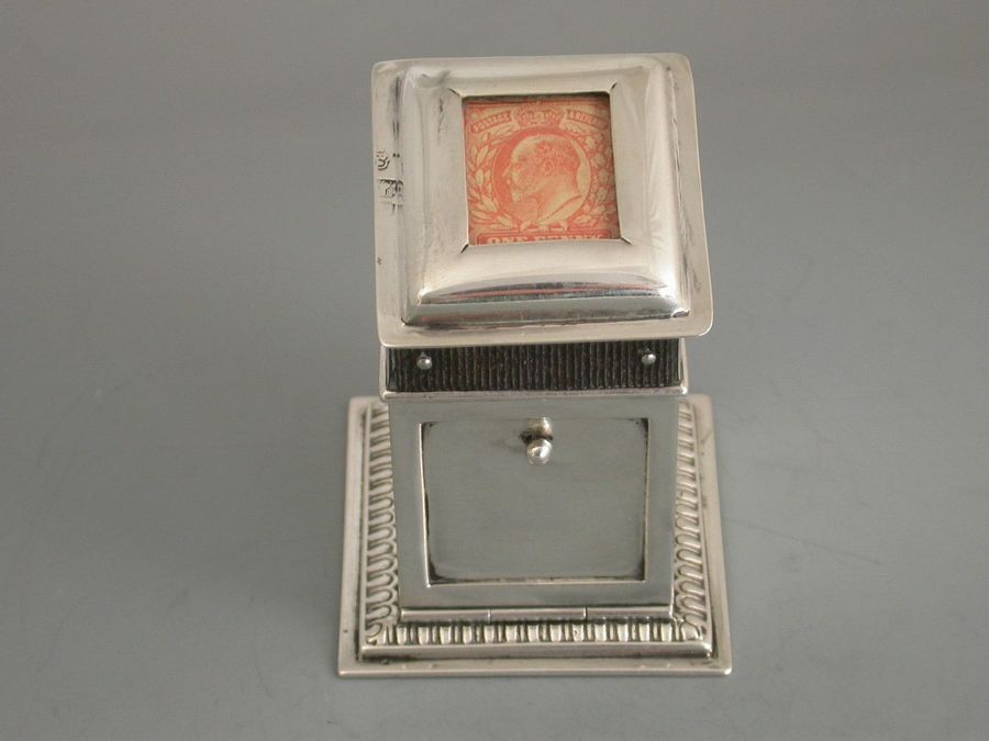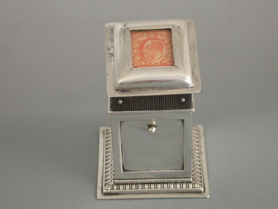 An extremely rare Edwardian silver Stamp Box combined with a Vesta Box, made in the form of a Davenport Desk, the pull out match box in the base with a steel striker above. The gilded stamp compartment in the top beneath a sloping lid with glass window protecting a one penny stamp, leather base and interior lid.