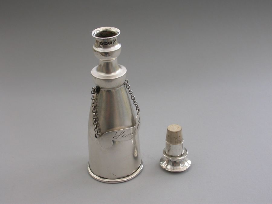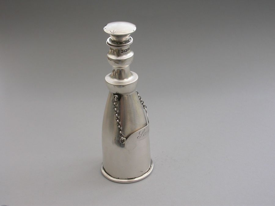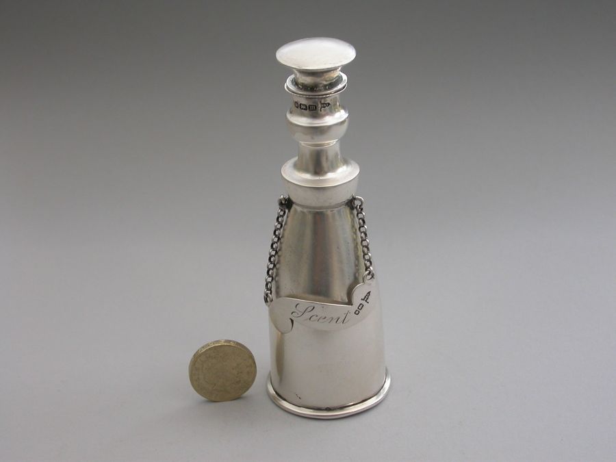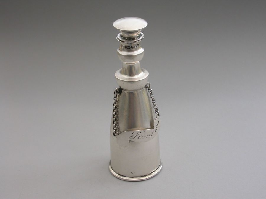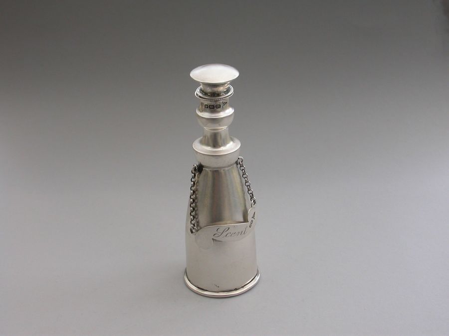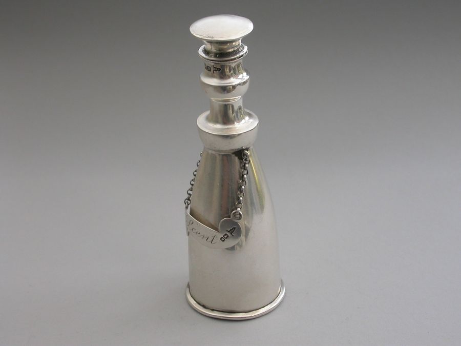 An unusual Edwardian silver Scent Bottle made in the form of a Wine or Spirit Decanter complete with attached scroll shaped label incised for ""Scent"". Pull-off silver mounted cork stopper.