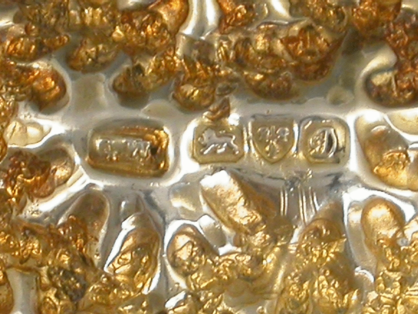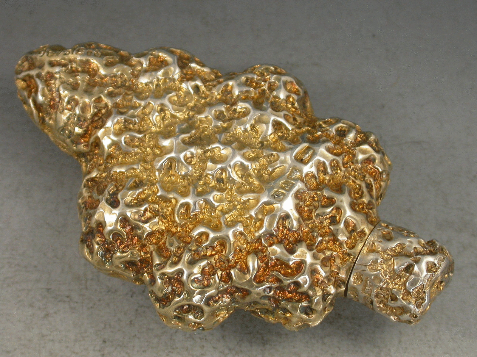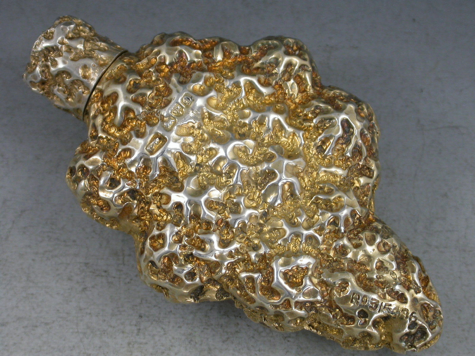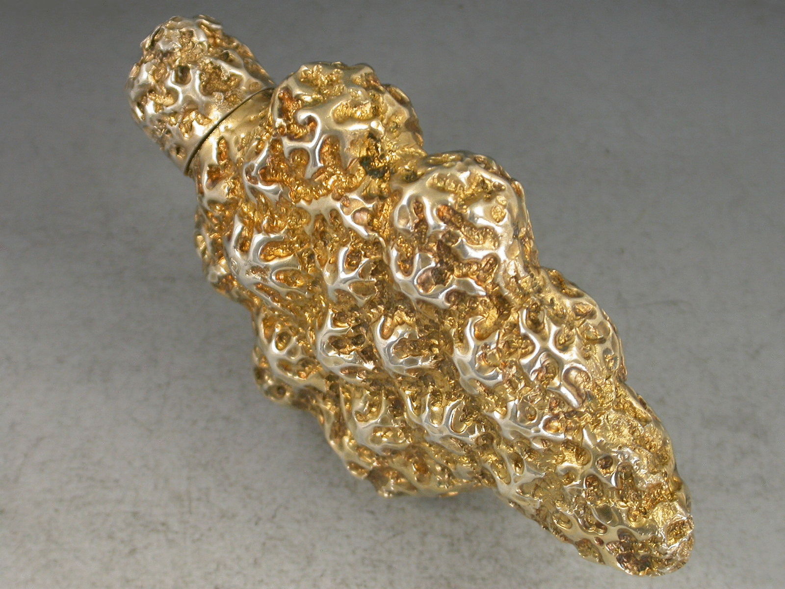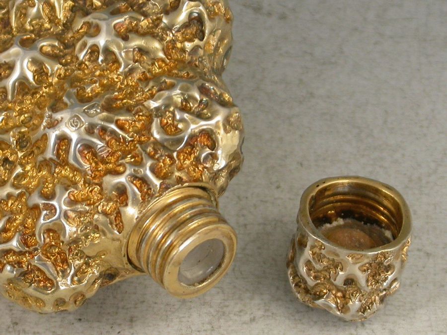 An interesting Edwardian silver gilt novelty Scent Bottle formed as a golden nugget, with internal glass liner.