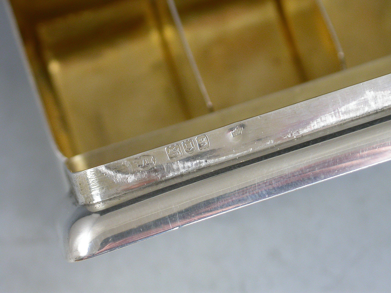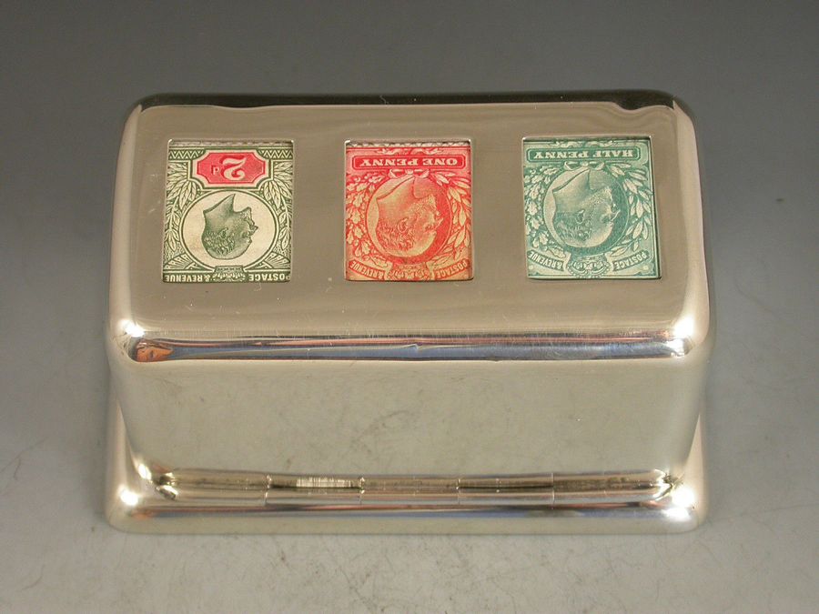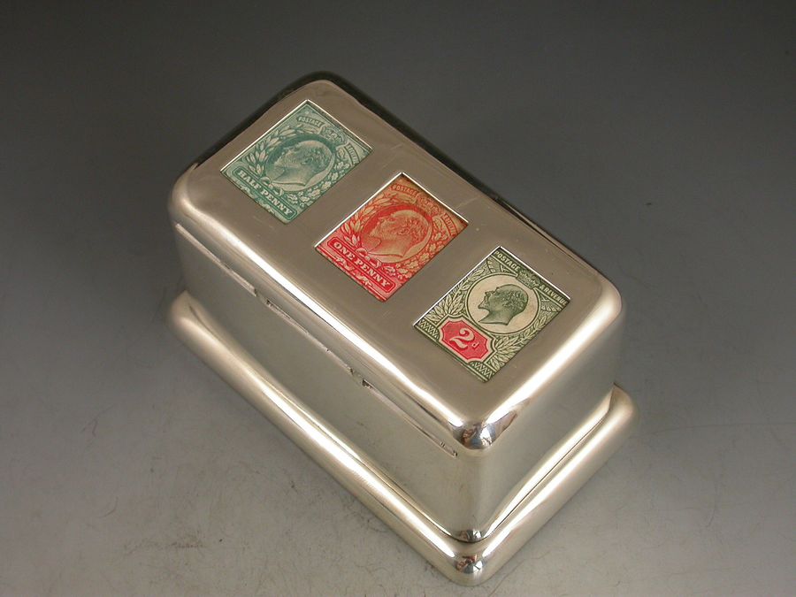 A rare large Edwardian silver triple coil dispenser Stamp Box of curved rectangualr form on pedestal base, the hinged box opening to reveal three gilded compartments that would of held coils of stamps dispensed through slots in the lid. The three windows to the lid now holding single Edwardian half penny, one penny and two penny stamps.