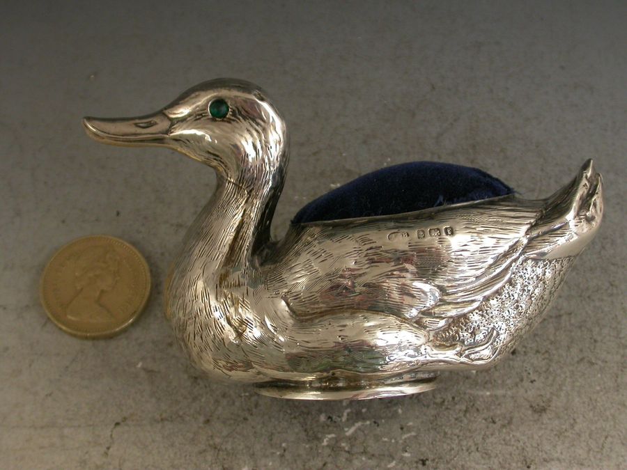 A rare Edwardian novelty silver Pin Cushion of unusually large size, made in the form of a swimming Duck with up-turned tail, complete with emerald green glass eyes and blue velvet cushion. Realistically modelled complete with trailing webbed feet (unlike the smaller model).