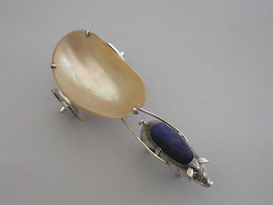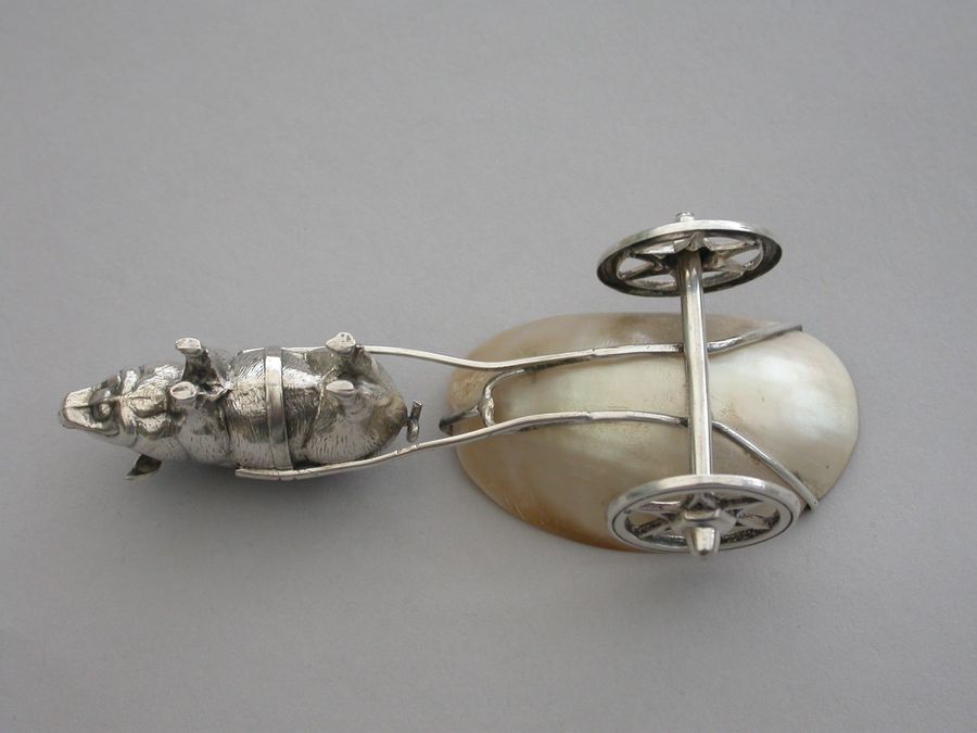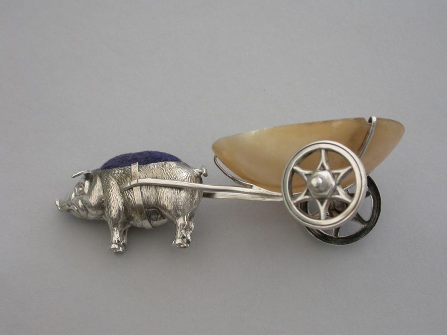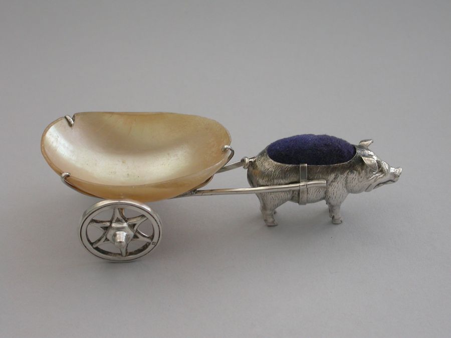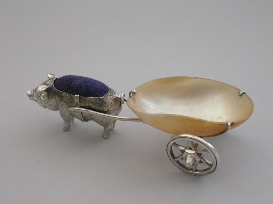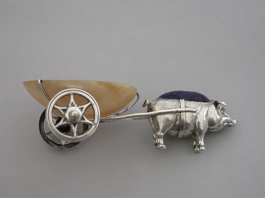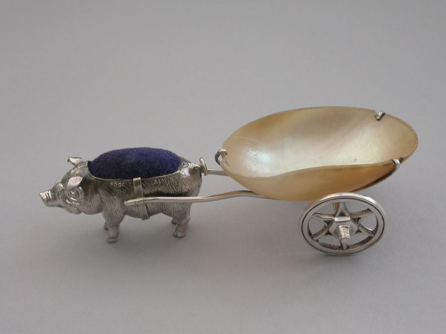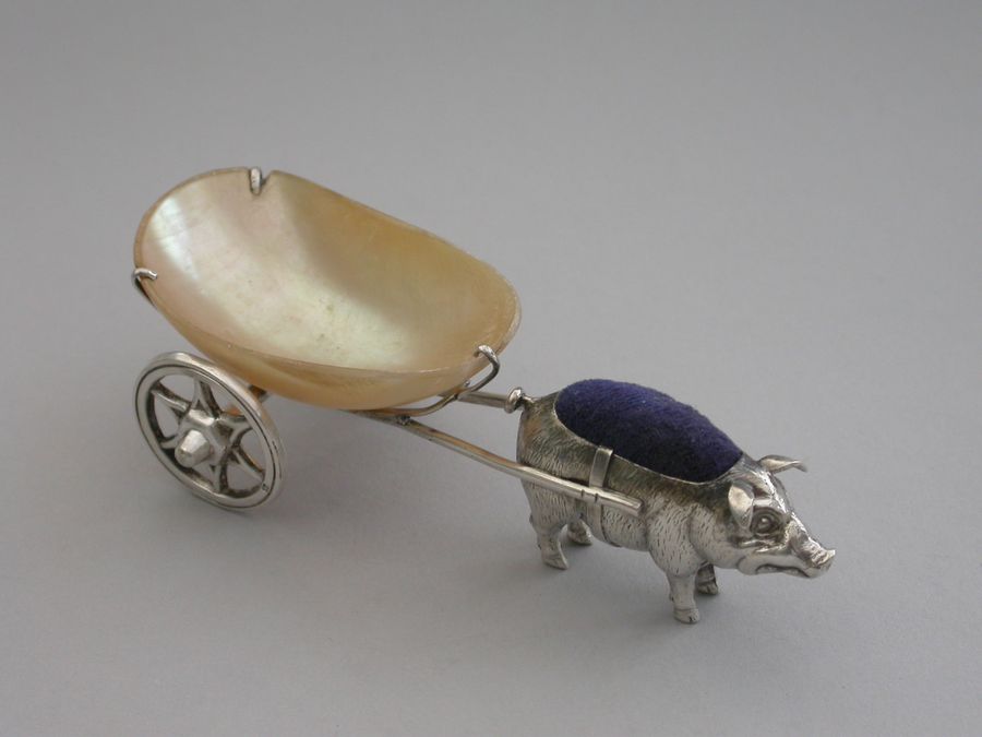 A rare Edwardian Novelty silver Pin Cushion made in the form of a Pig pulling a Mother of Pearl Cart with two wheels. Complete with blue velvet cushion.