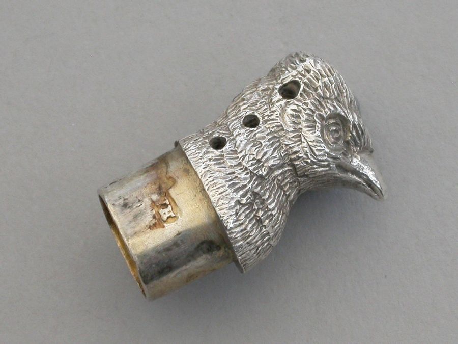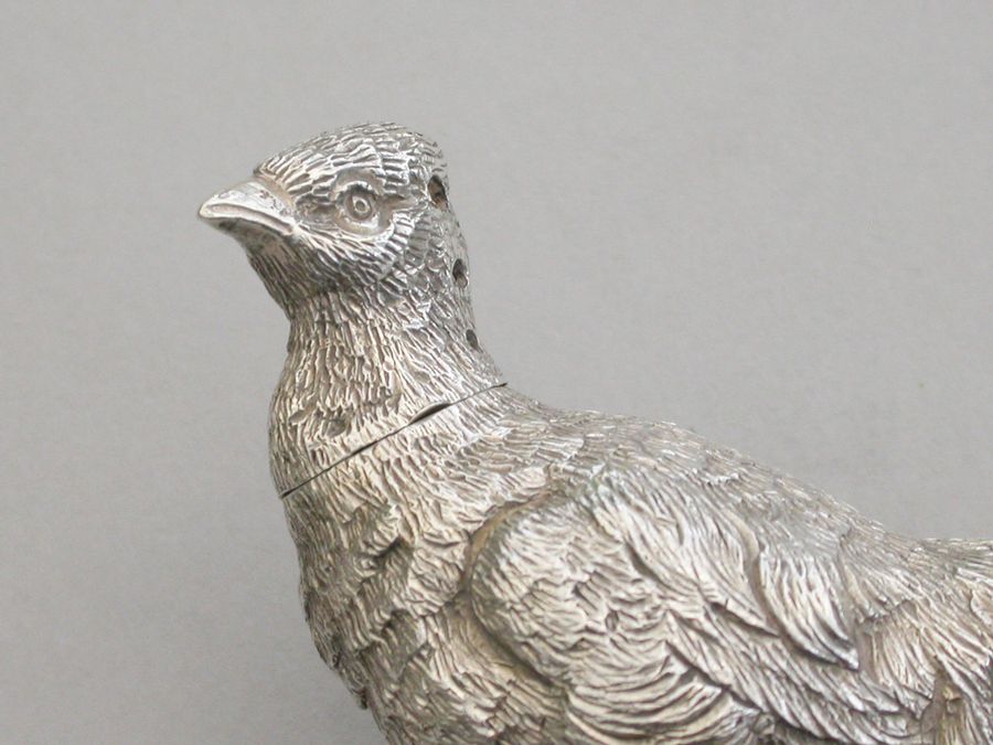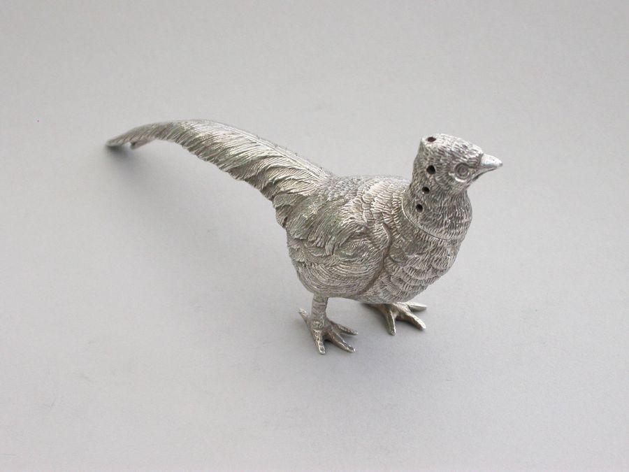 A good quality Edwardian novelty cast silver Pepper, made in the form of a Cock Pheasant, with pull-off pierced head.