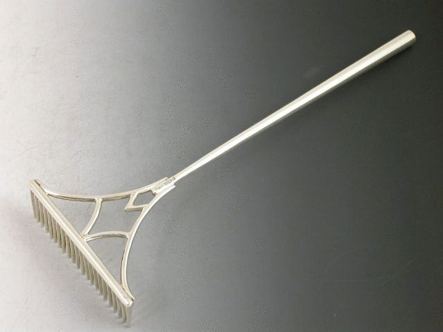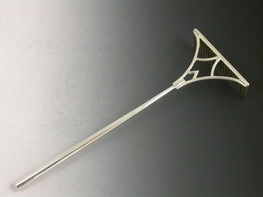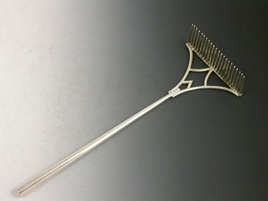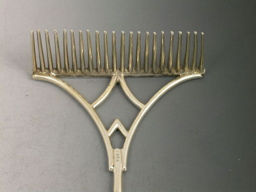 A very unusual Edwardian silver novelty Comb? Modelled as a wooden Garden Rake, of heavy gauge and not unsubstantial proportion. Its purpose unknown.