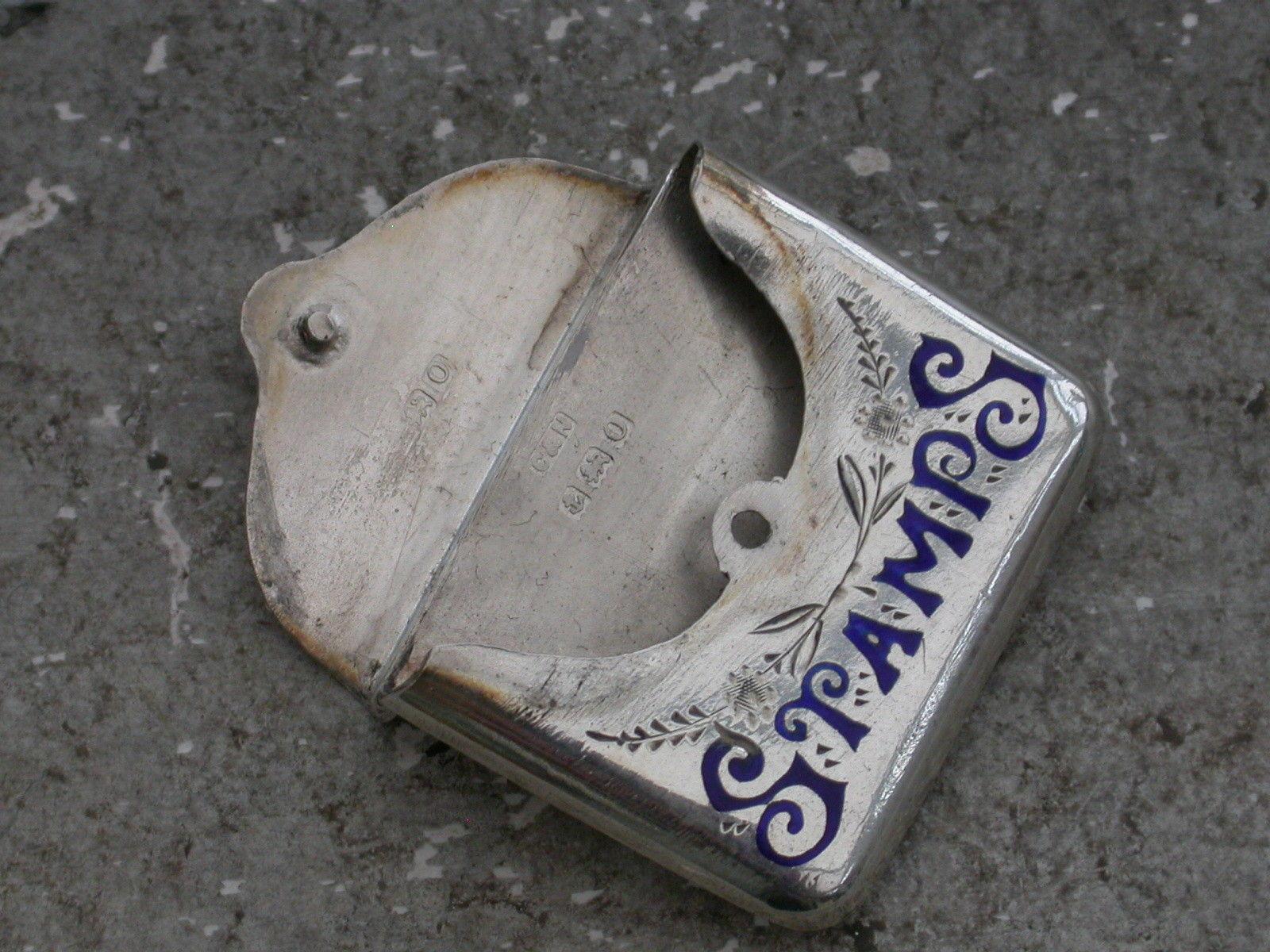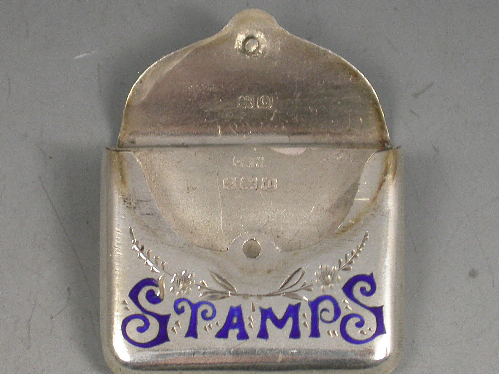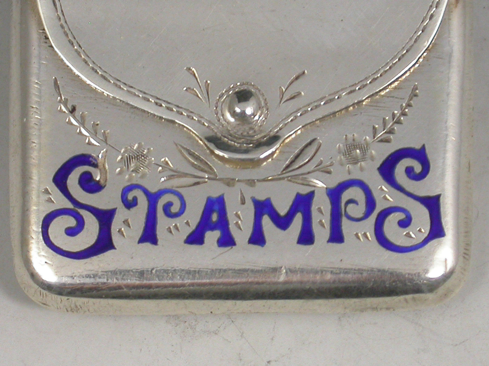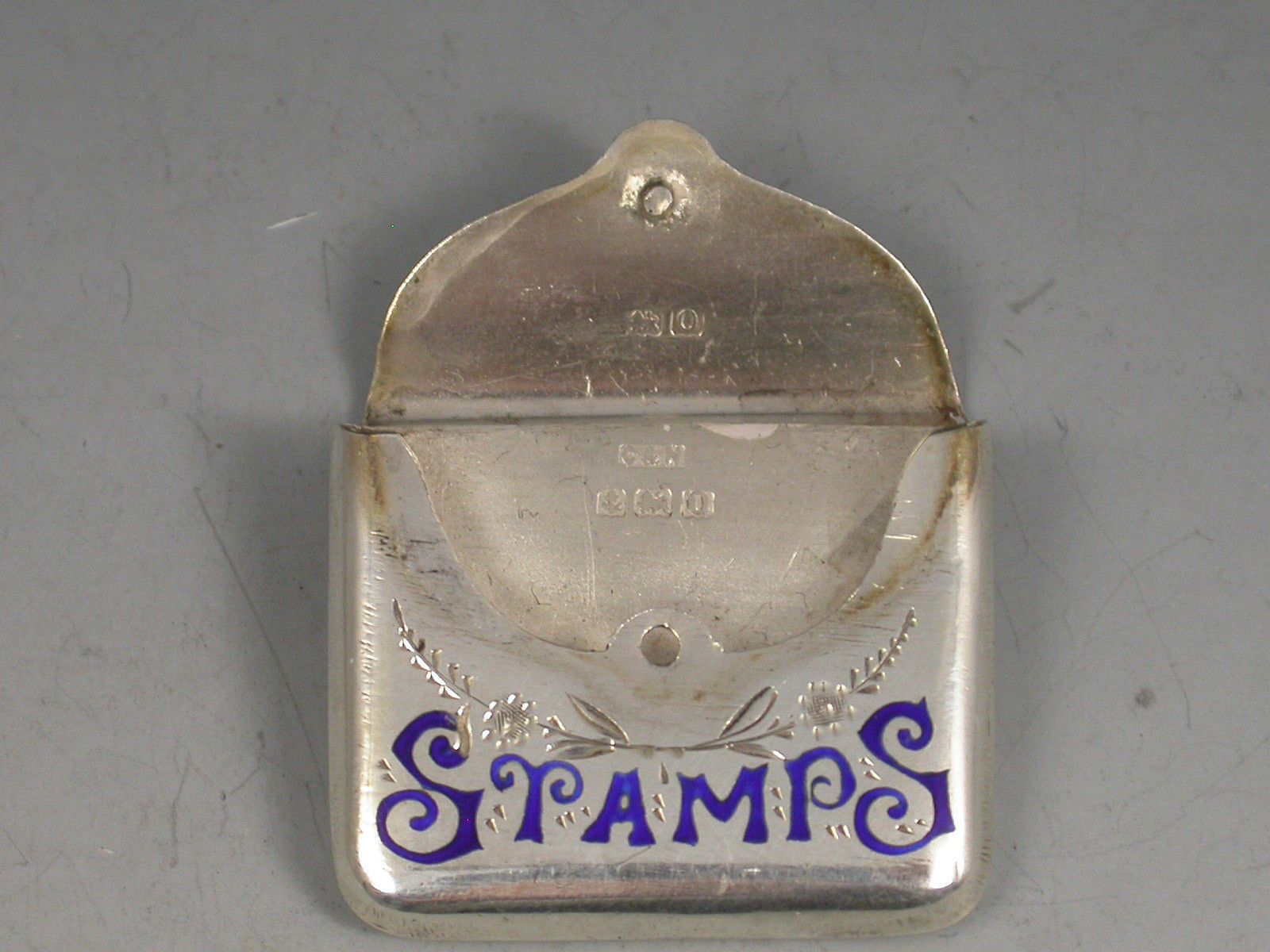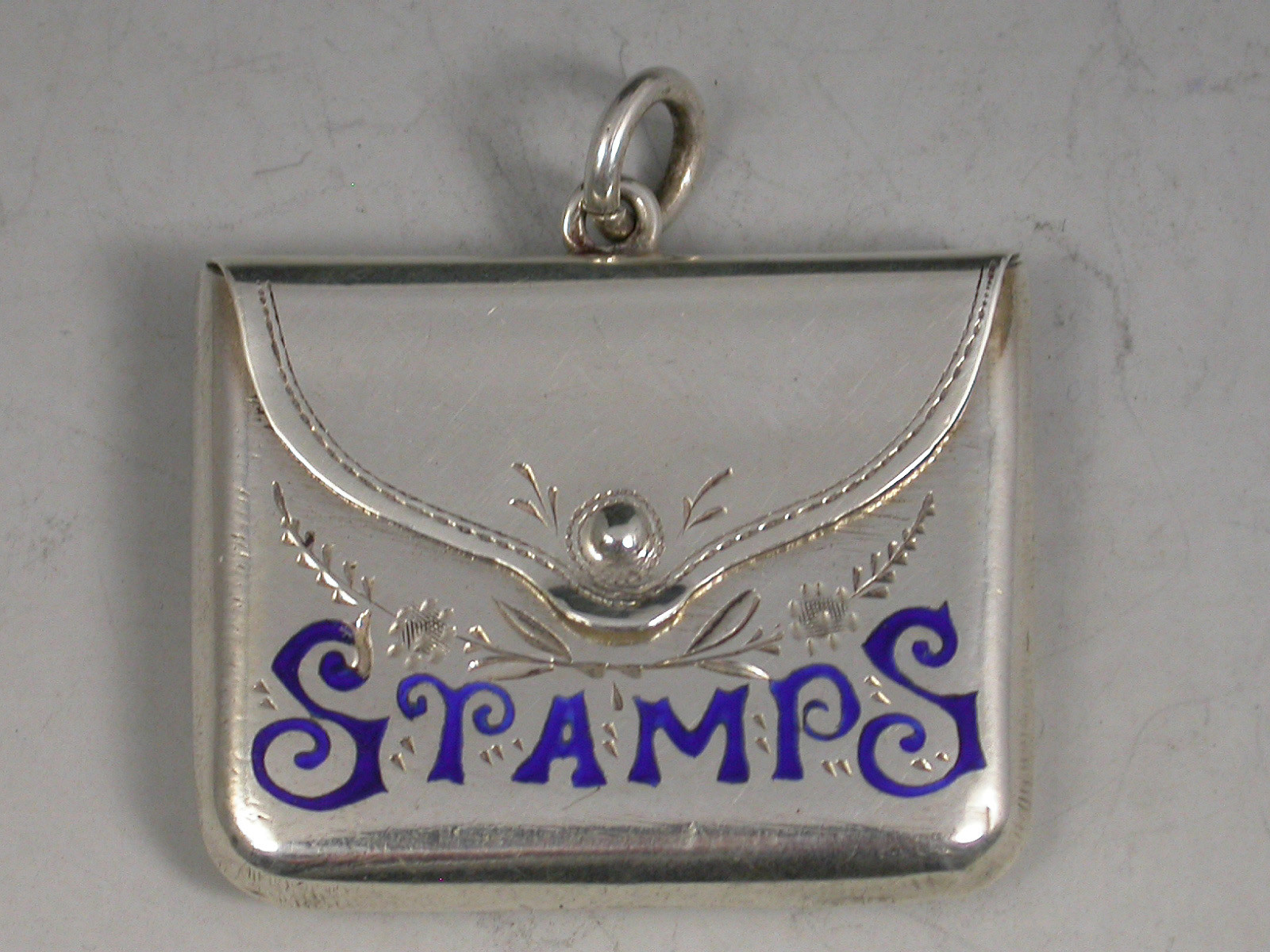 A good Edwardian novelty silver Stamp Case of envelope form with hinged lid and attached suspension ring, the body with engraved foliate decoration and the word 'Stamps' highlighted in dark blue enamel.
