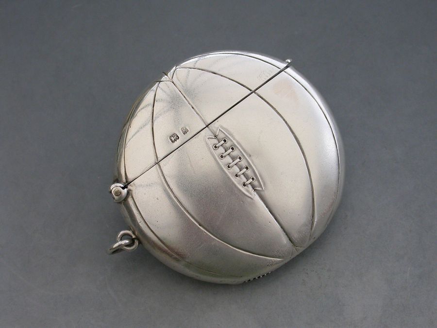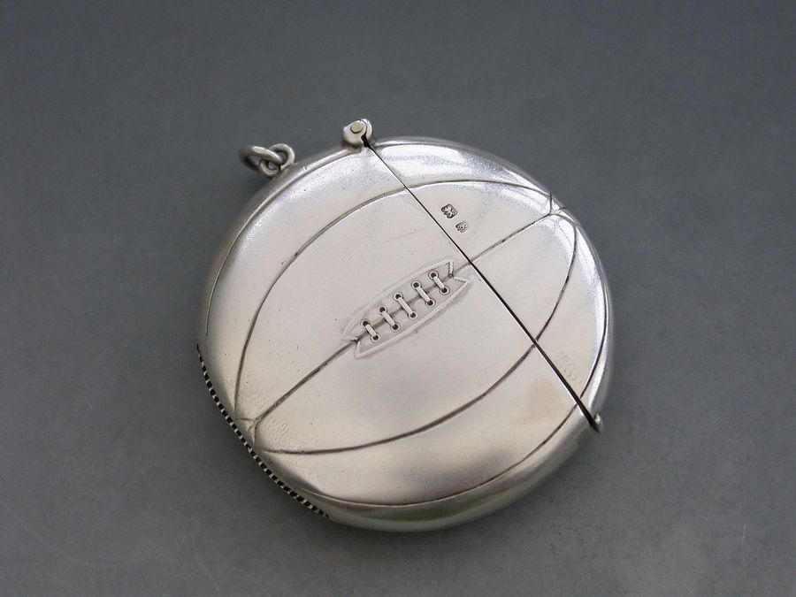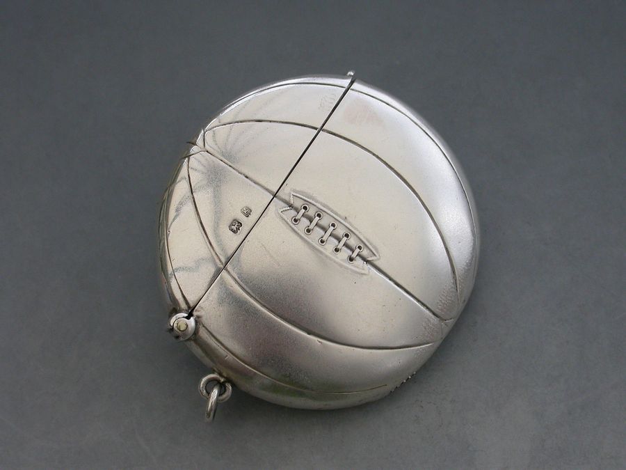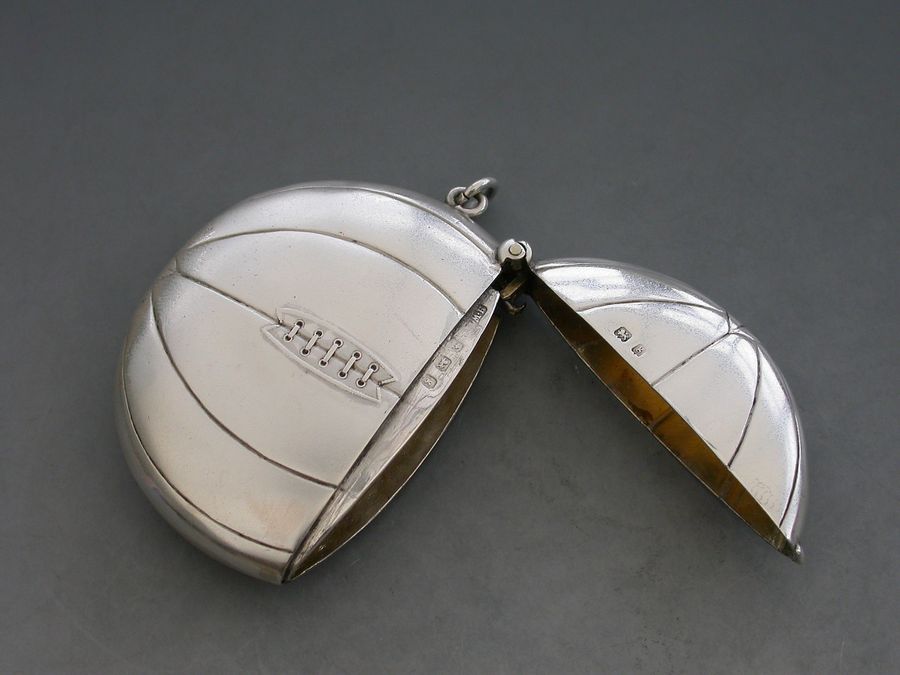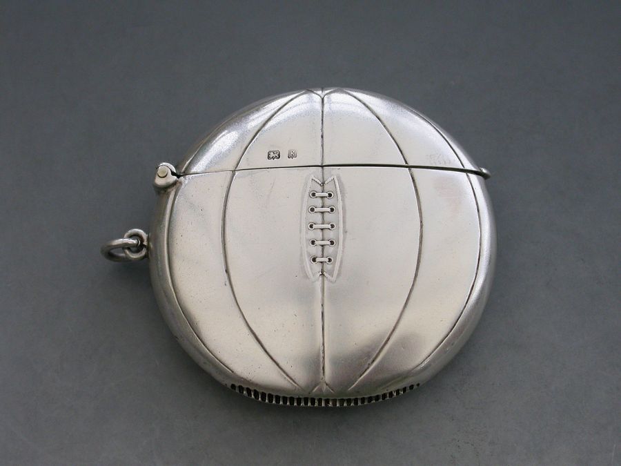 A rare Victorian novelty silver Vesta Case, made in the form of a leather Association Football, with realistic engraved lace and panel detail.