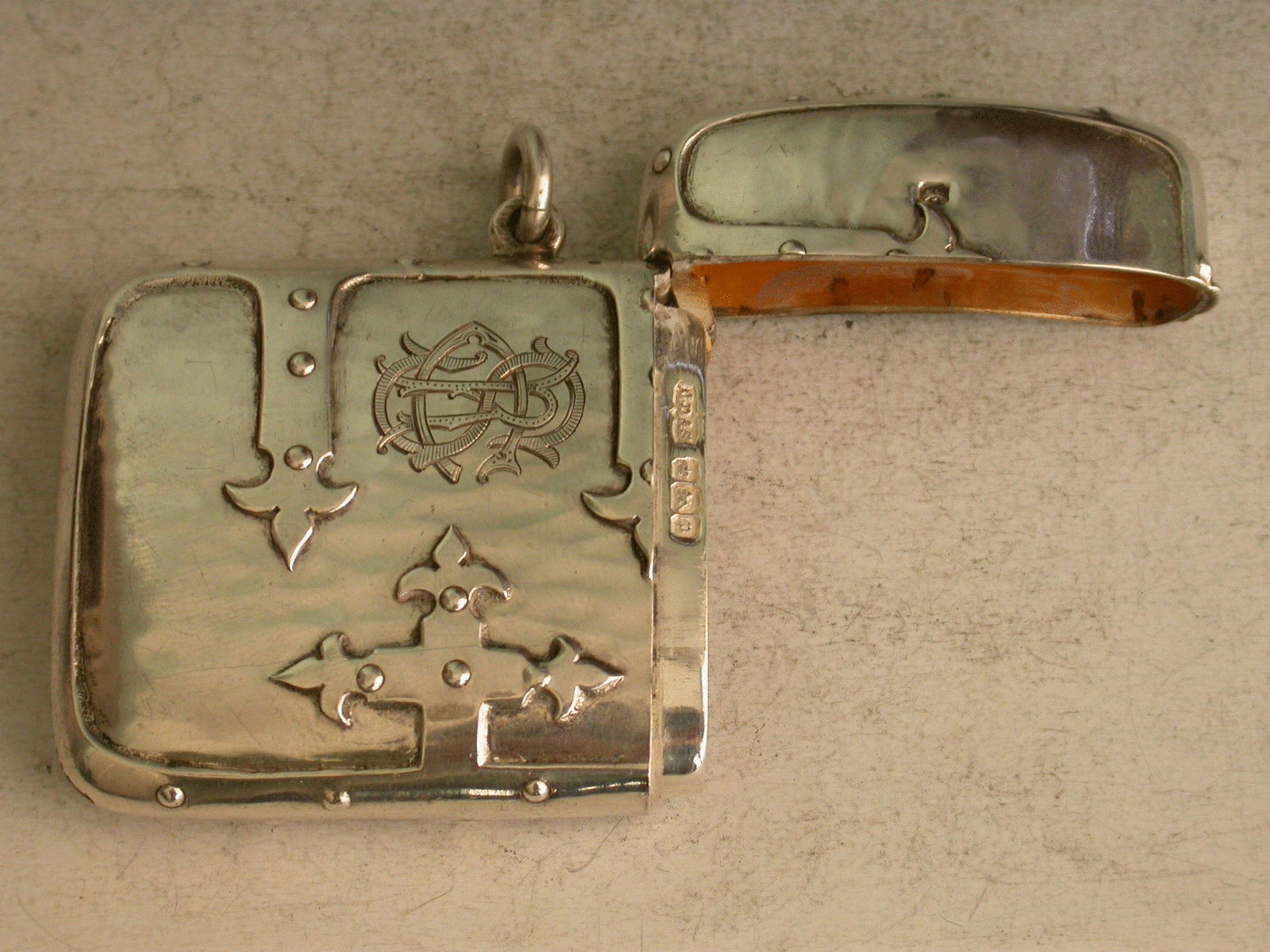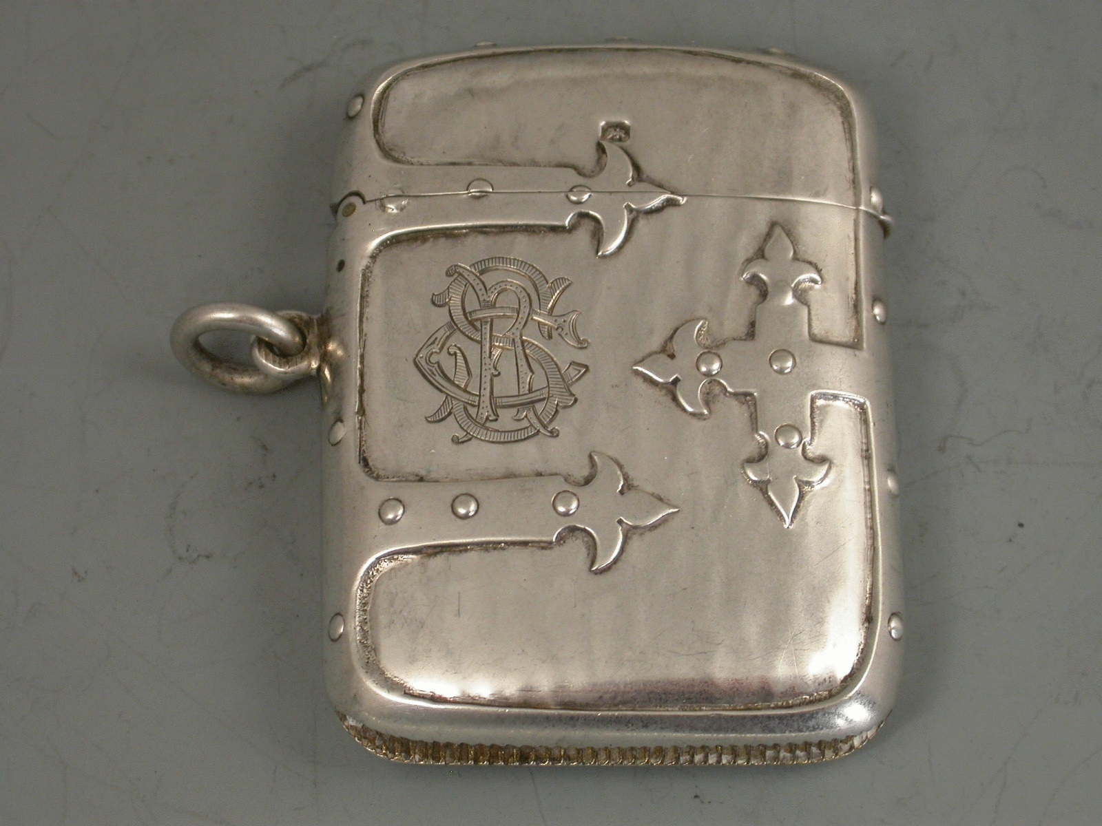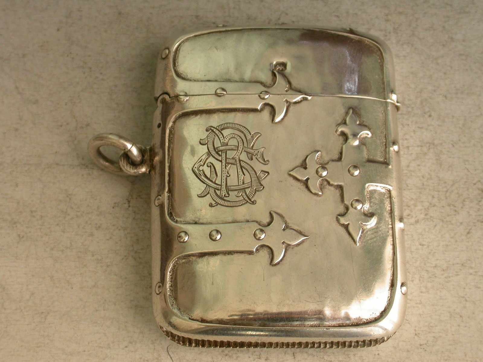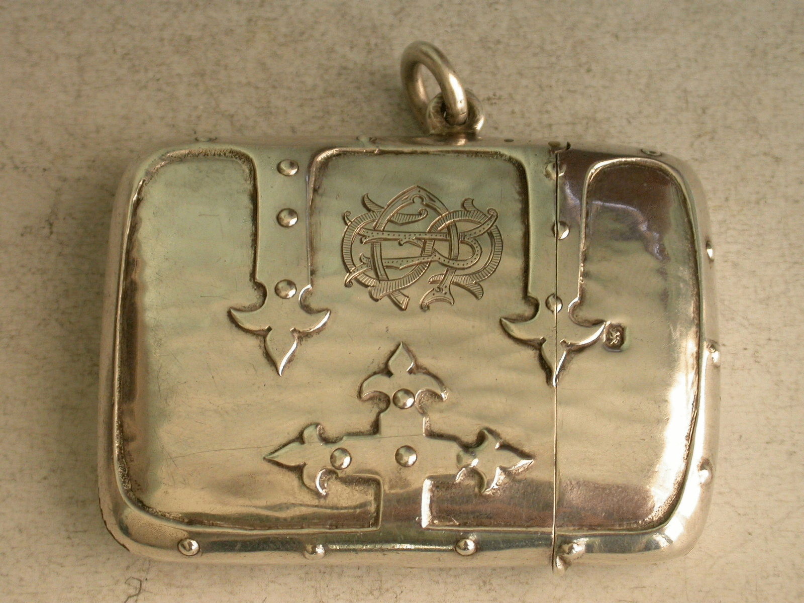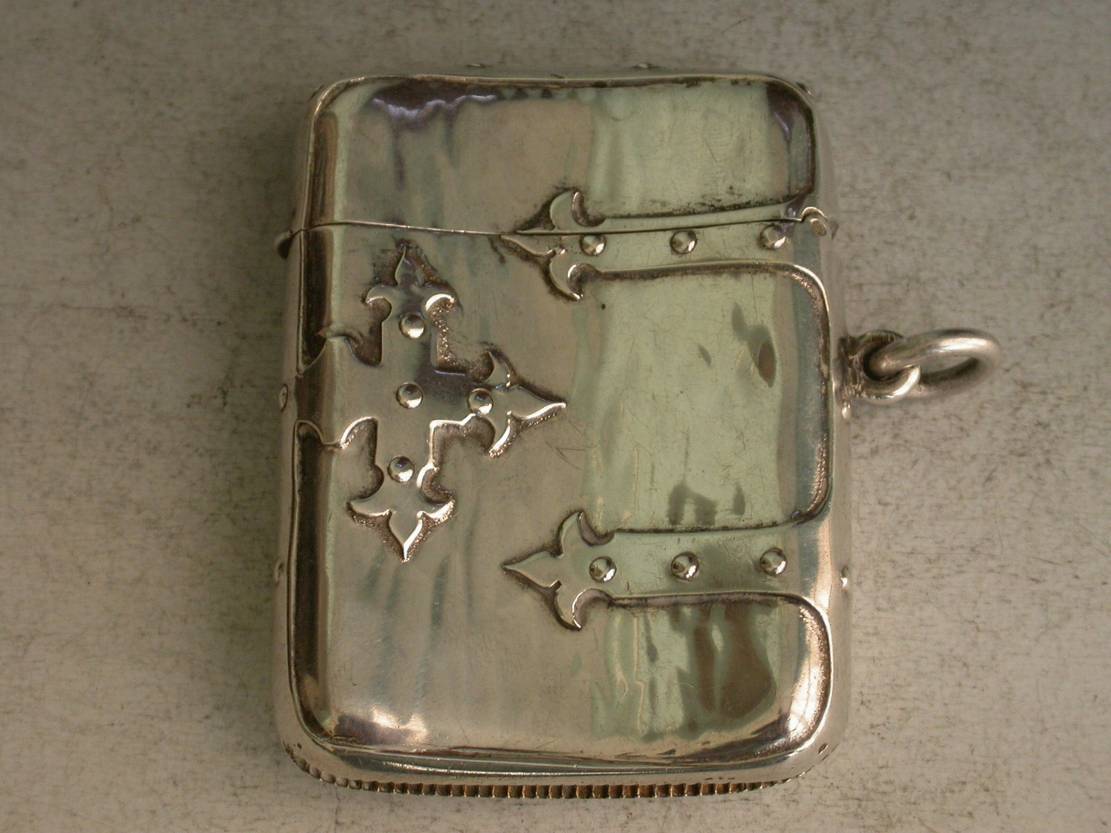 An Edwardian novelty silver Vesta Case of large size, made in the form of a Bible with textured surface and simulated iron strap work, engraved with contemporary monogram RCS. Attached suspension ring and silver gilt interior.