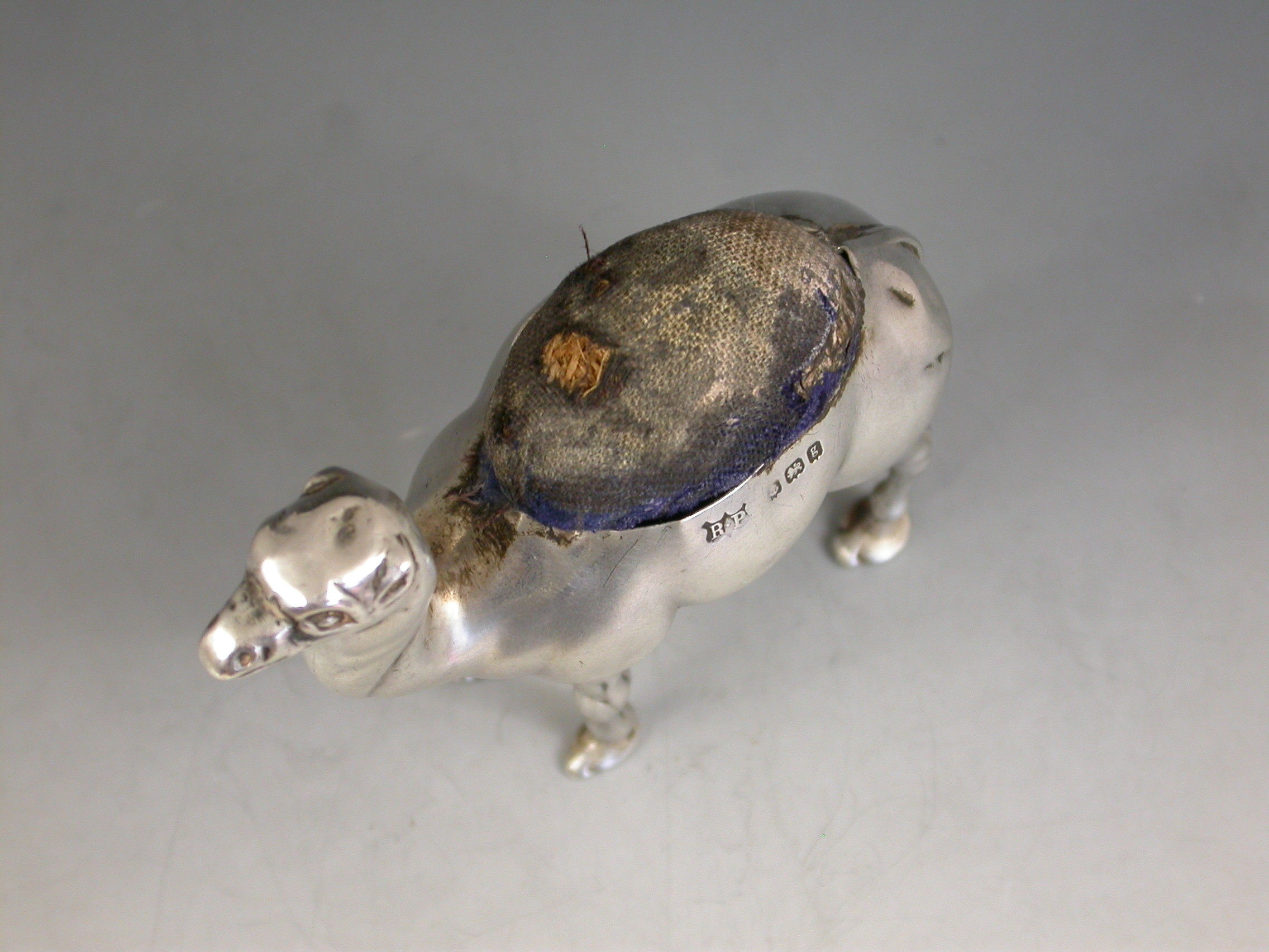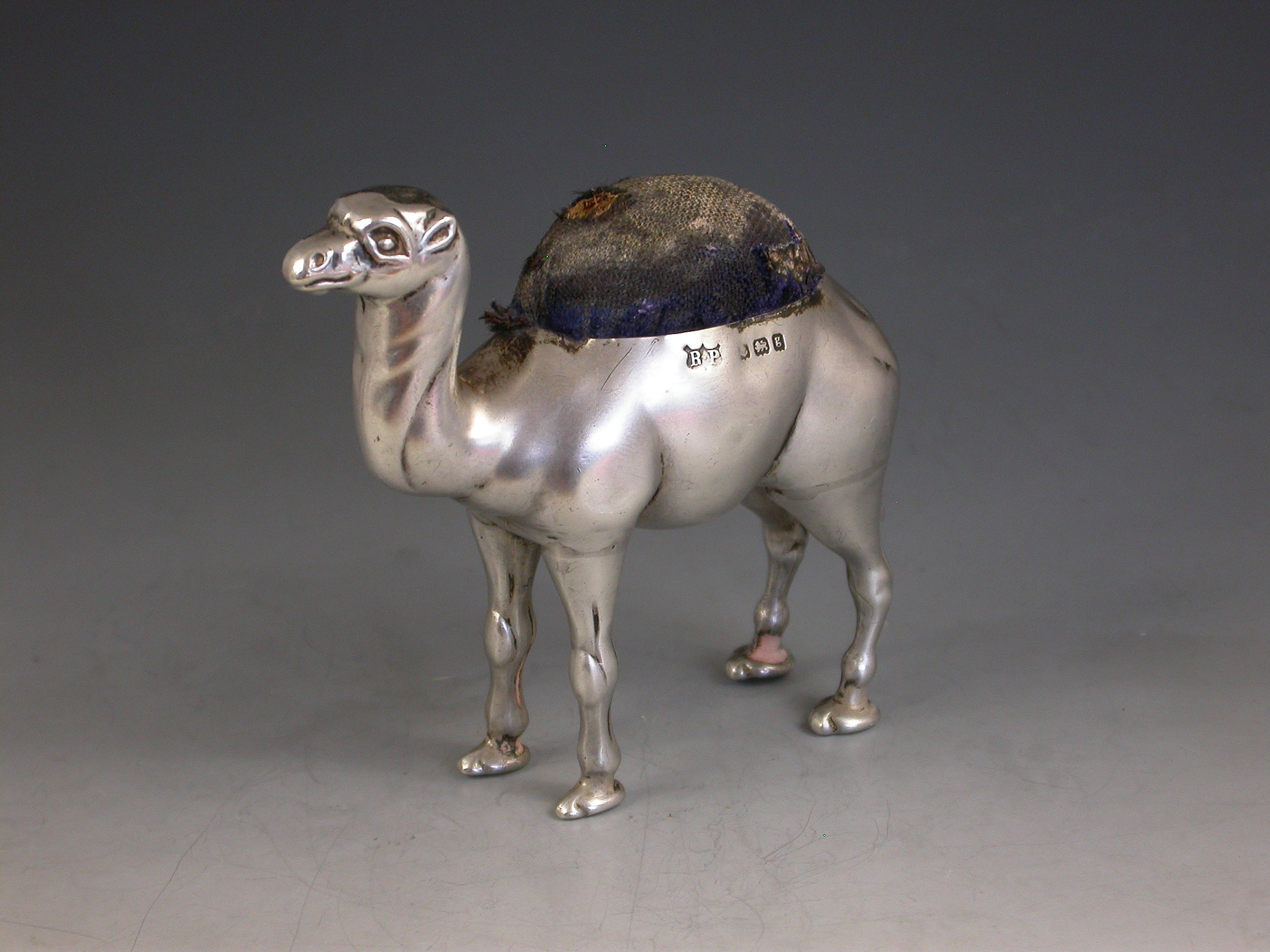 A rare Edwardian silver Pin Cushion modelled as a standing Camel. Complete with original blue velvet cushion.