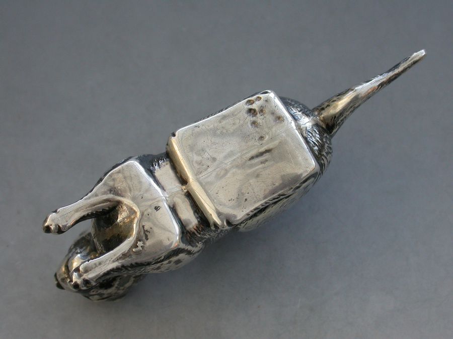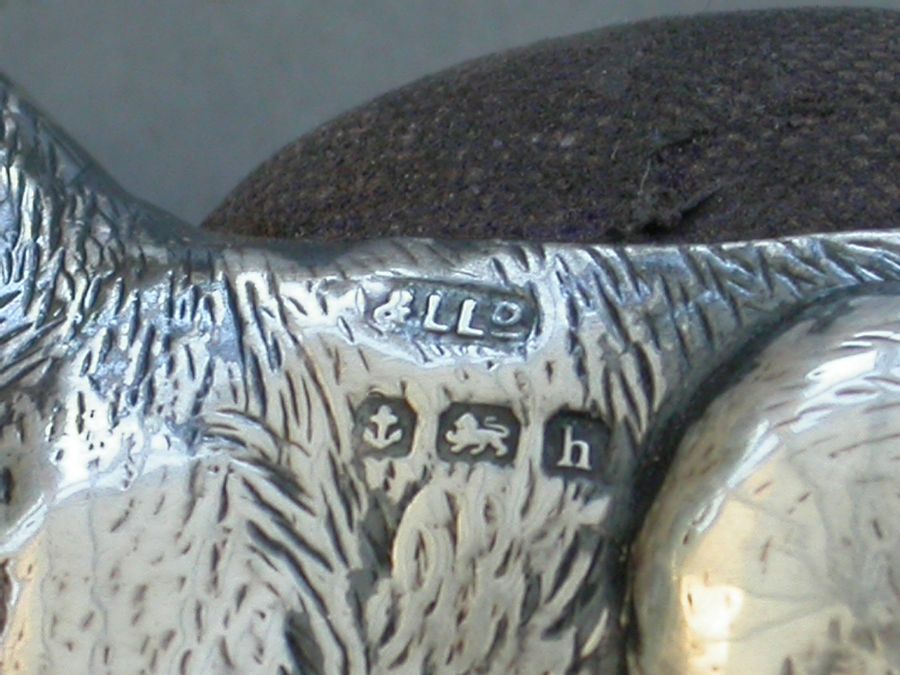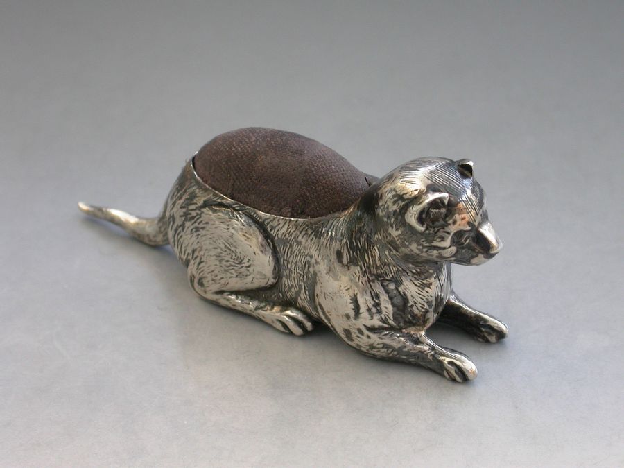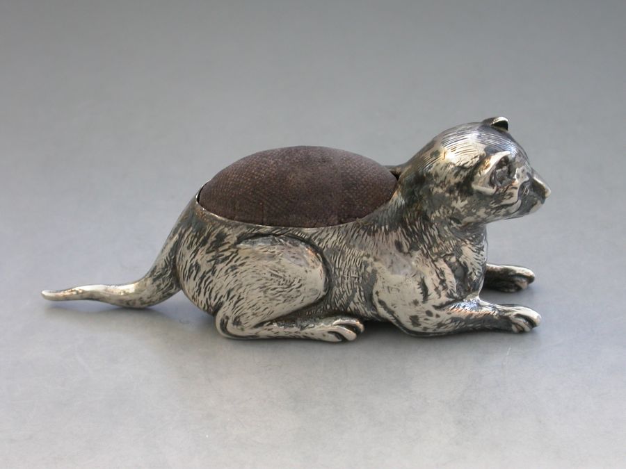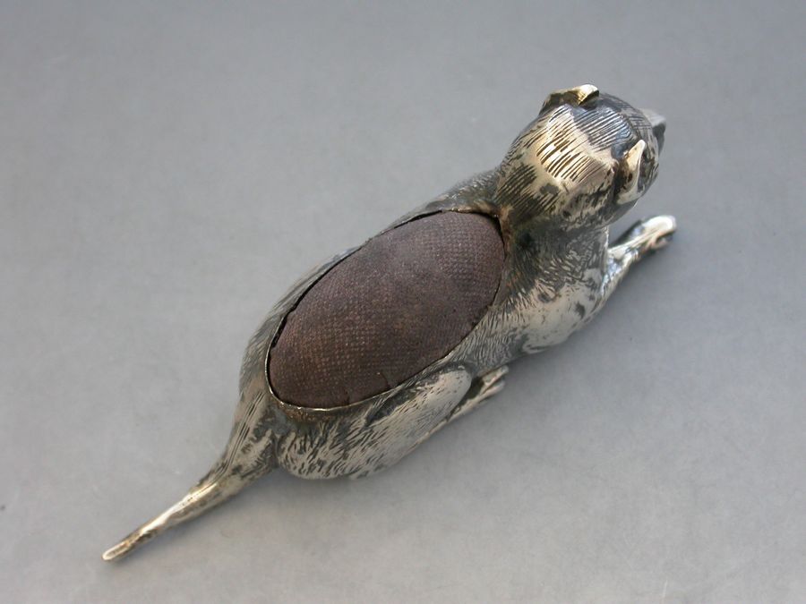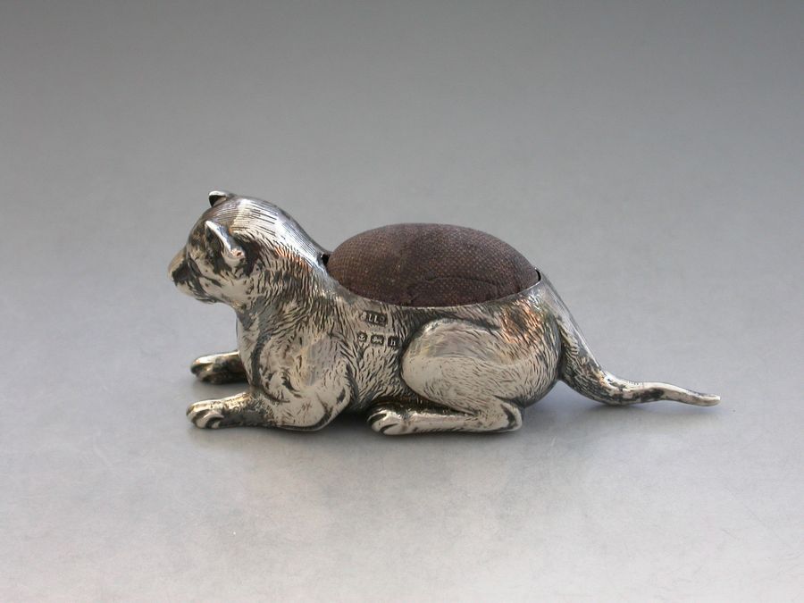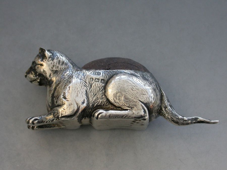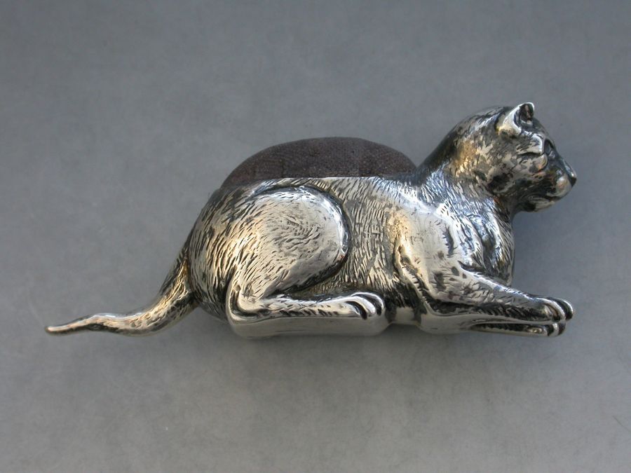 An extremely rare Edwardian novelty silver Pin Cushion made in the form of a crouching cat and realistically modeled. Complete with original cushion
