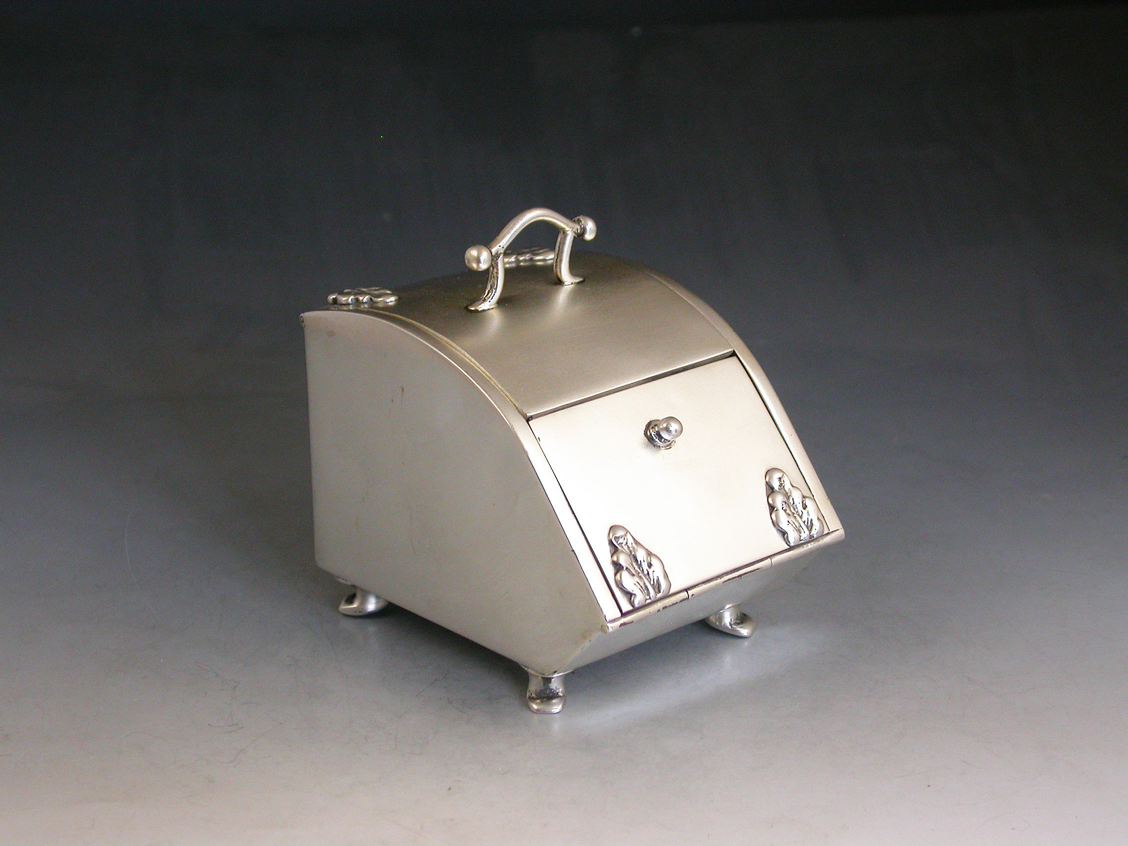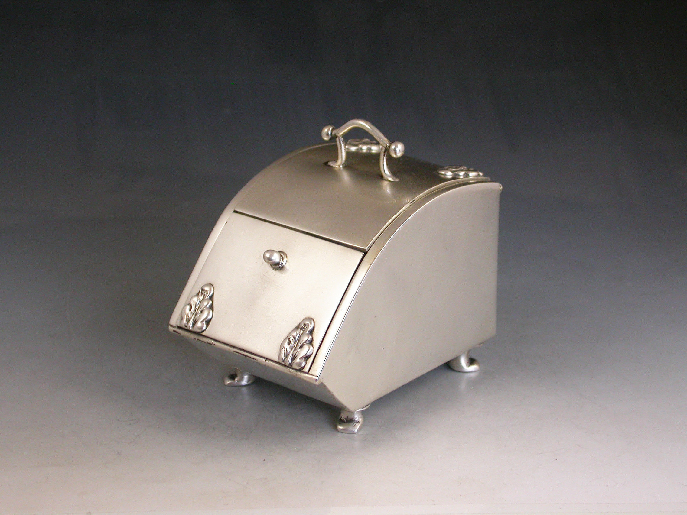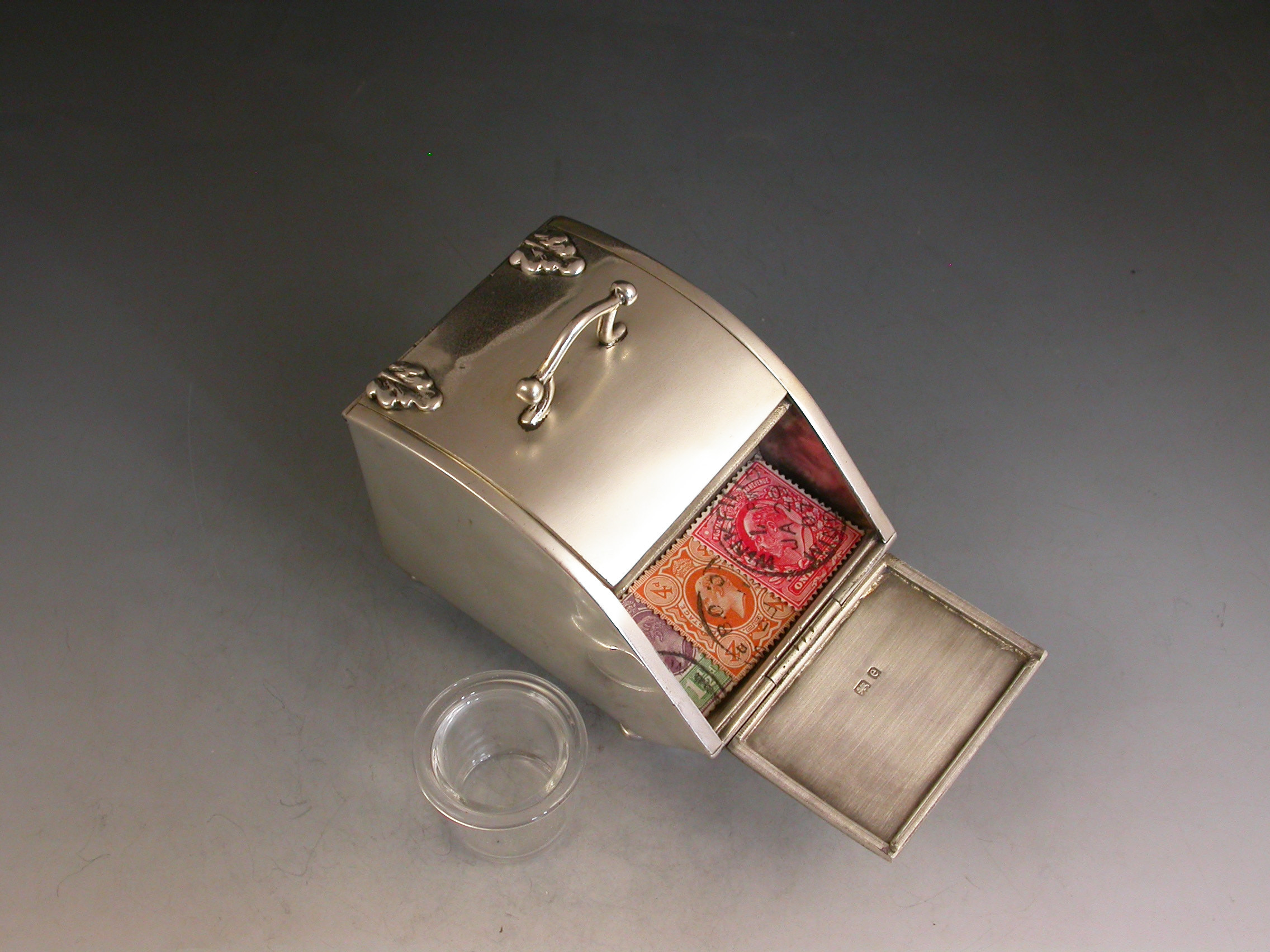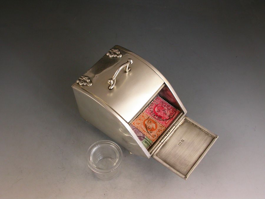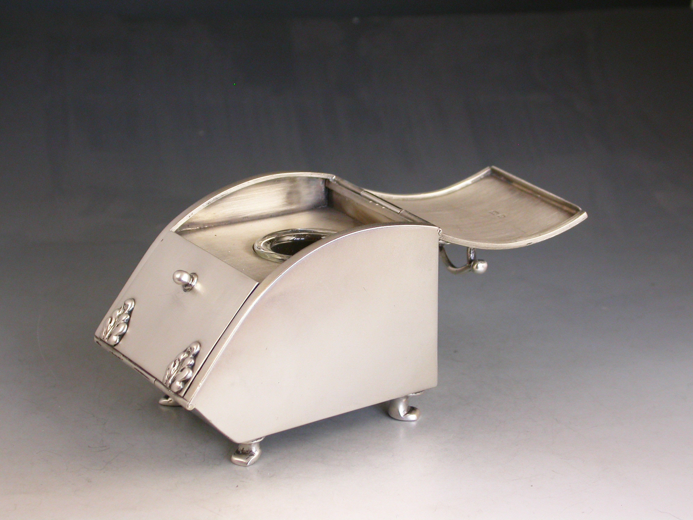 A rare Edwardian novelty silver combined Ink Well and Stamp Box made in the form of a Coal Scuttle standing on four paw feet, a hinged lid at the top with applied leaves simulating hinges and opening to reveal a single glass inkwell, another hinged lid at the front also with applied leaves opening to a single slopped stamp compartment.