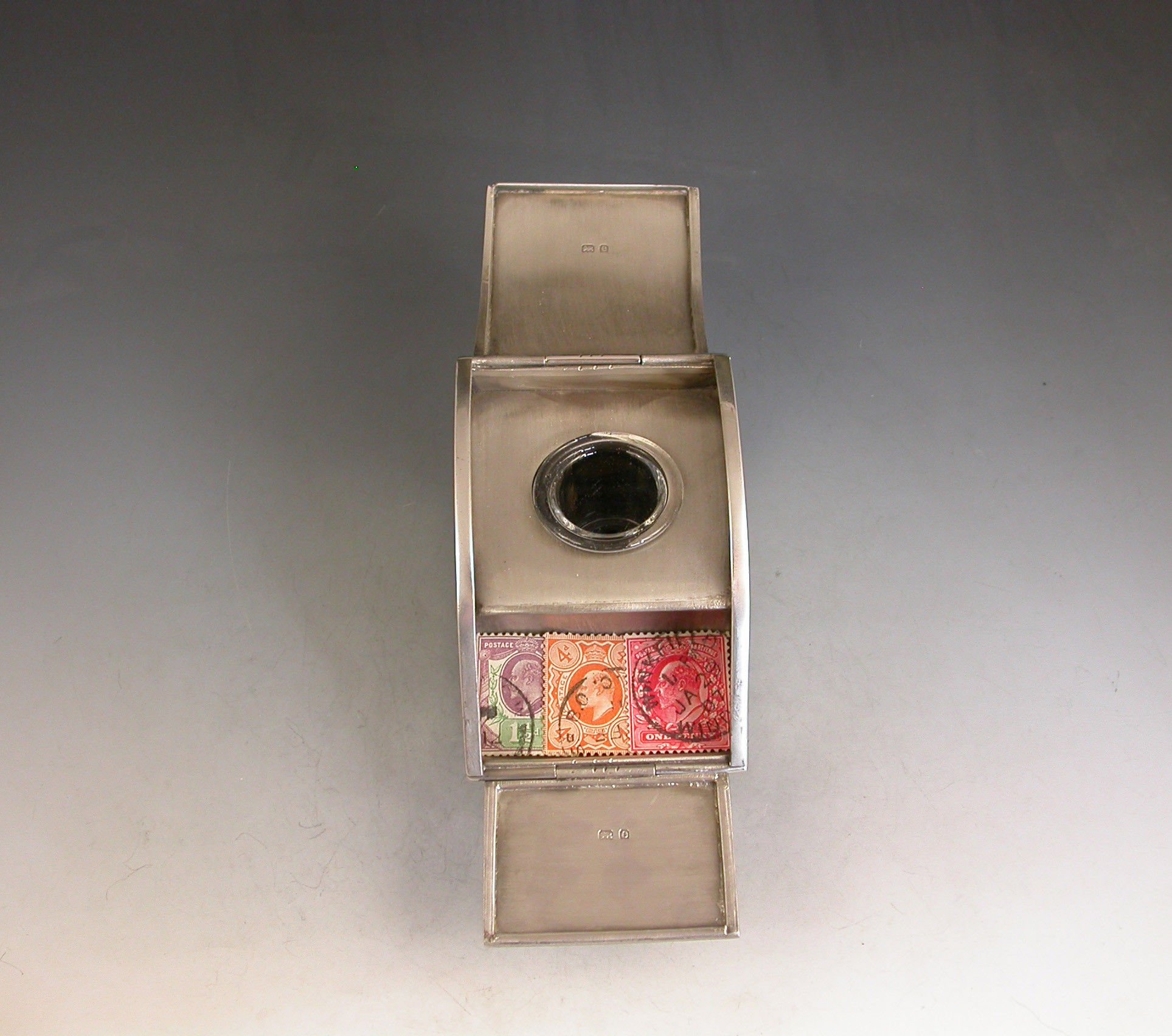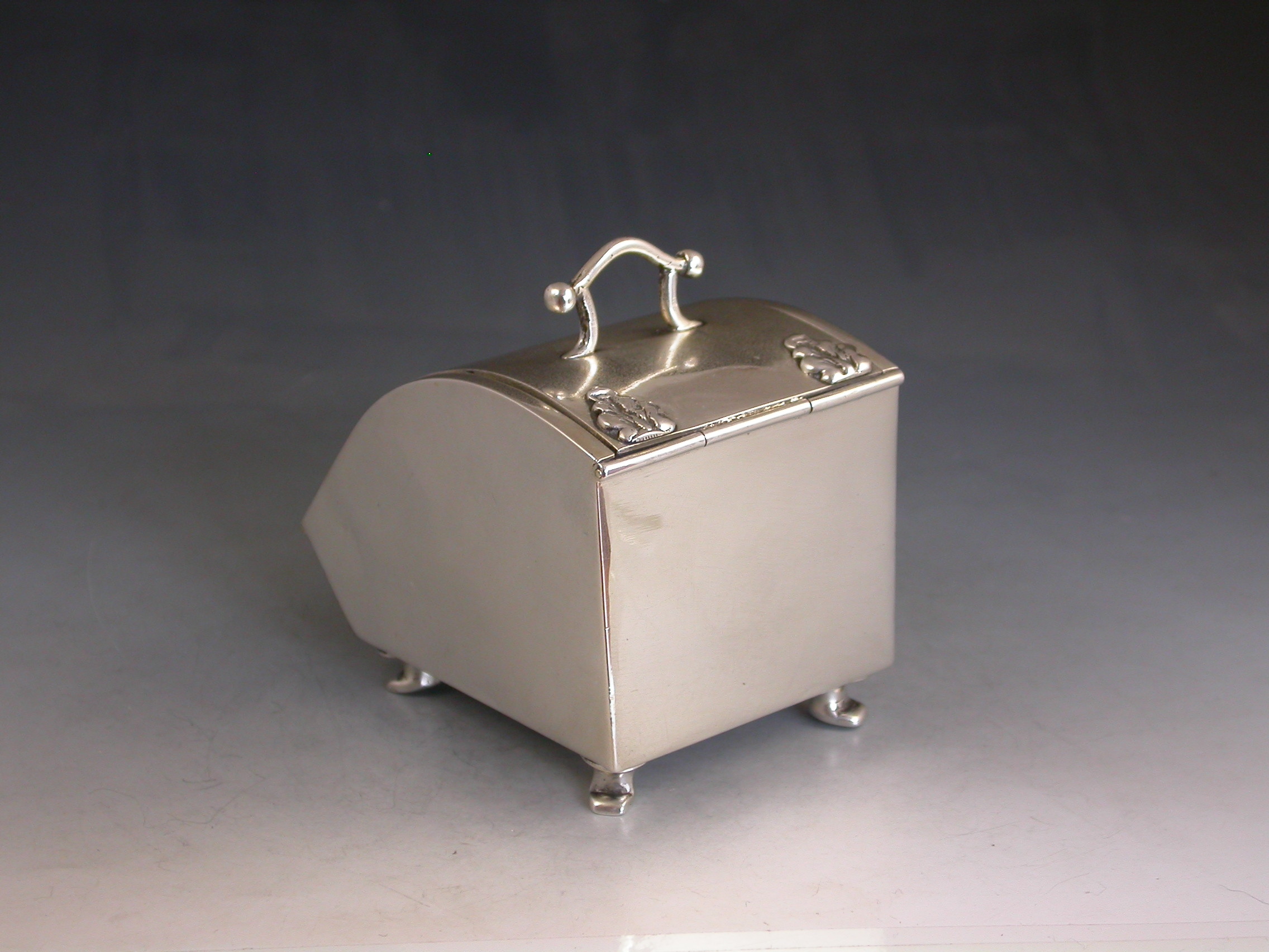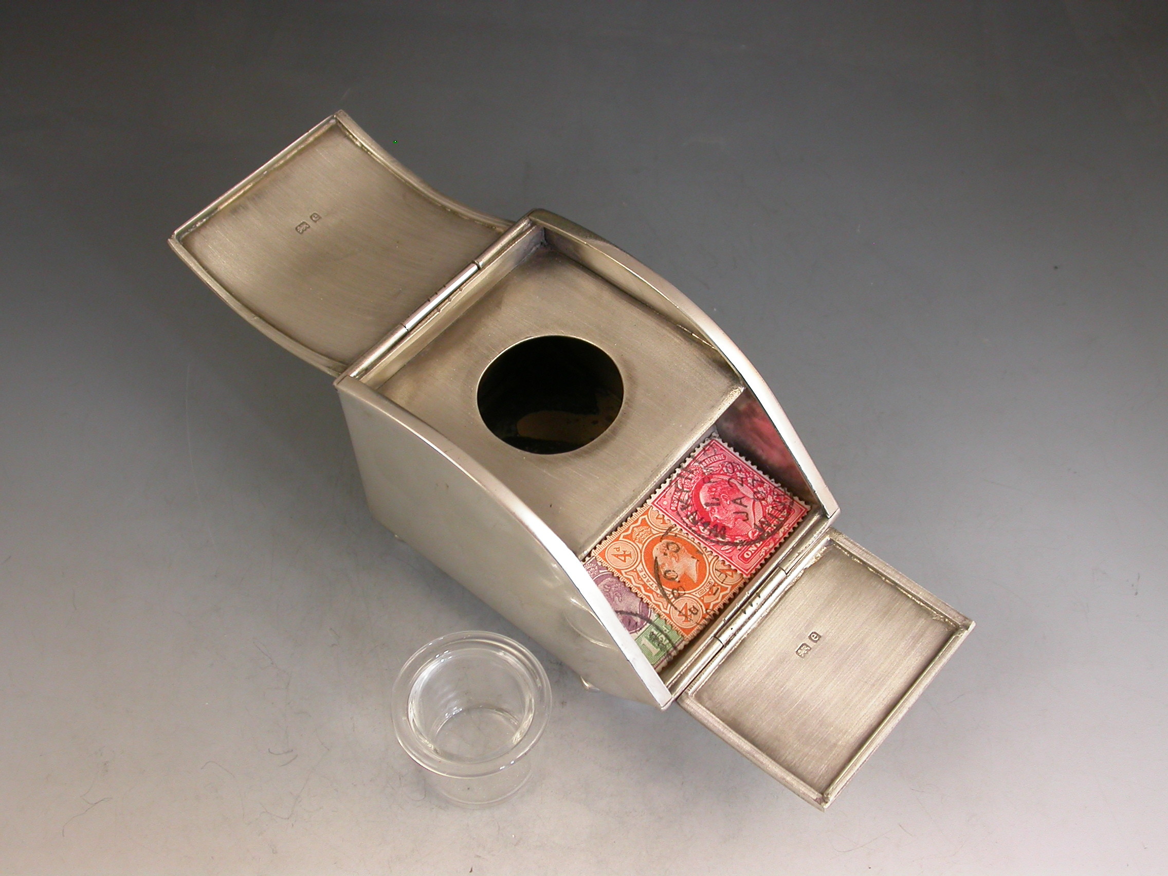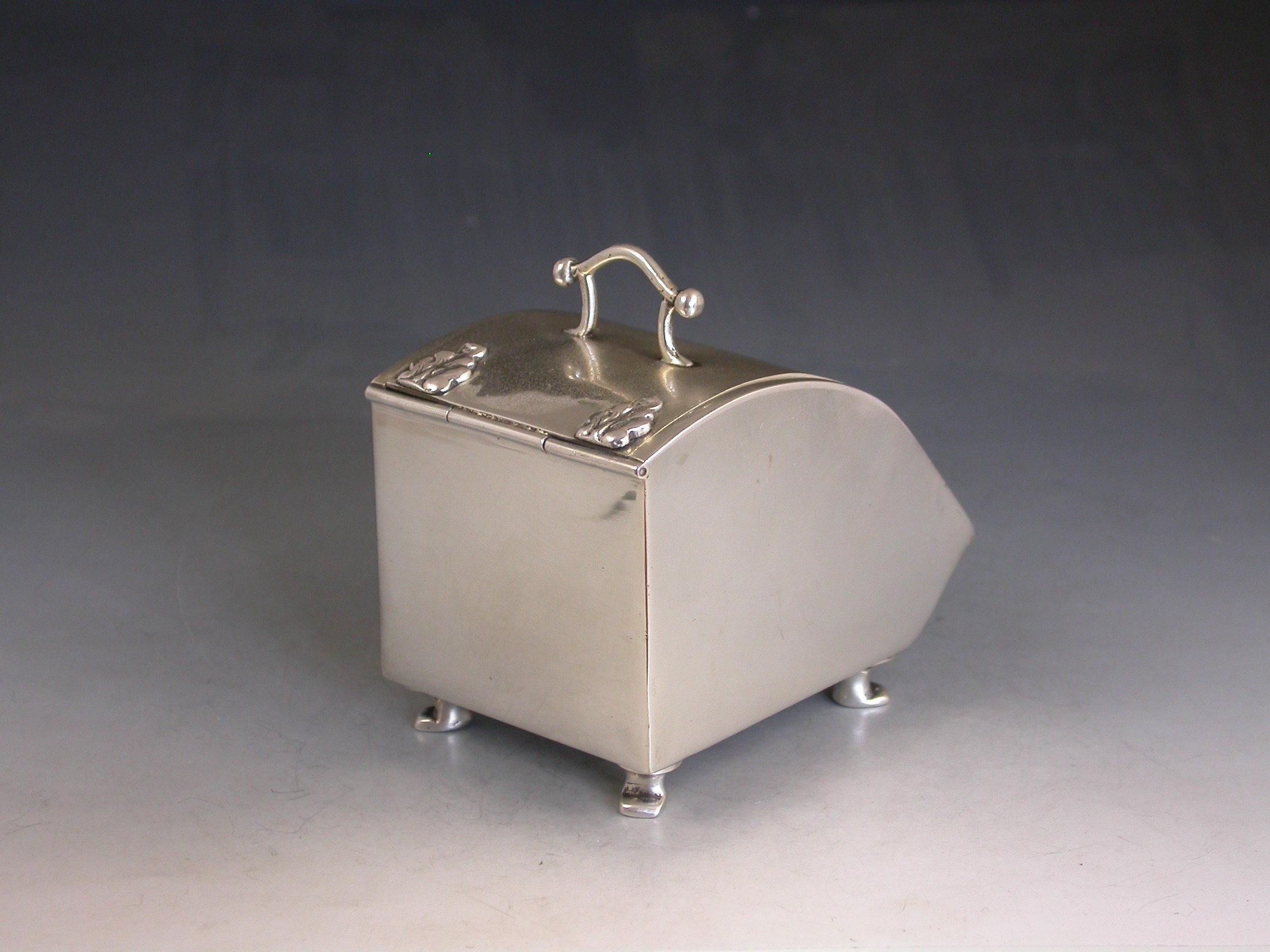A rare Edwardian novelty silver combined Ink Well and Stamp Box made in the form of a Coal Scuttle standing on four paw feet, a hinged lid at the top with applied leaves simulating hinges and opening to reveal a single glass inkwell, another hinged lid at the front also with applied leaves opening to a single slopped stamp compartment.