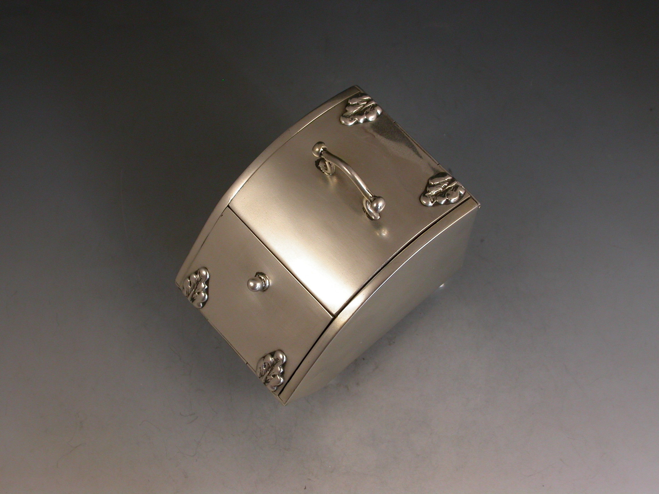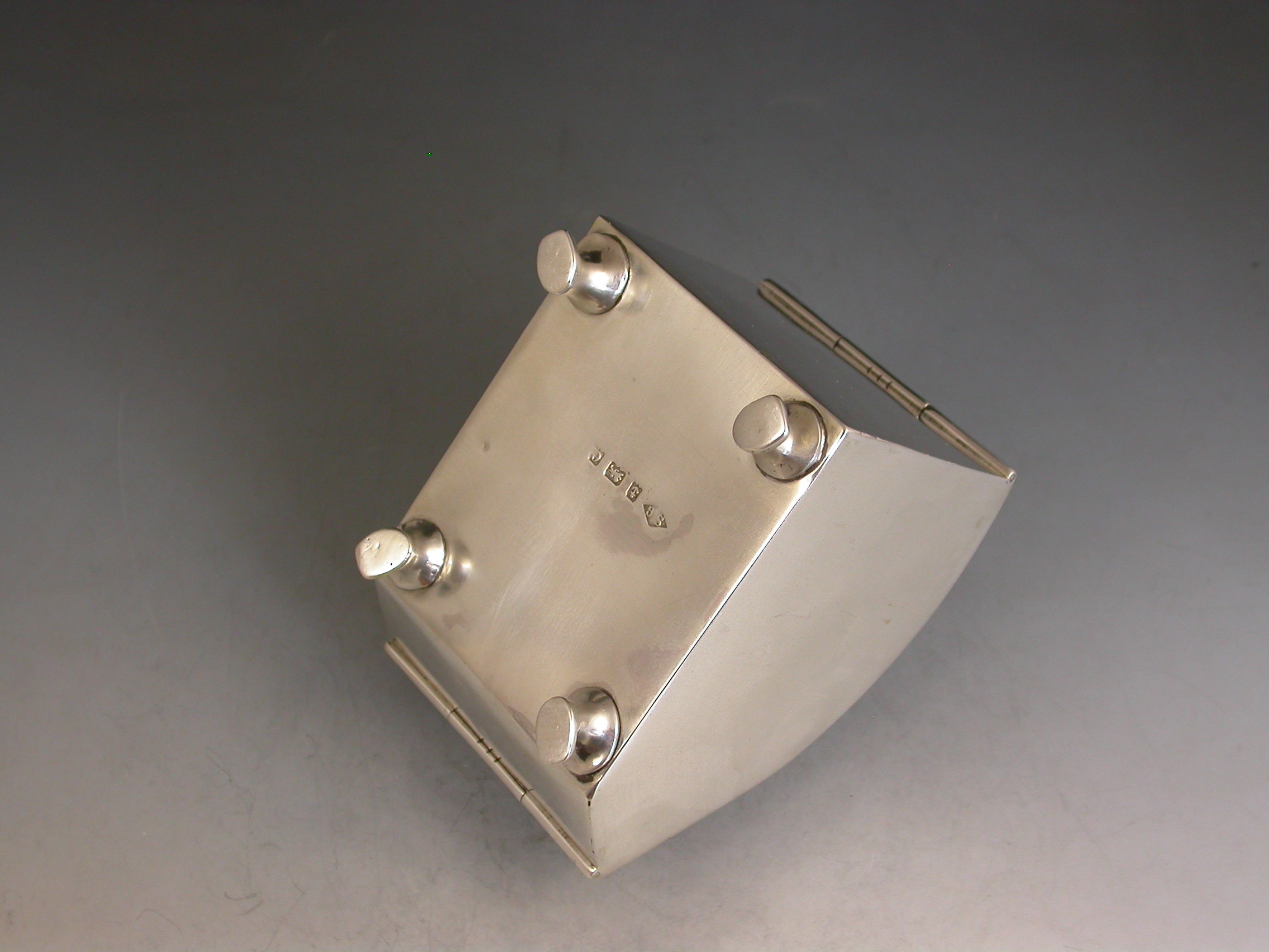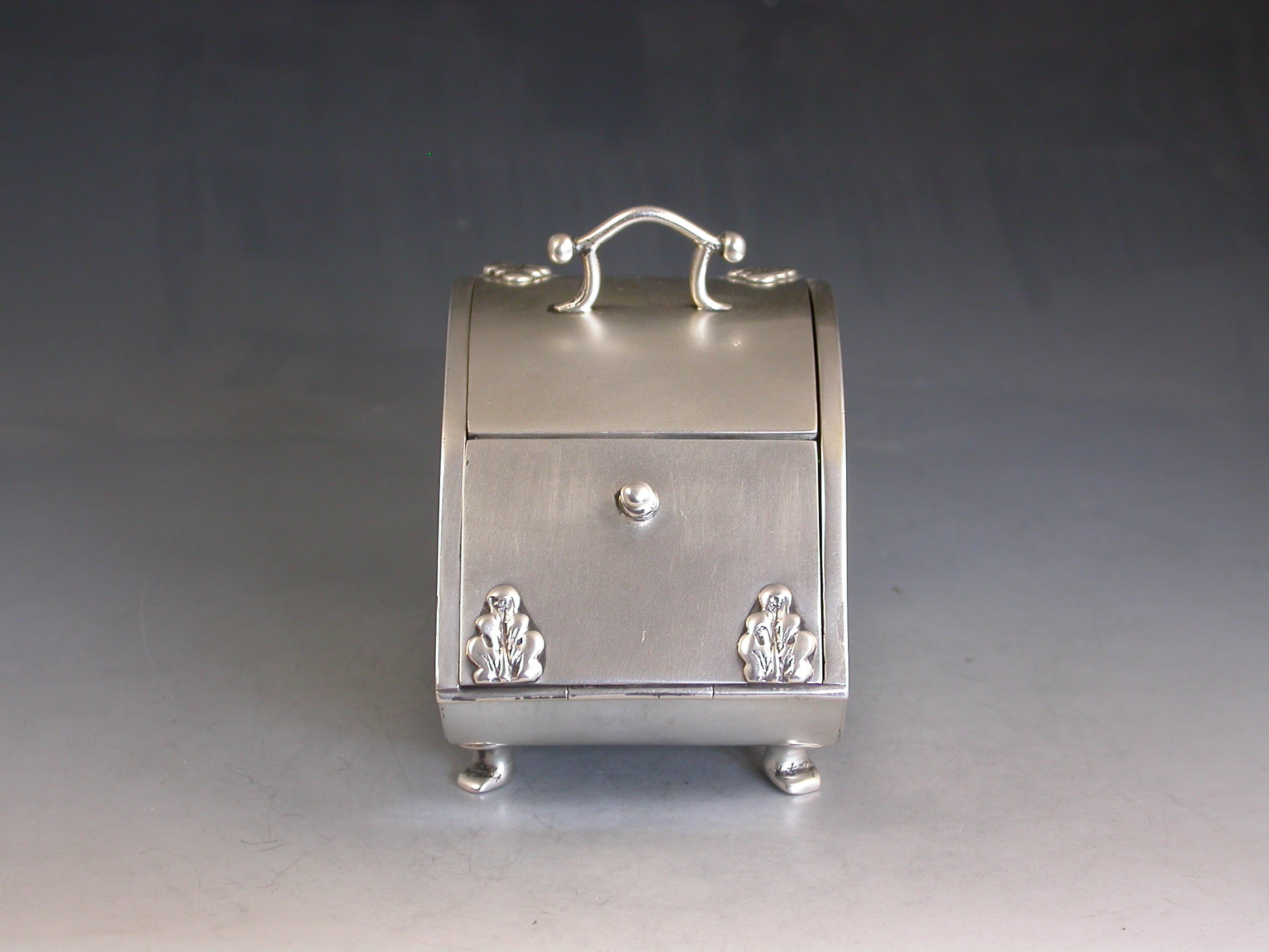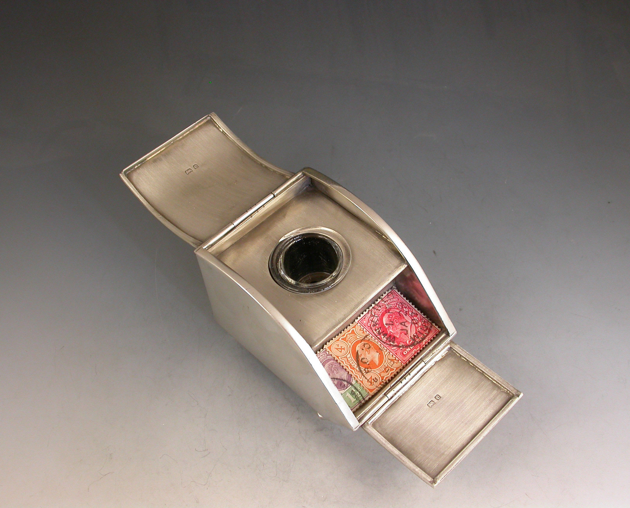 A rare Edwardian novelty silver combined Ink Well and Stamp Box made in the form of a Coal Scuttle standing on four paw feet, a hinged lid at the top with applied leaves simulating hinges and opening to reveal a single glass inkwell, another hinged lid at the front also with applied leaves opening to a single slopped stamp compartment.